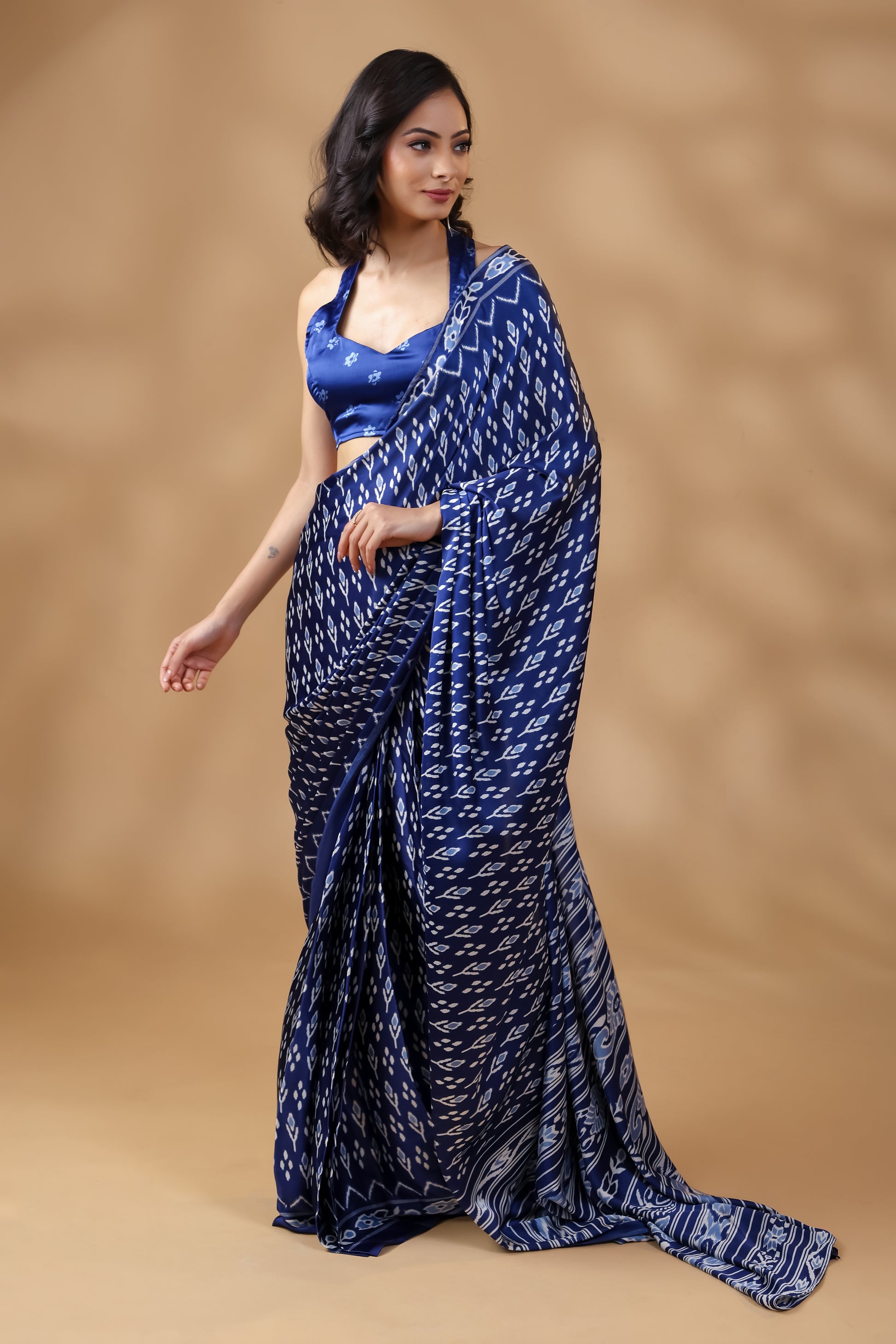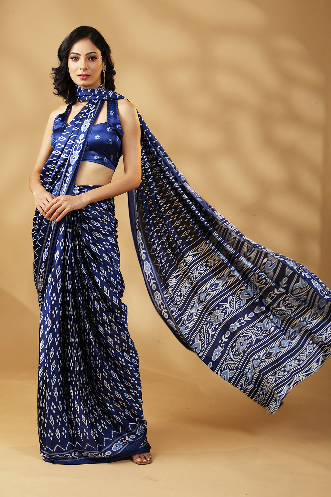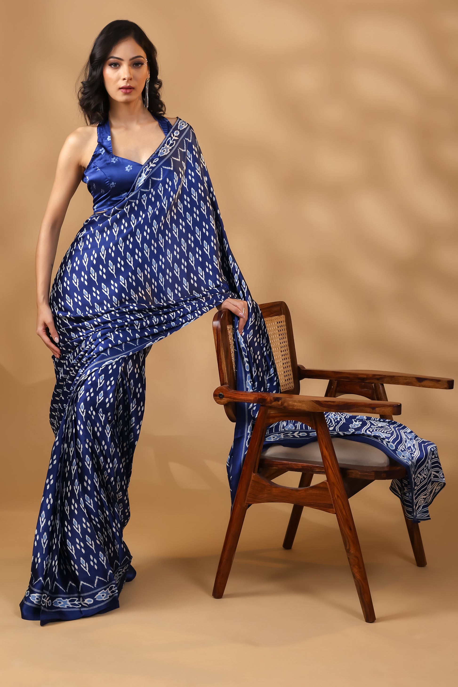 Indigo Whisper Satin Saree in Deep Blue Hues with Unstitched Blouse