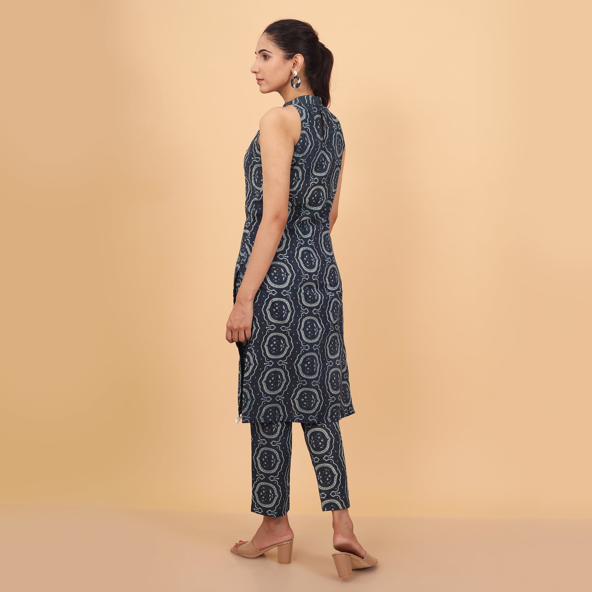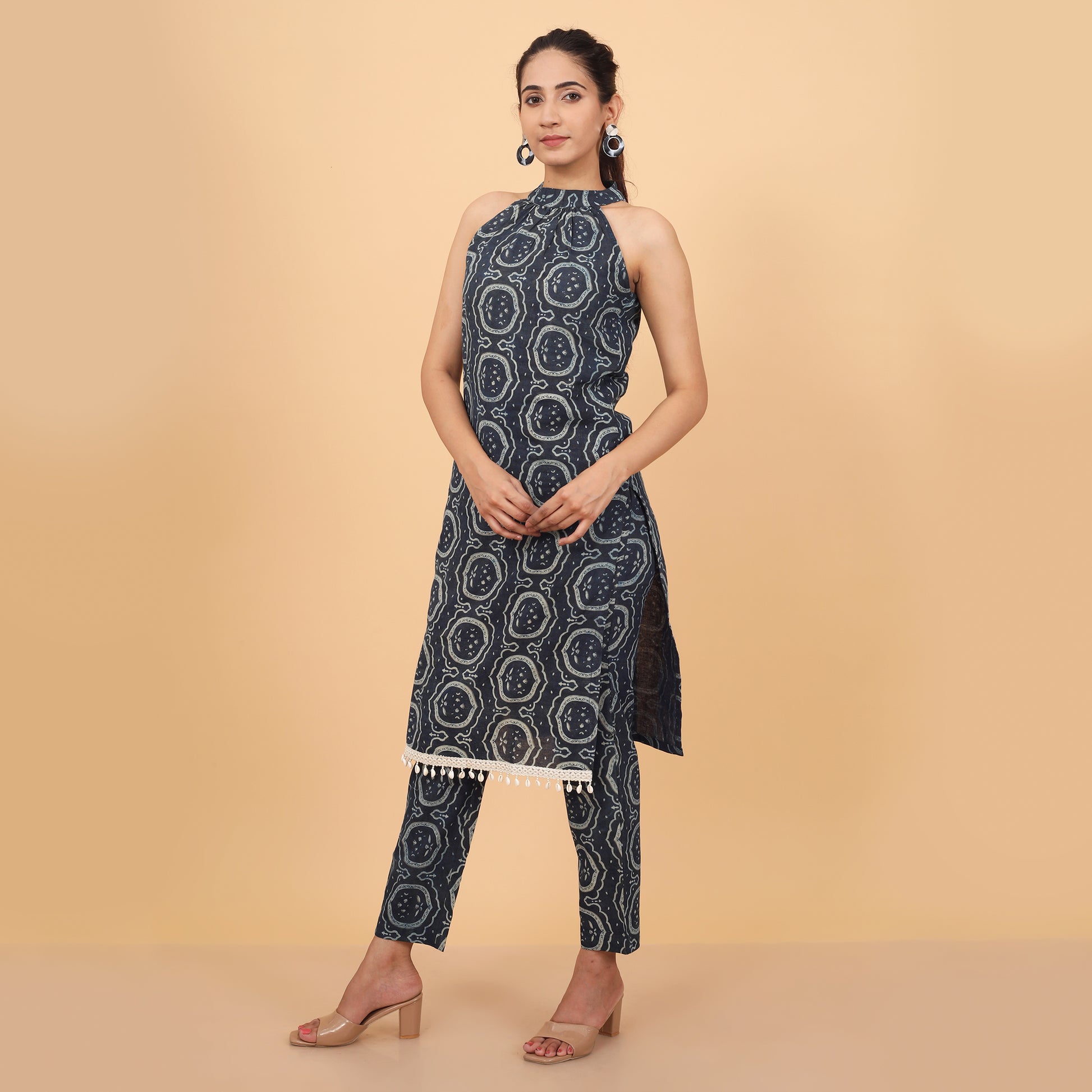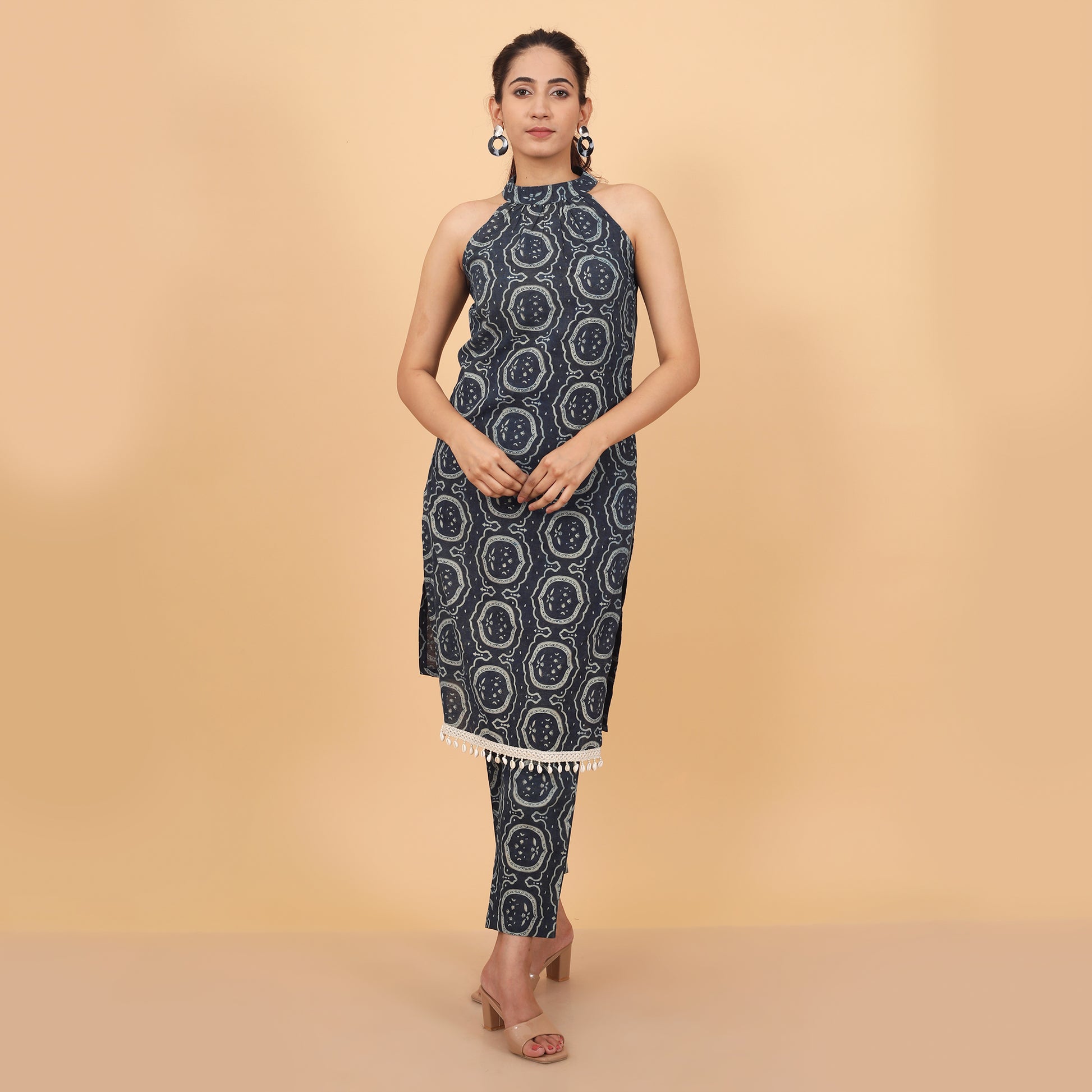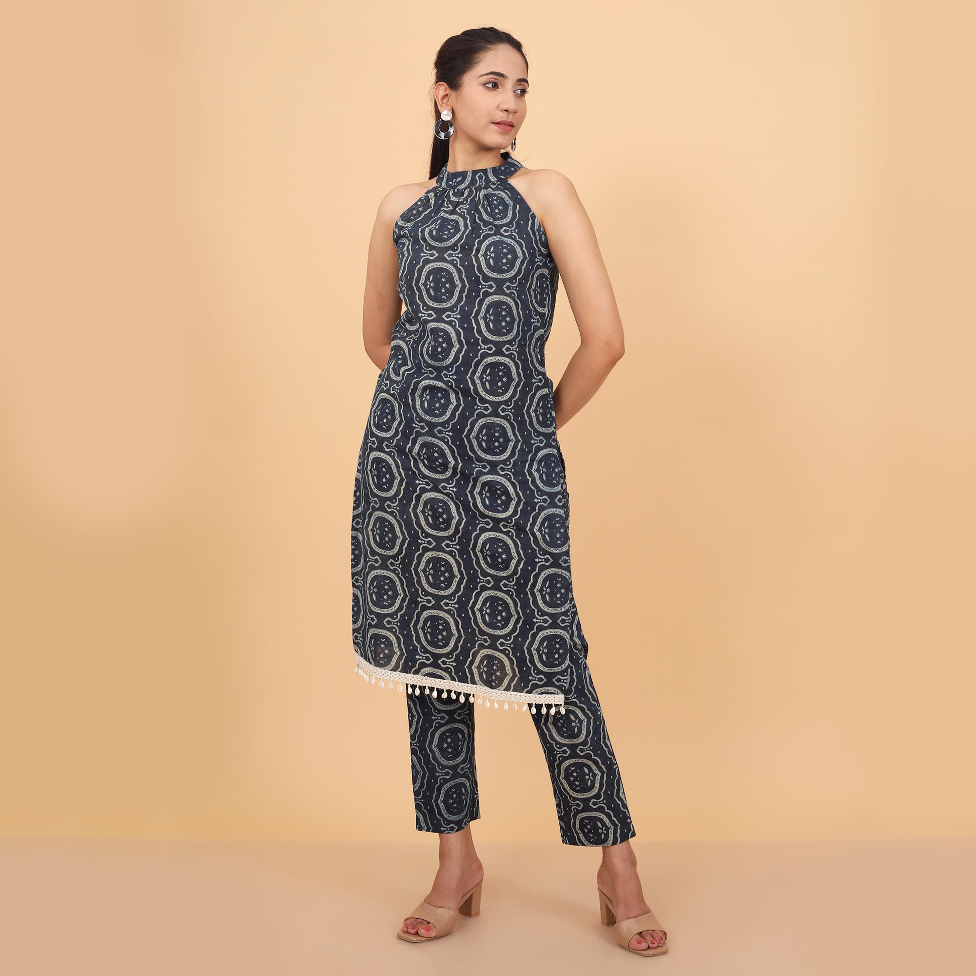 This cotton halter neck kurta and pant set showcases a vibrant ethnic print with delicate shell lace accents. Perfect for summer, it combines traditional charm with modern style, offering a comfortable and eye-catching outfit for any occasion.