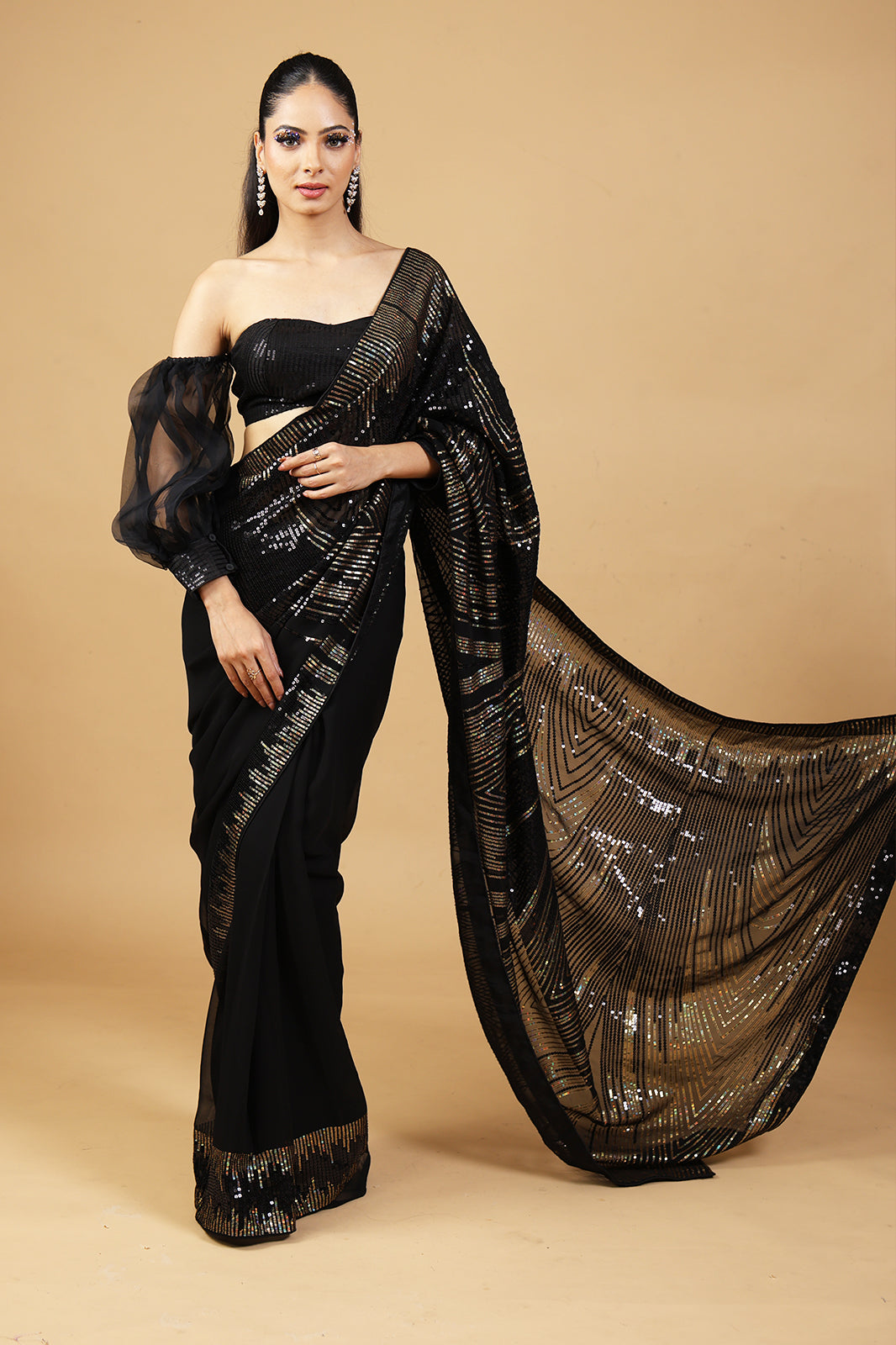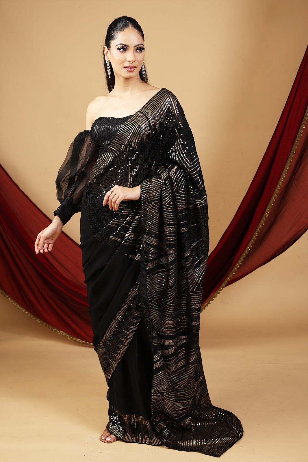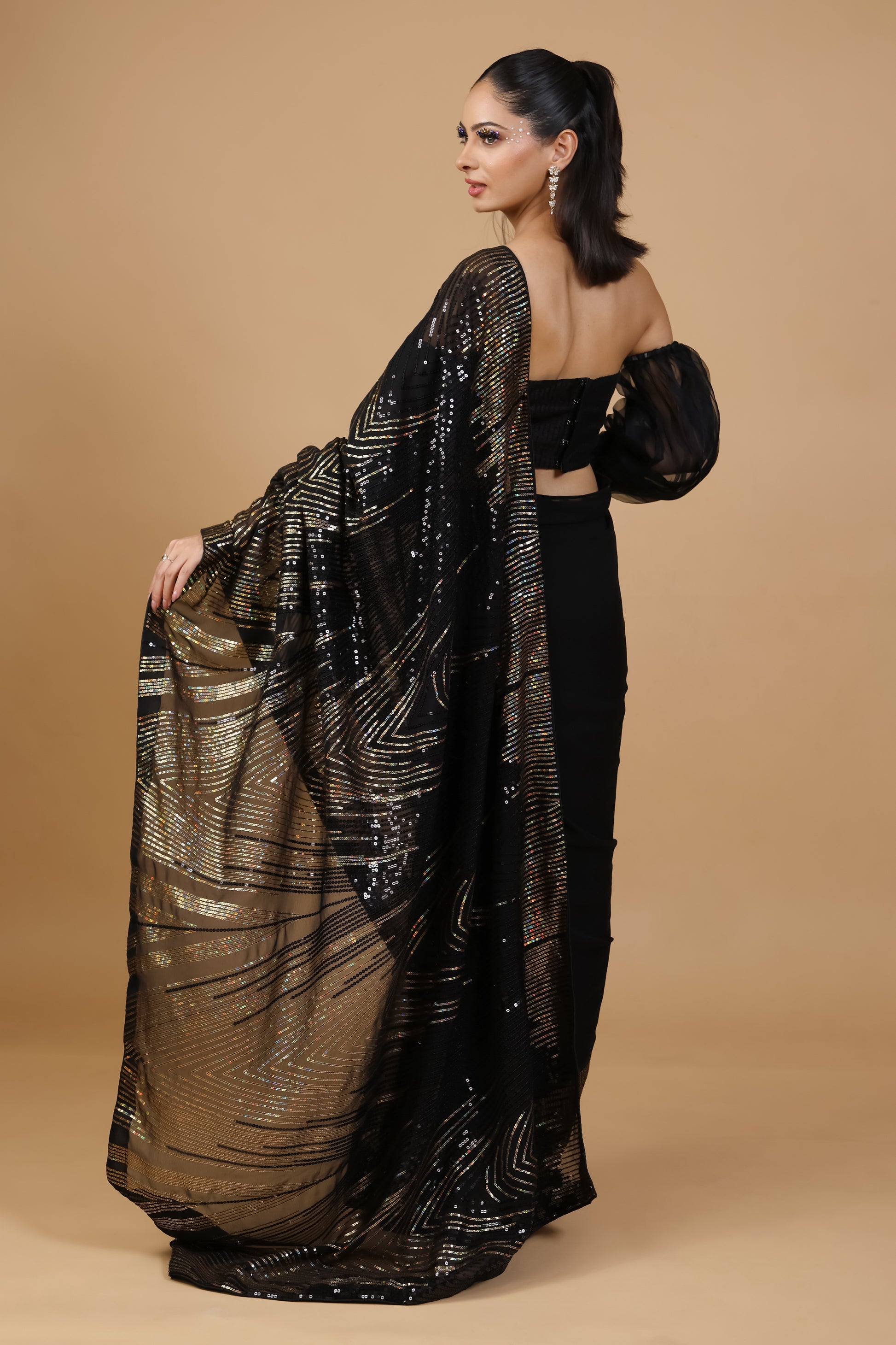Midnight Sparkle Black & Gold Sequin Party Saree with Unstitched Blouse