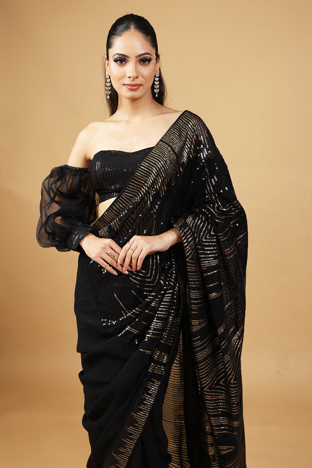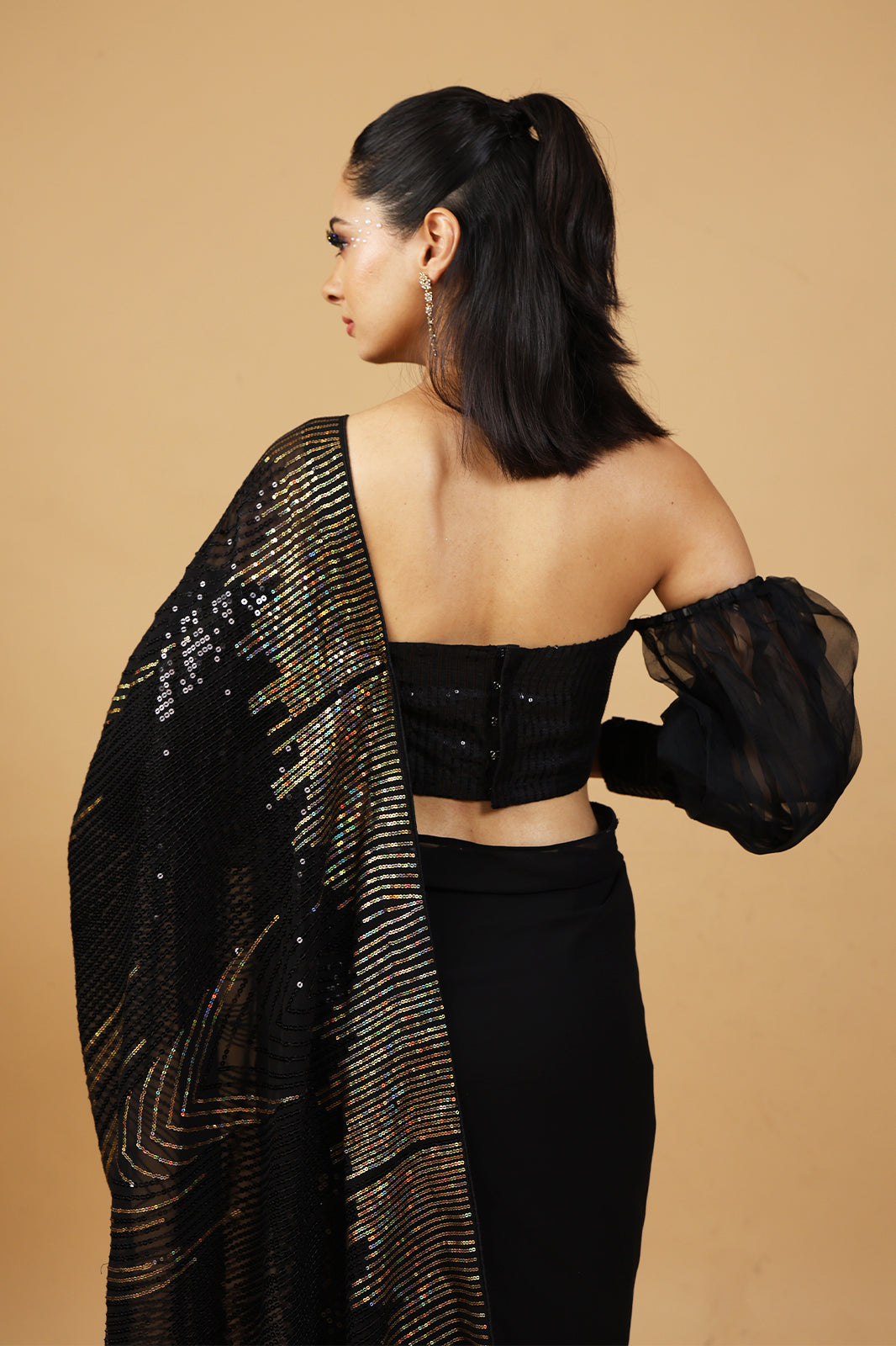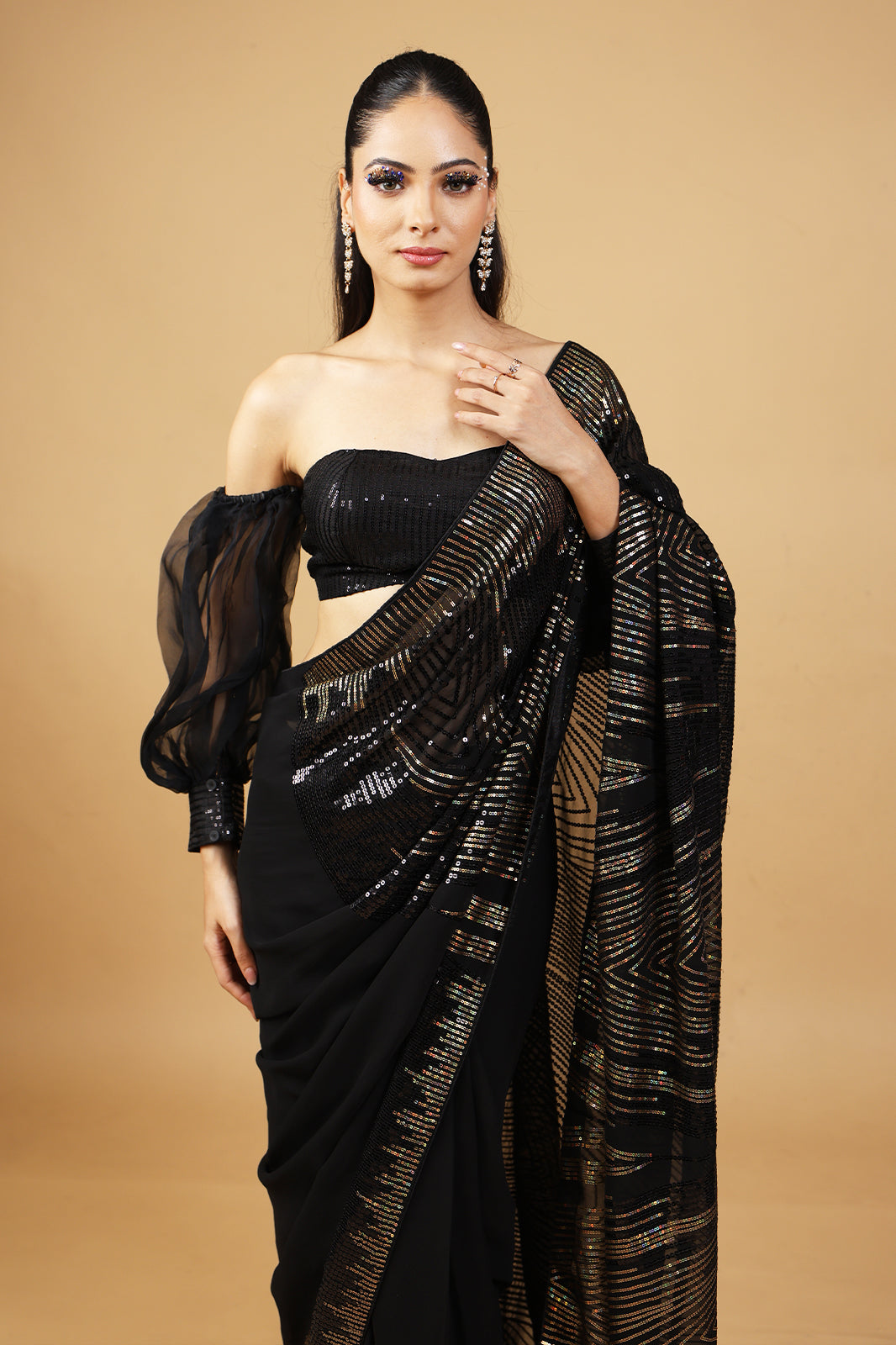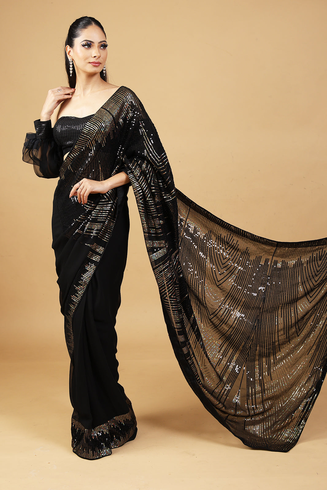 Midnight Sparkle Black & Gold Sequin Party Saree with Unstitched Blouse