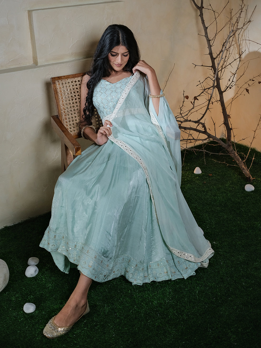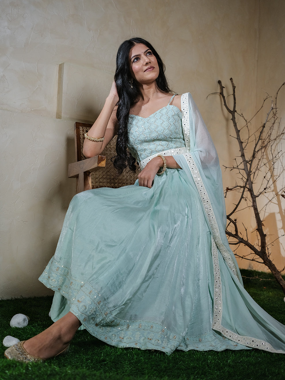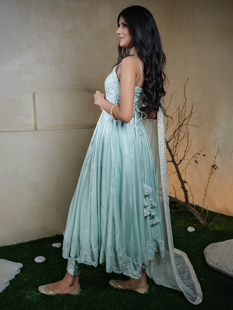 Mint Green Chikankari Embroidered Anarkali Set with Dupatta & Belt