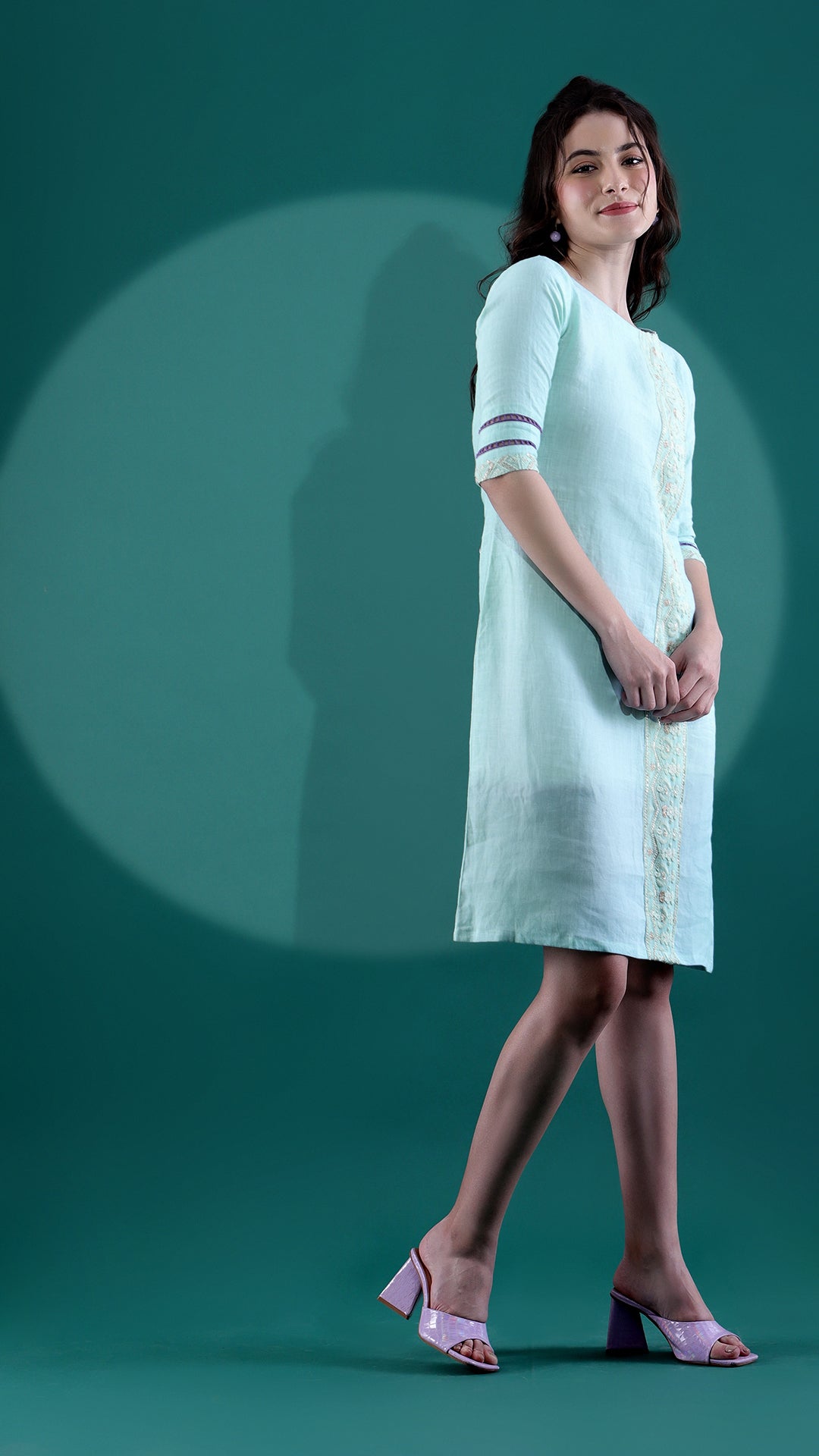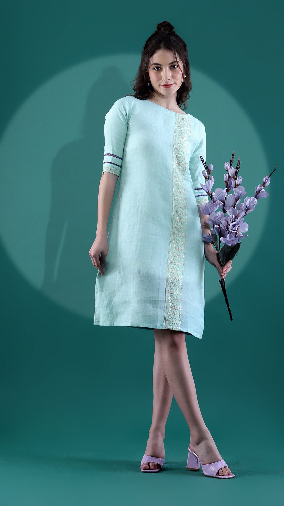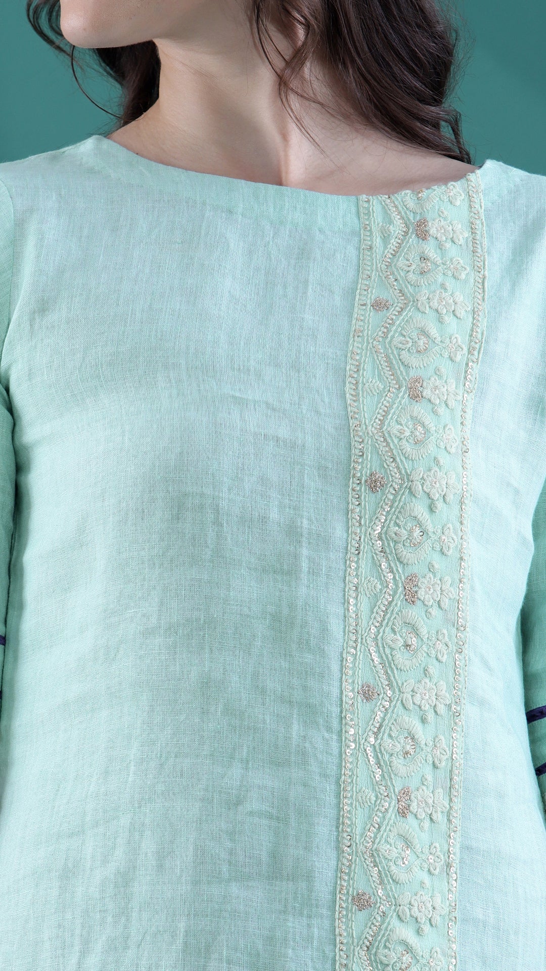 This linen dress with a dewy mint color is a casual throw off you can wear in many different ways. The chikankari border detailing at the front adds to the nature of the dress. To add on to the creativity, elbow sleeves with lace detailing at the bottom have a suitable impact on the wide boat neck.