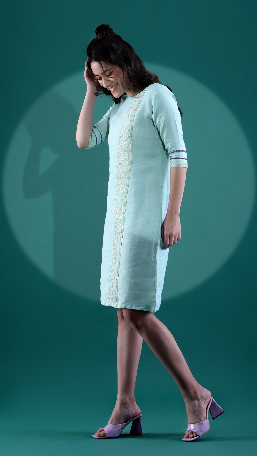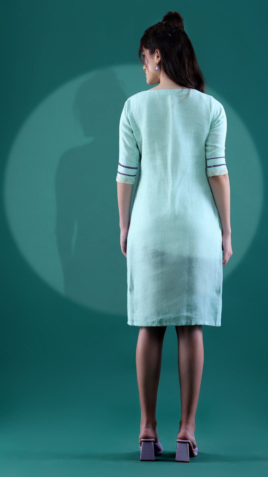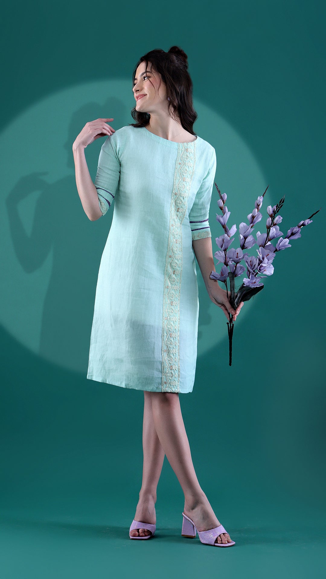 This linen dress with a dewy mint color is a casual throw off you can wear in many different ways. The chikankari border detailing at the front adds to the nature of the dress. To add on to the creativity, elbow sleeves with lace detailing at the bottom have a suitable impact on the wide boat neck.