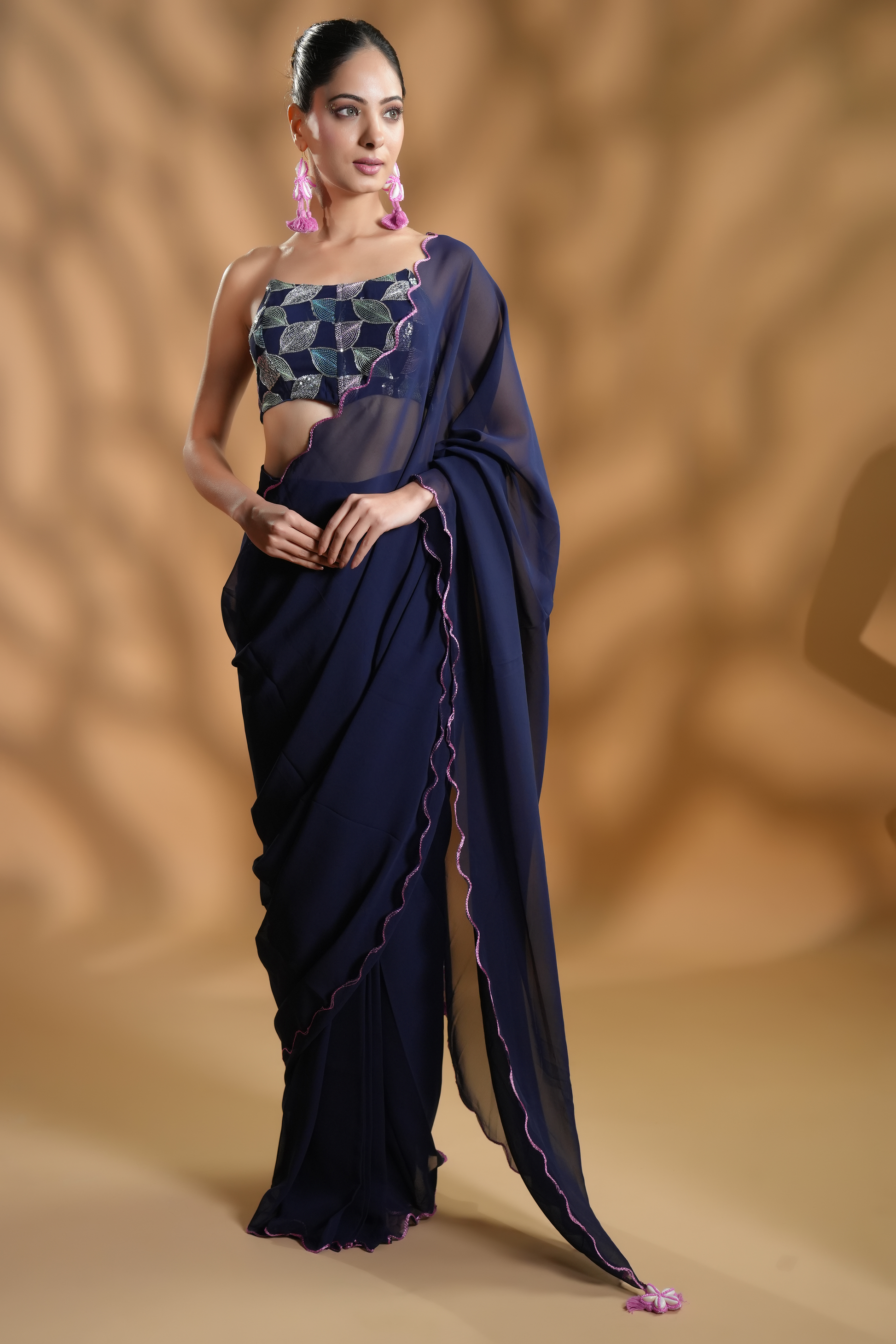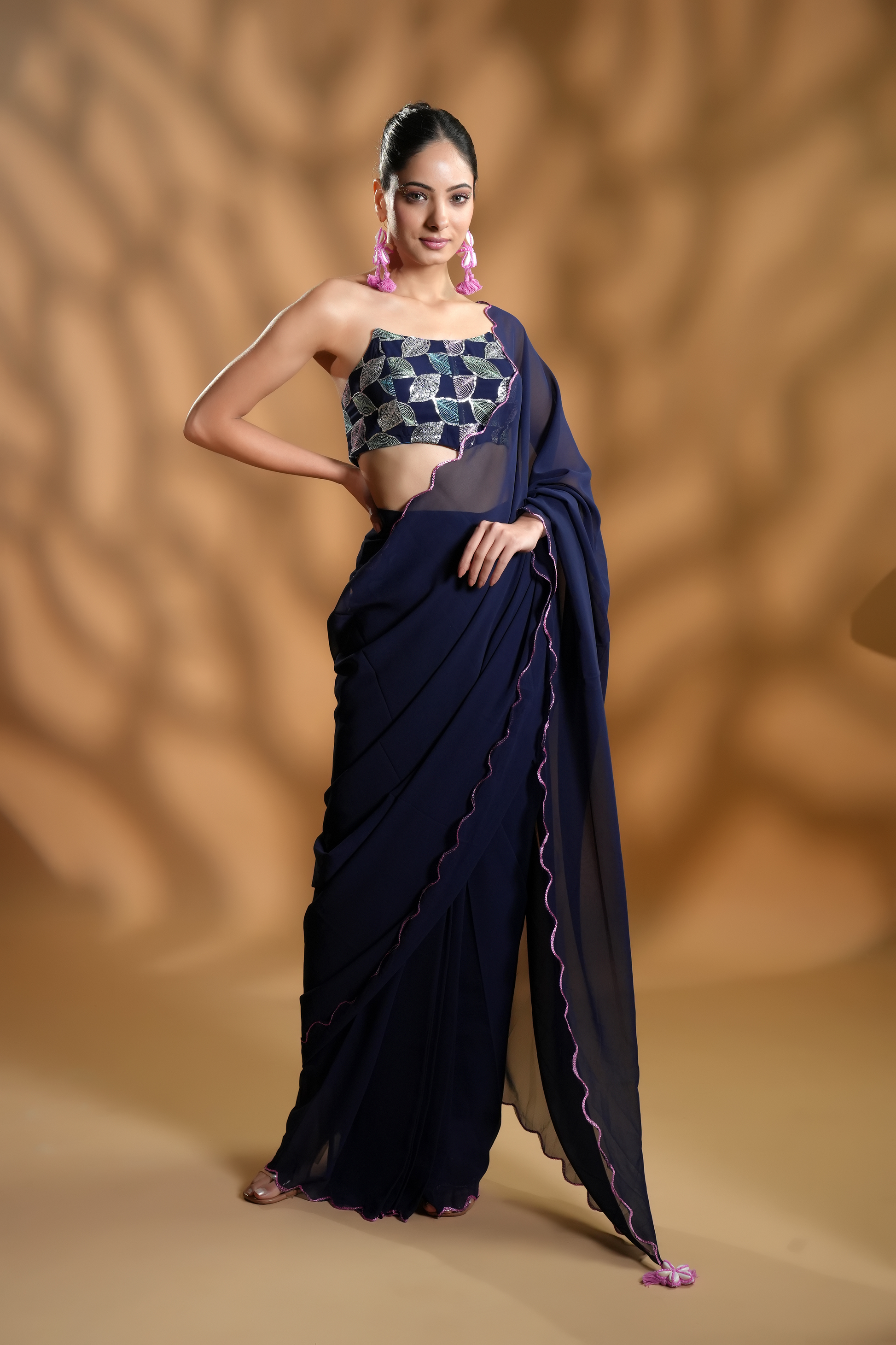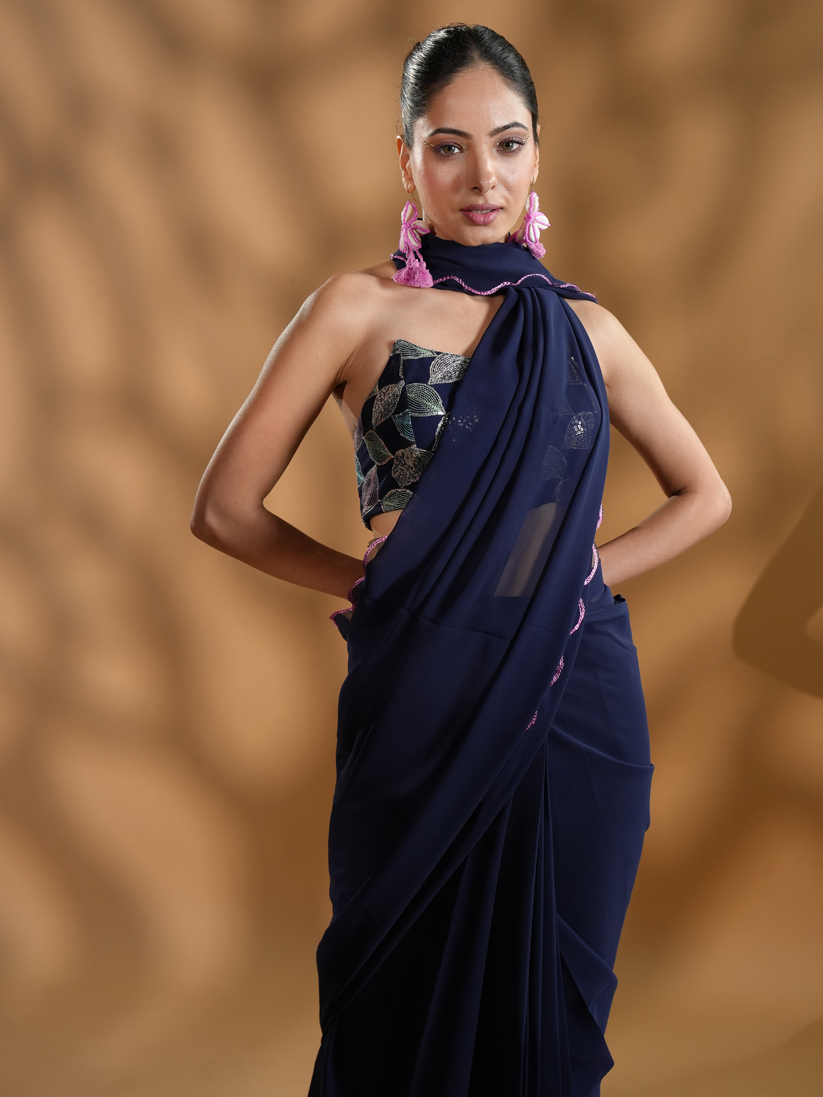 Navy Blue Premium Ready-to-Wear Saree With Embroidered Blouse Fabric