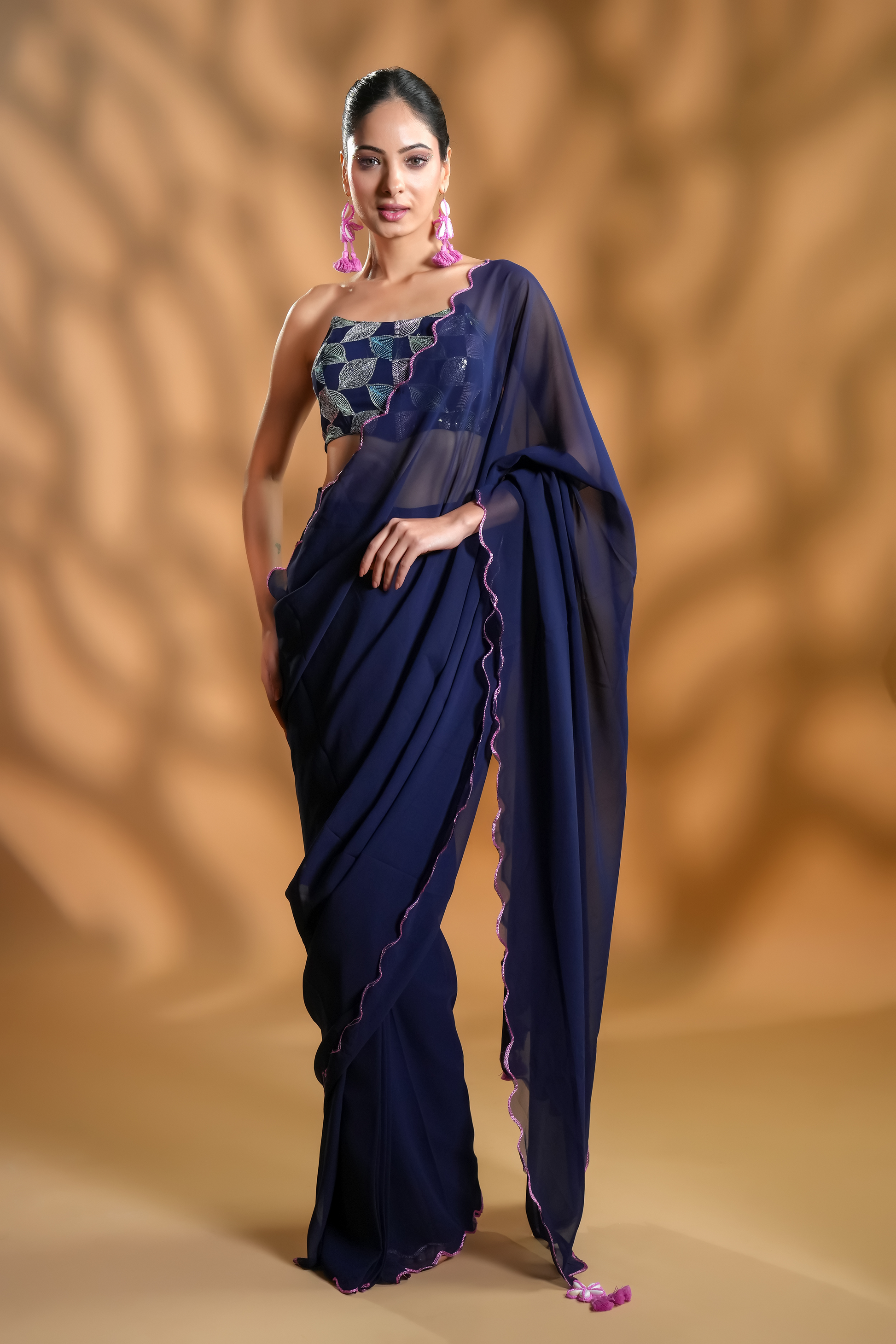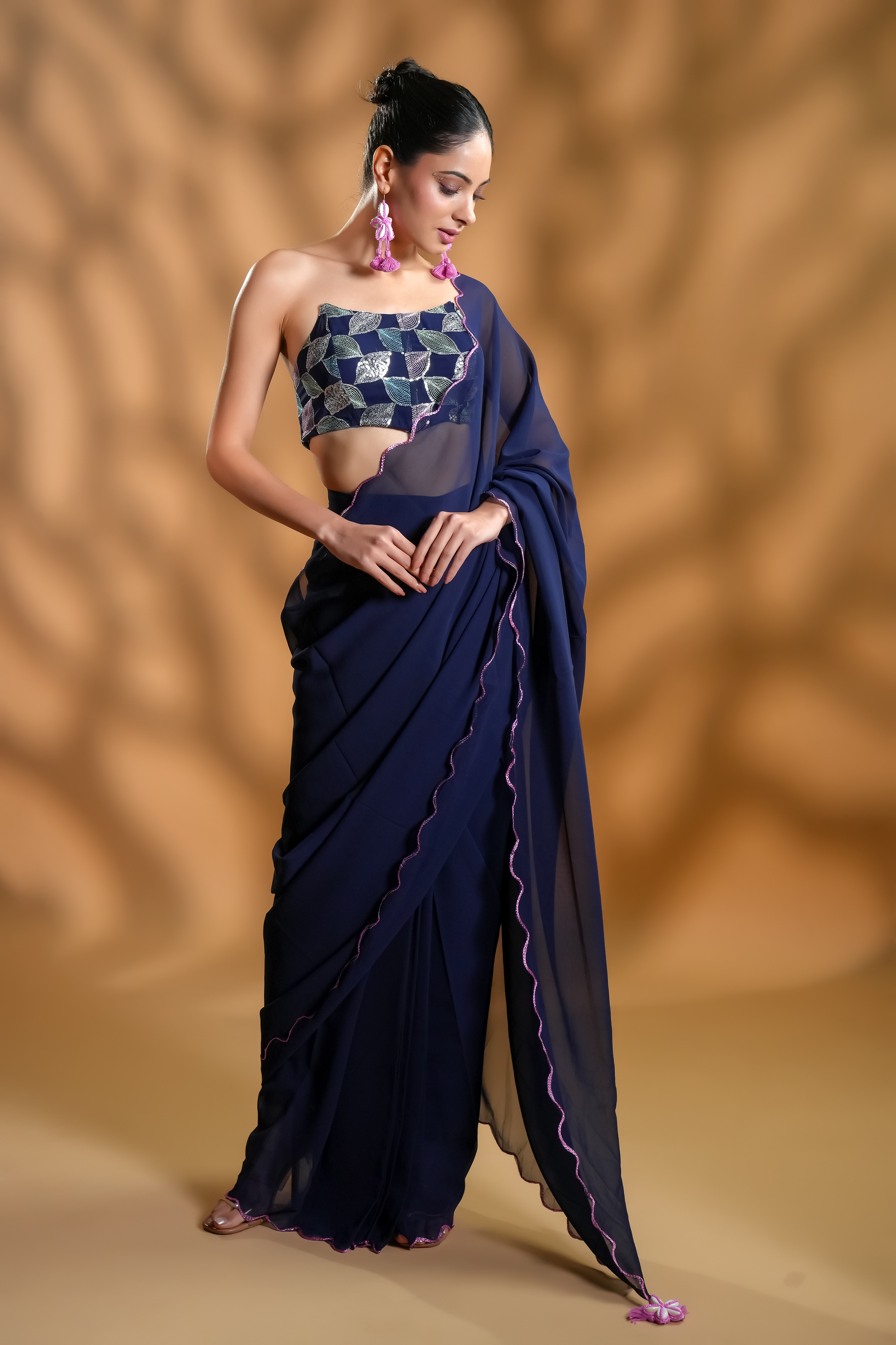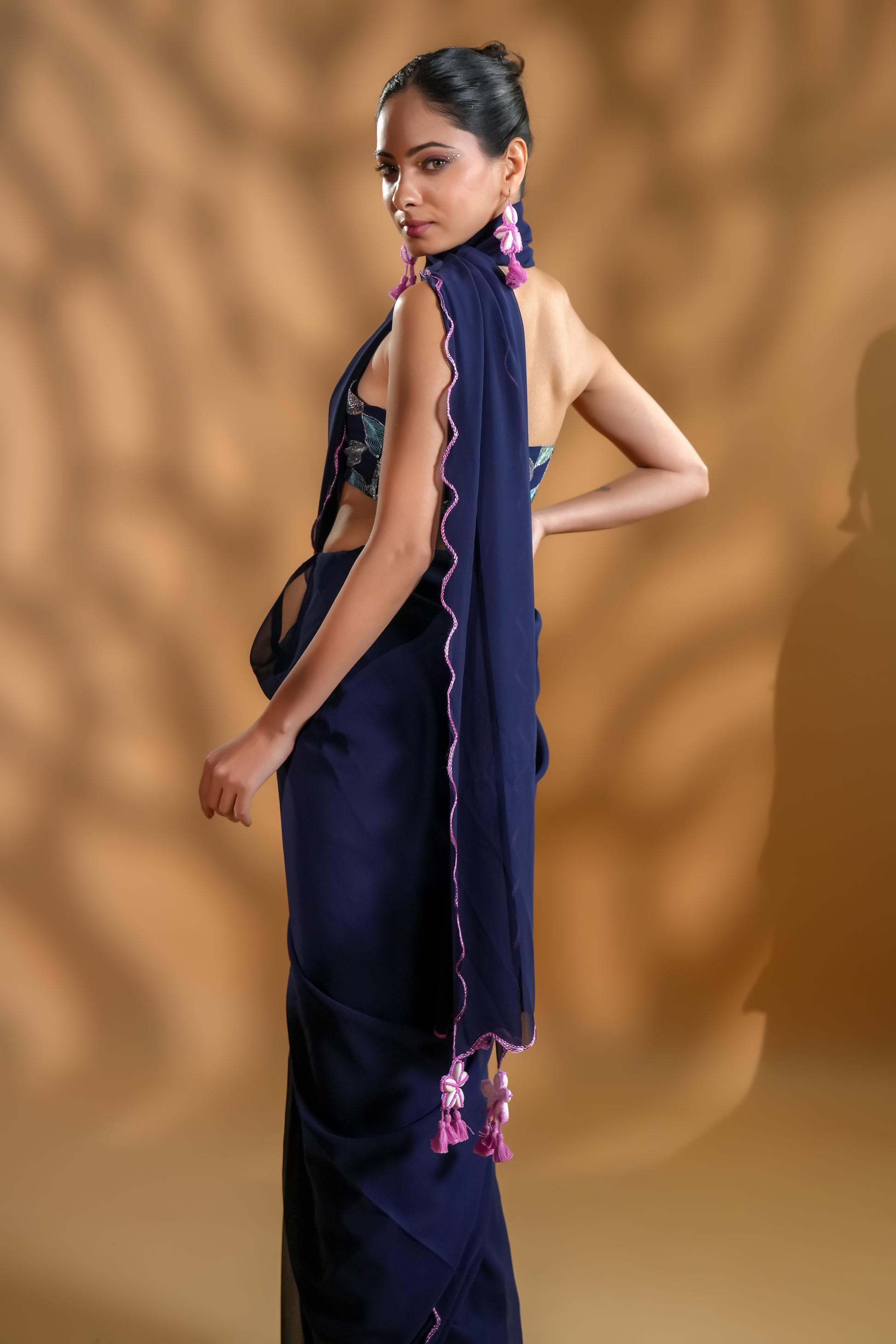 Navy Blue Premium Ready-to-Wear Saree With Embroidered Blouse Fabric
