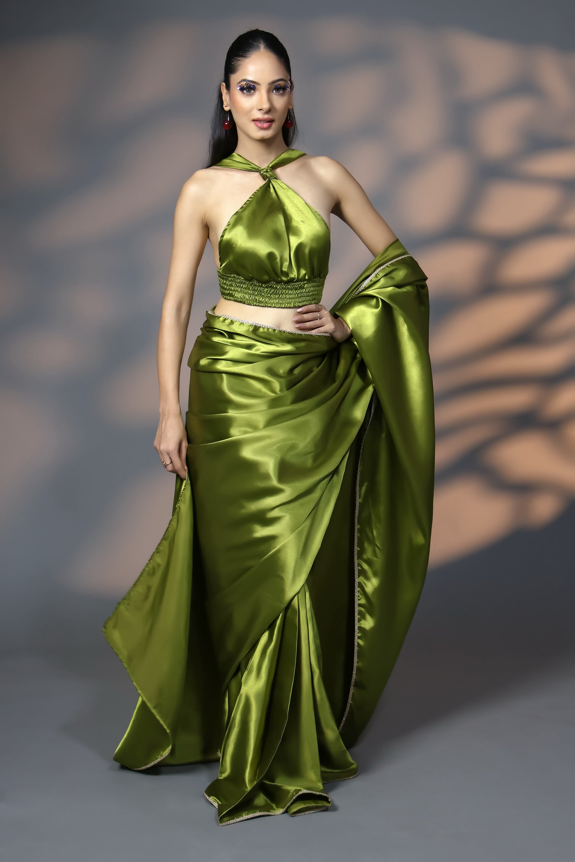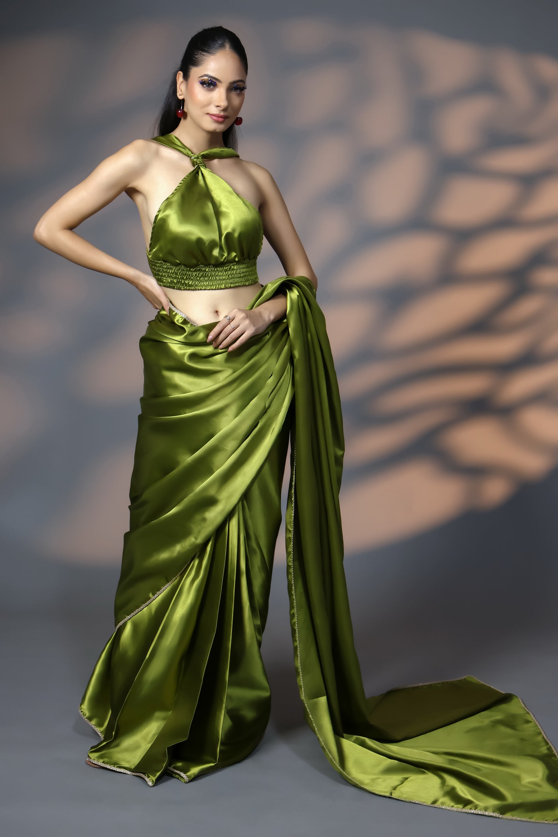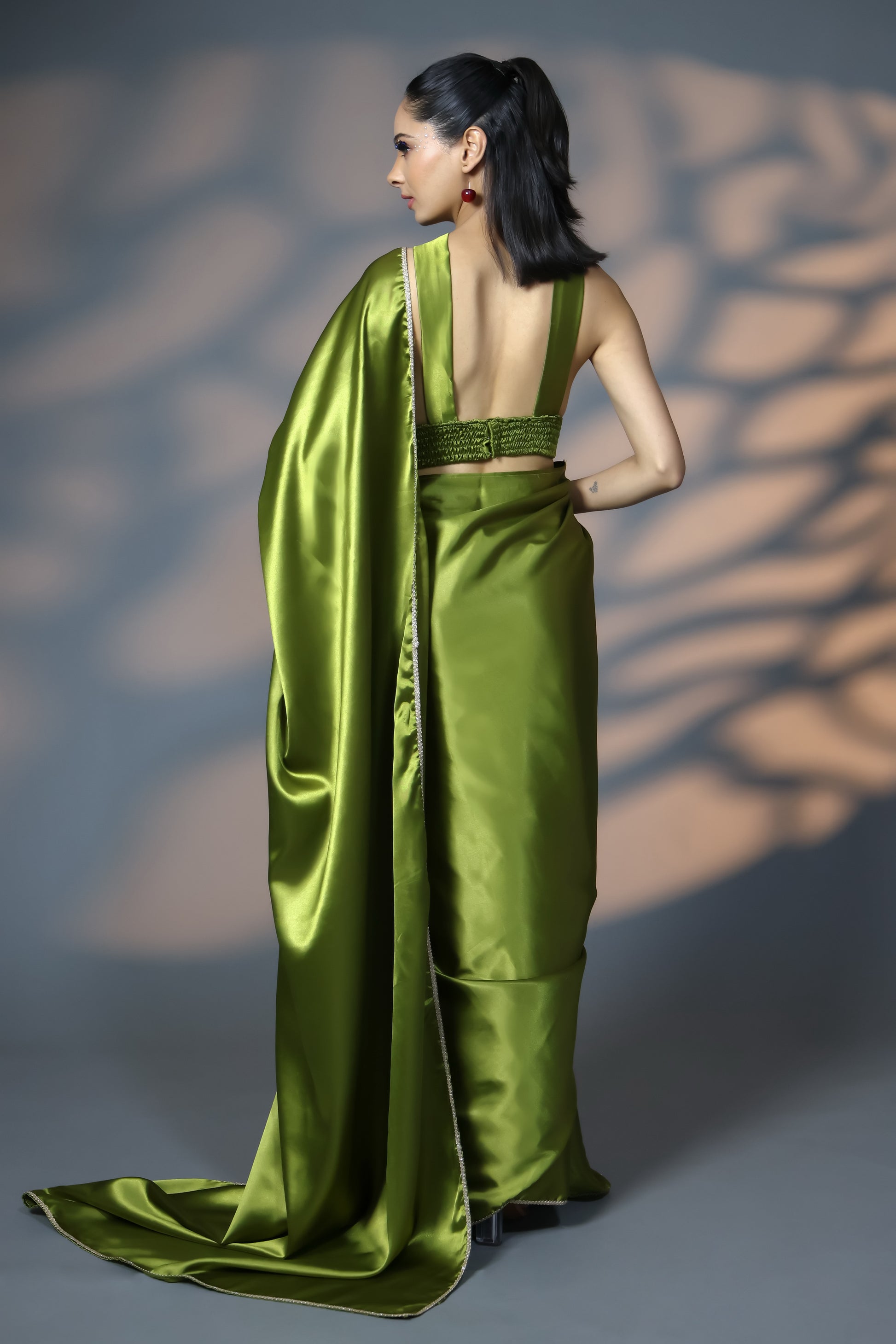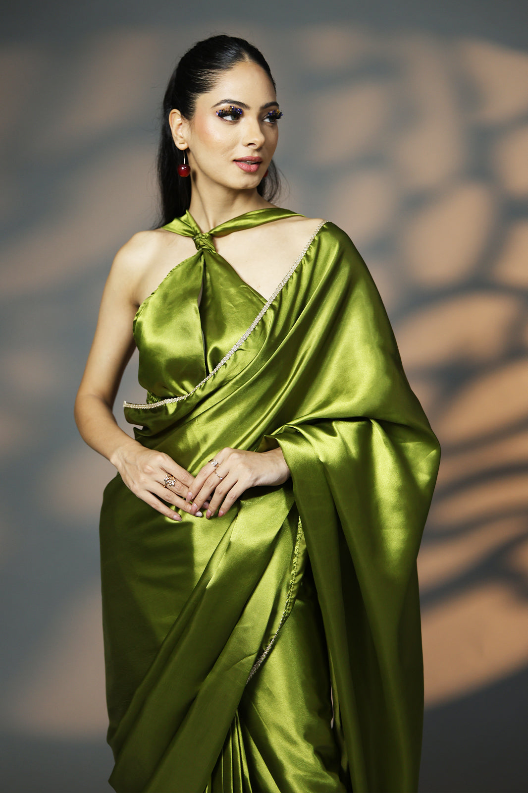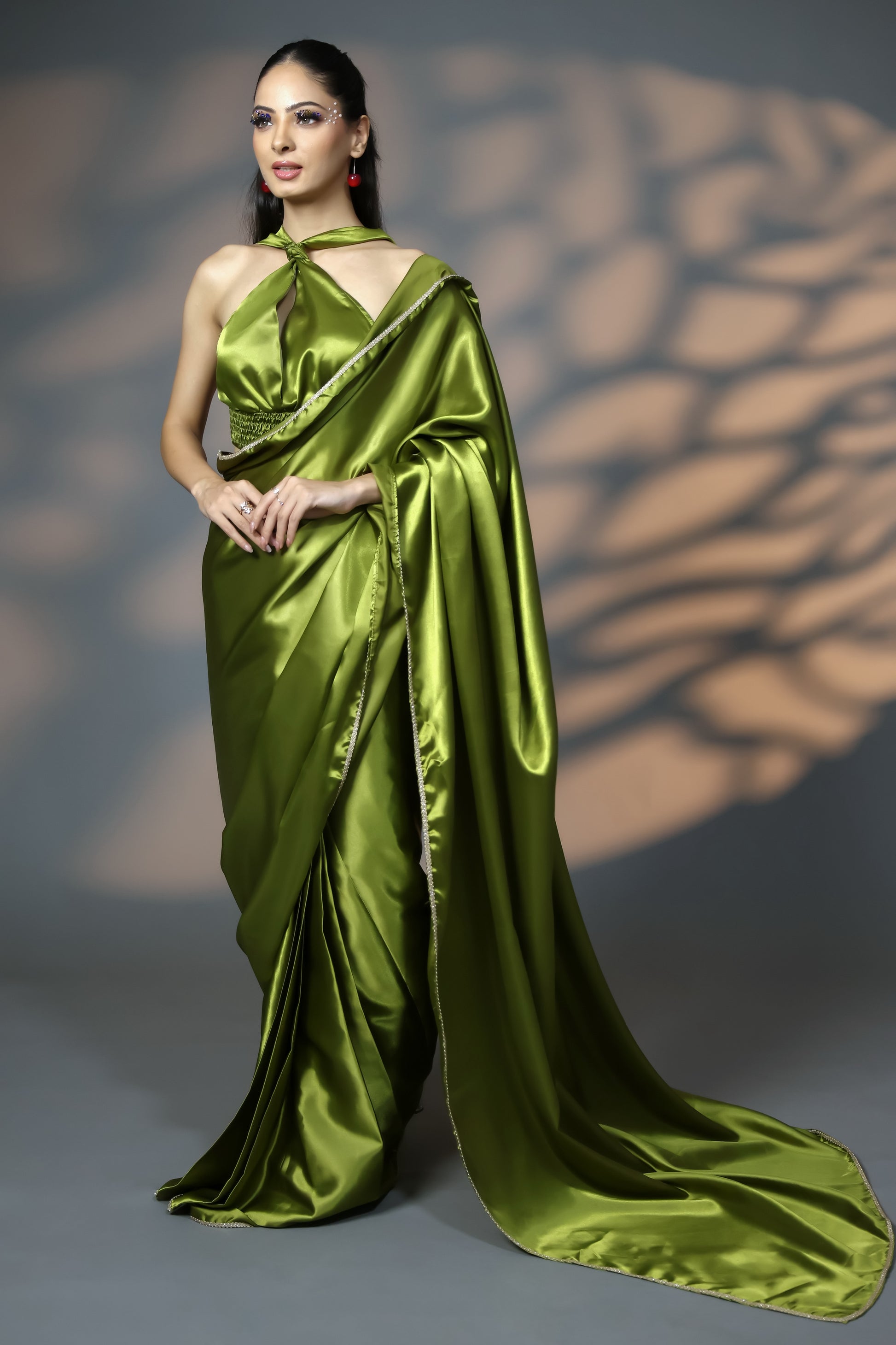 Olive Gold Luxe Satin Saree with Golden Embellishments and Blouse Fabric