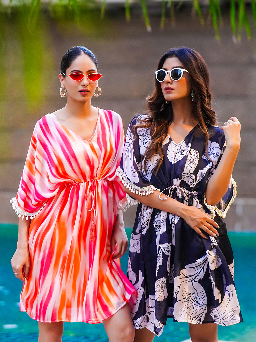 Stand out in the crowd and get infinite compliments in this black and white short floral kaftan. May it be for lunching or just a coffee date; you can adorn this satin dress and look classy. The V-neckline and gathering near the waistline makes this stunning kaftan a must-have for your wardrobe. Moreover, the cotton lining gives comfort and ease to the wearer.