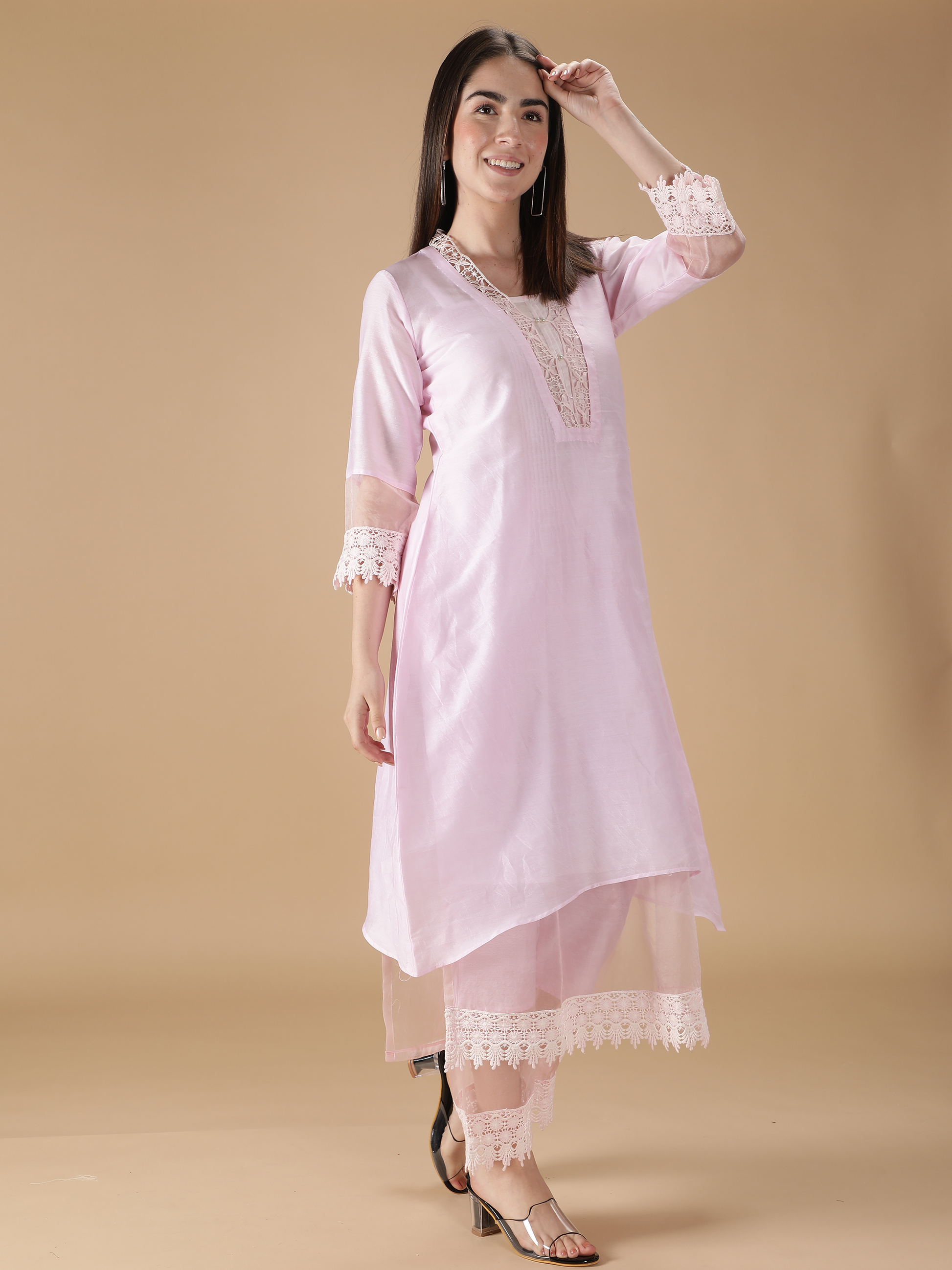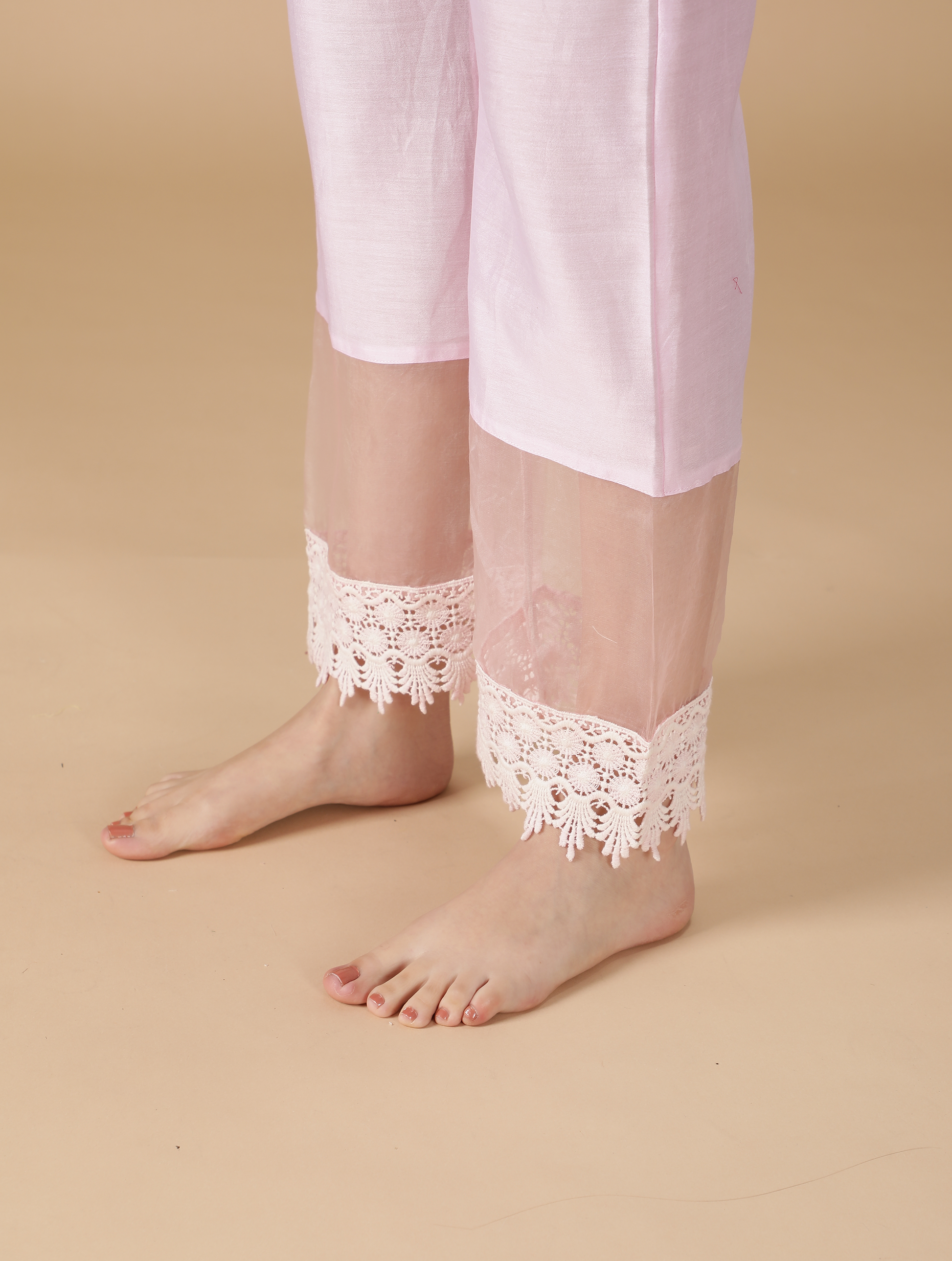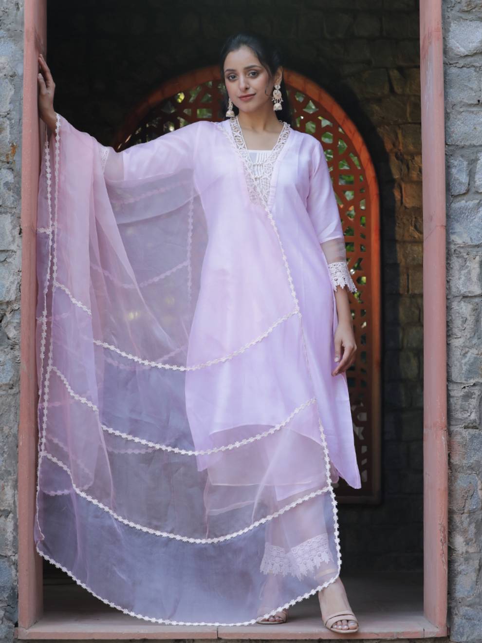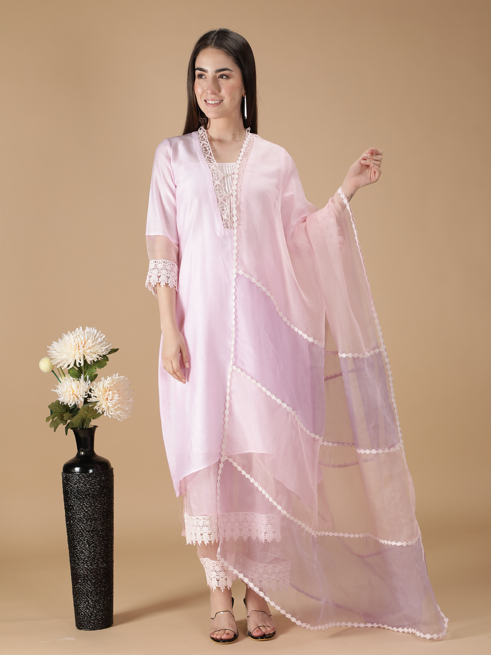 Get ready to steal the show! This premium quality silk chanderi pink kurta flaunts a V-shaped neckline decorated with cotton laces and lining. The three-quarter sleeves are crafted with pure silk organza with cotton laces at the bottom. The pants are crafted out of organza fabric and cotton laces at the hem. The Dupatta is the show stealer of this suit set made out of pure silk organza fabric. The pink and lilac double shade dupatta with cottonŒælaces redefines the definition of style. Cotton laces weave magic by separating the shades of pink and lilac. Thereäó»s nothing better than this one.Œæ