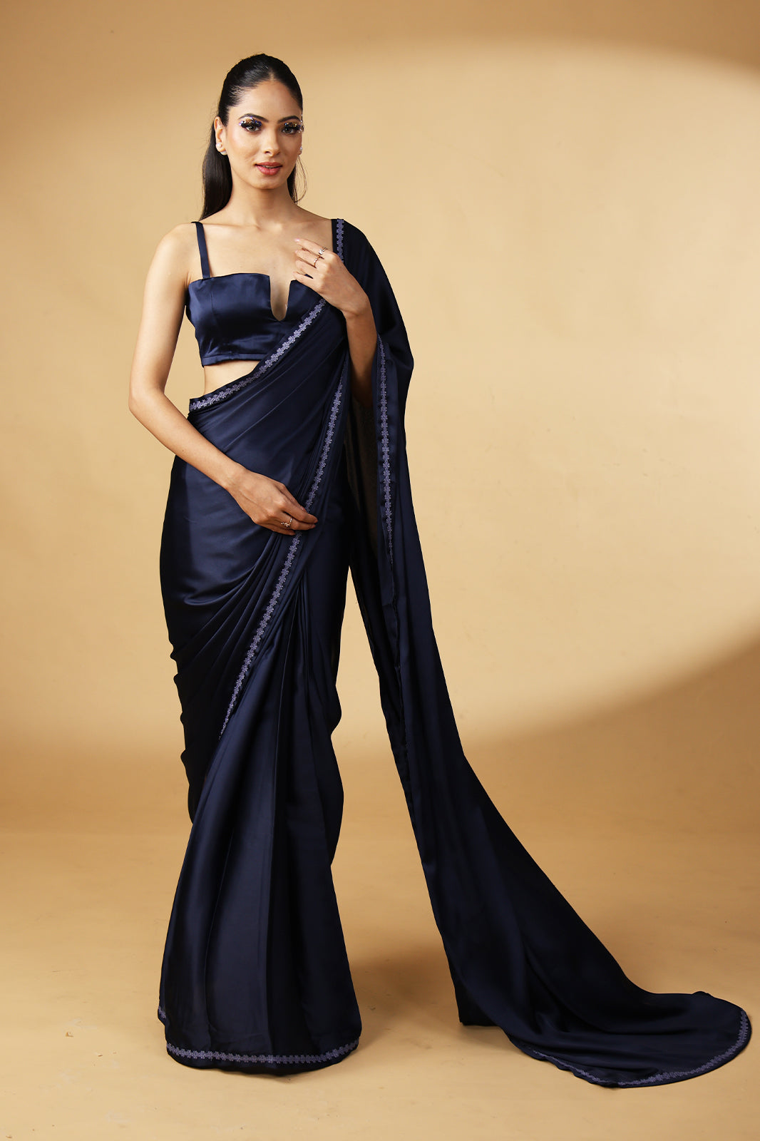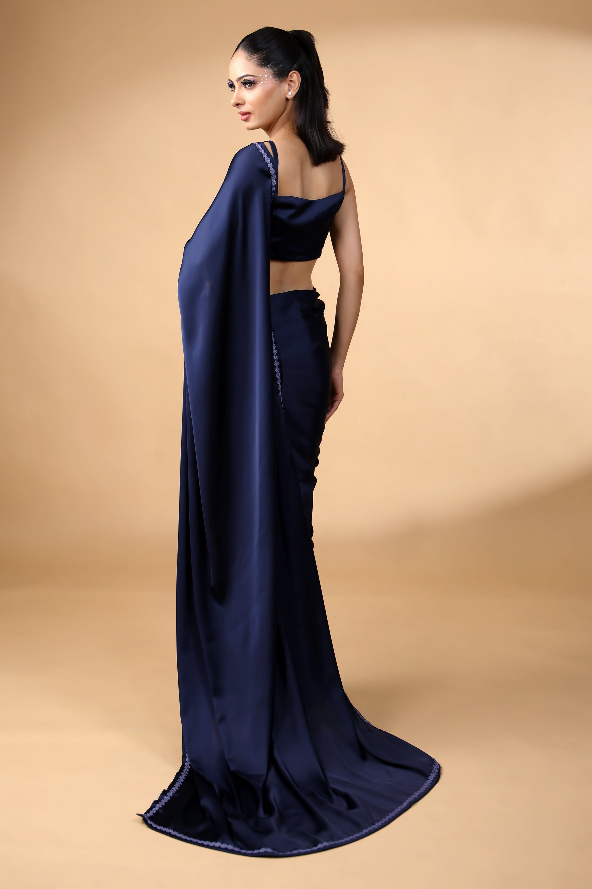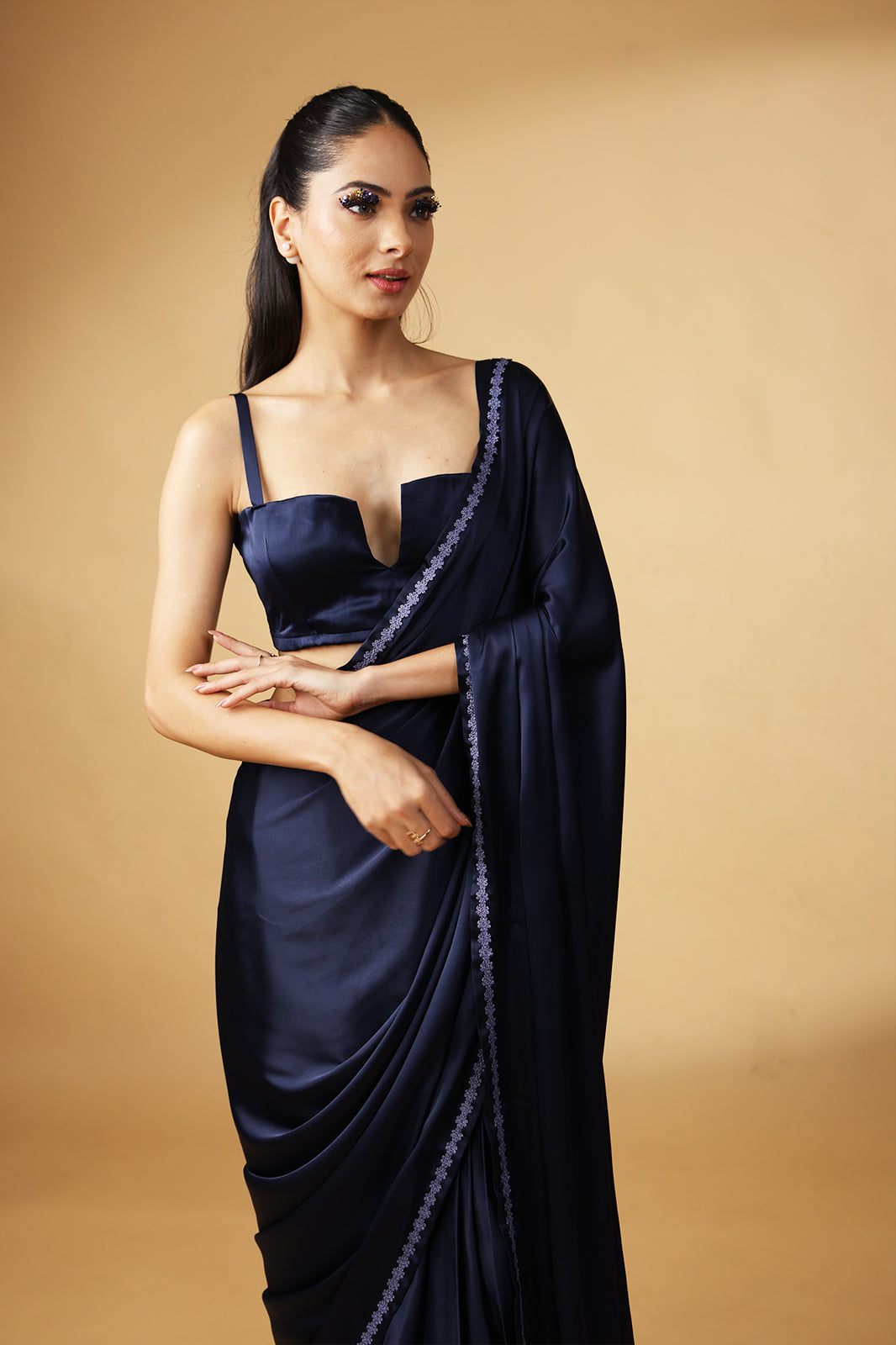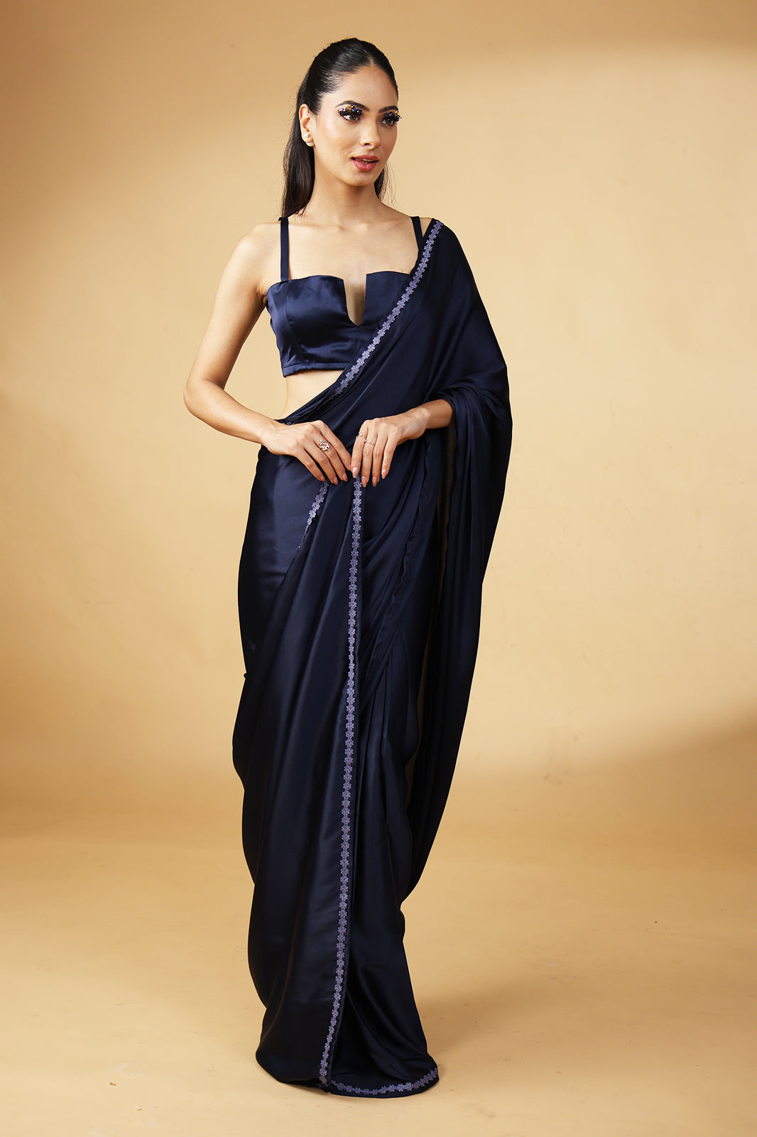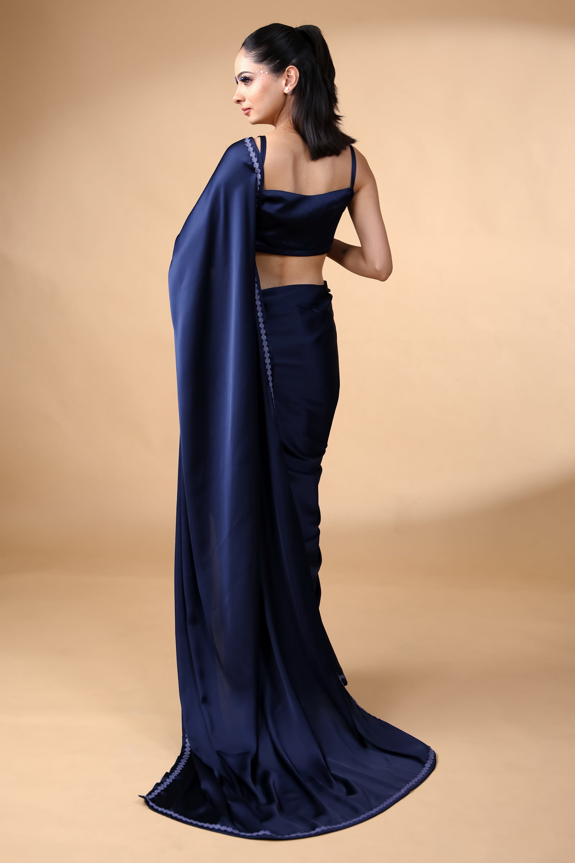 Princess Blue Lace Embellished Luxe Satin Saree with Unstitched Blouse