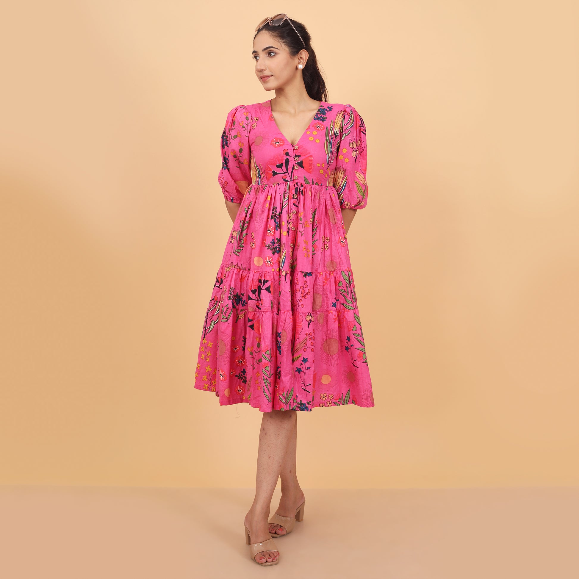This cotton dress features a heavy flared silhouette and a charming floral print. The V neckline adds a touch of elegance, while the soft cotton lining ensures comfort. Perfect for warm days, it's a stylish choice for any occasion.