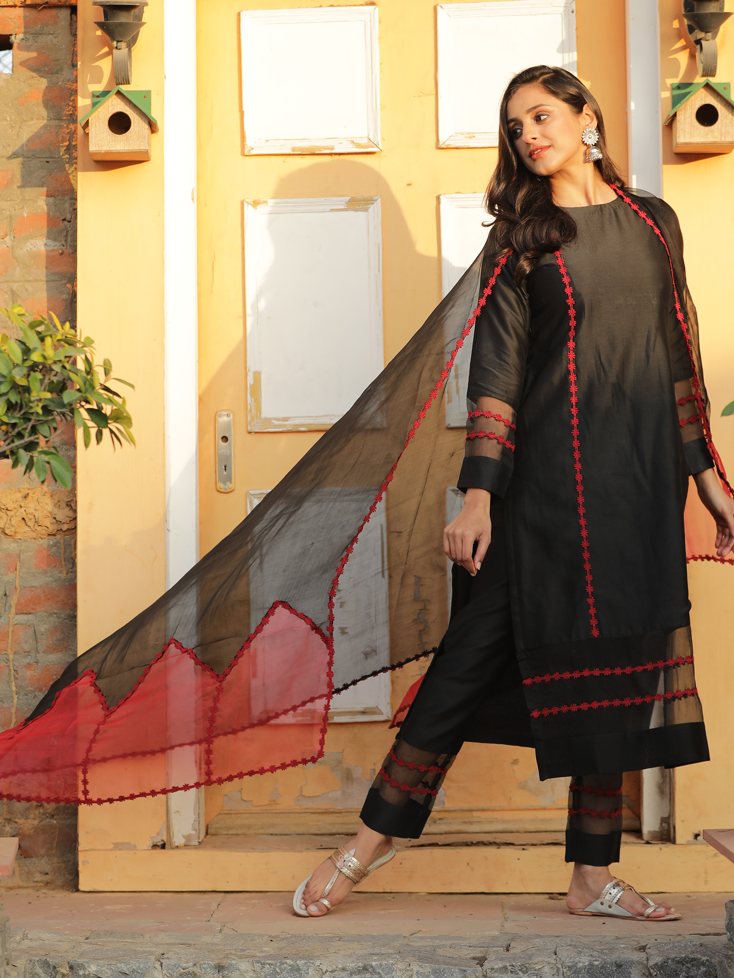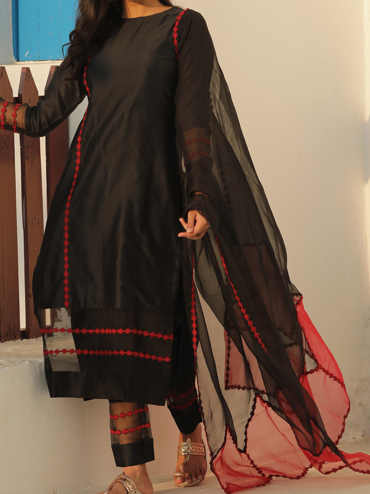 This red and black dual colored dupatta is made up of pure silk organza beautified with pure cotton embroidered lace all over the dupatta.