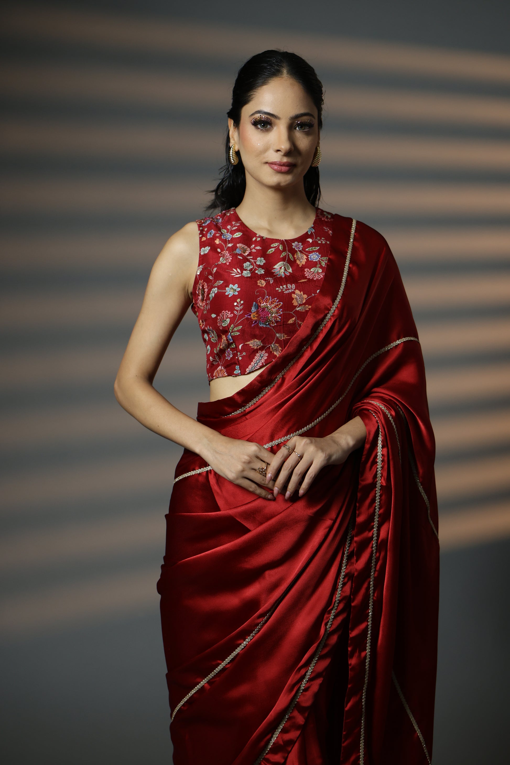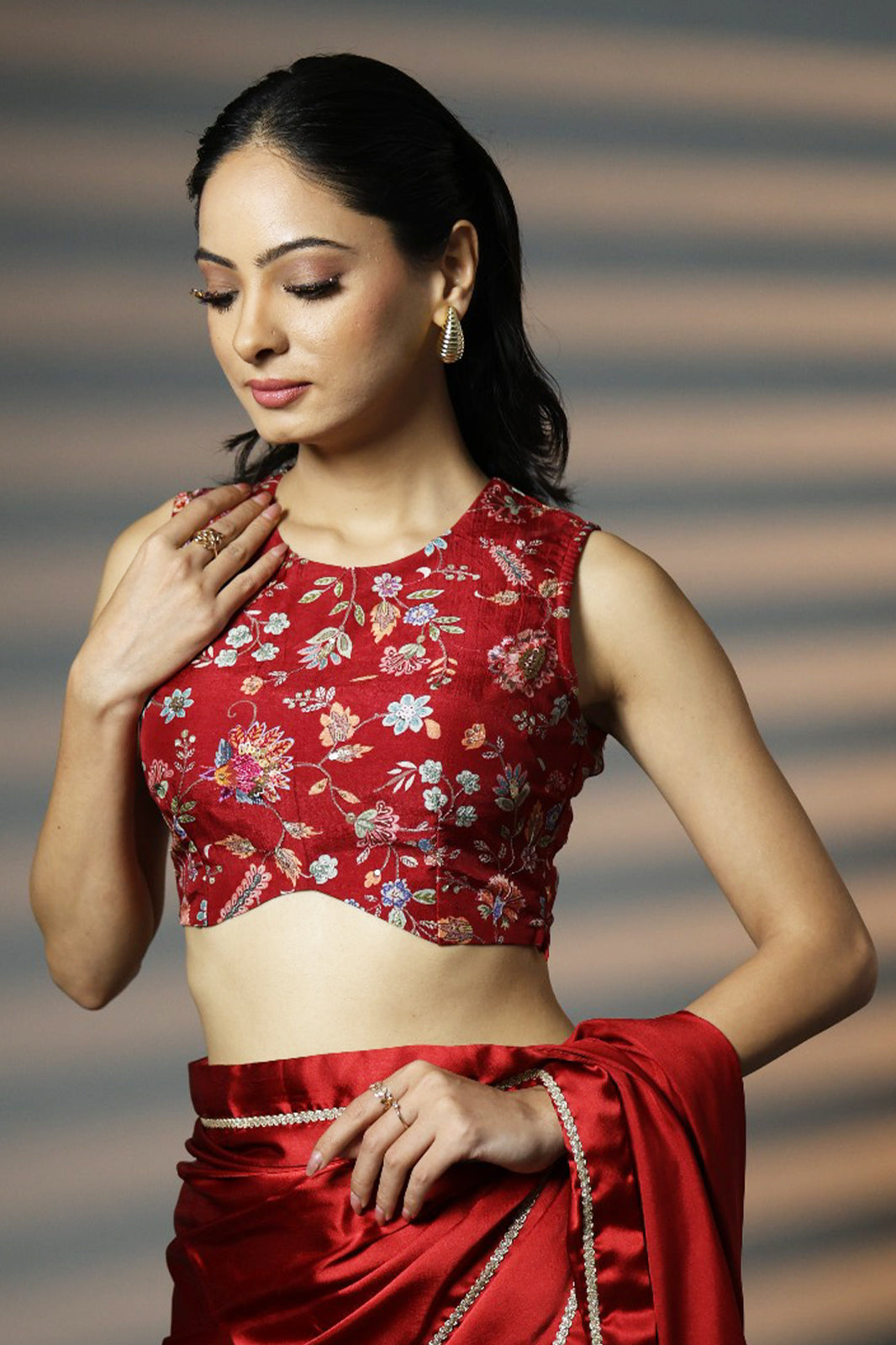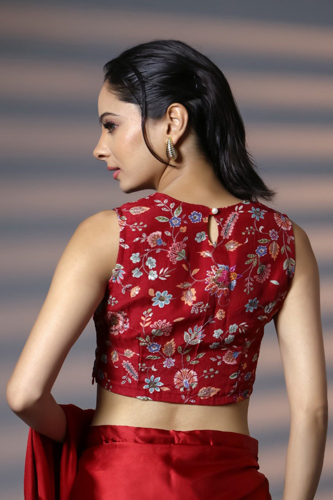 A bold expression of elegance, this premium chinon silk embroidered red top radiates grace and charm. Lined for added comfort, the sleeveless silhouette with a classic crew neck highlights refined simplicity while enhancing your natural poise. The richness of red brings energy and sensuality to the look, making it a standout choice for festive occasions or elegant evenings.