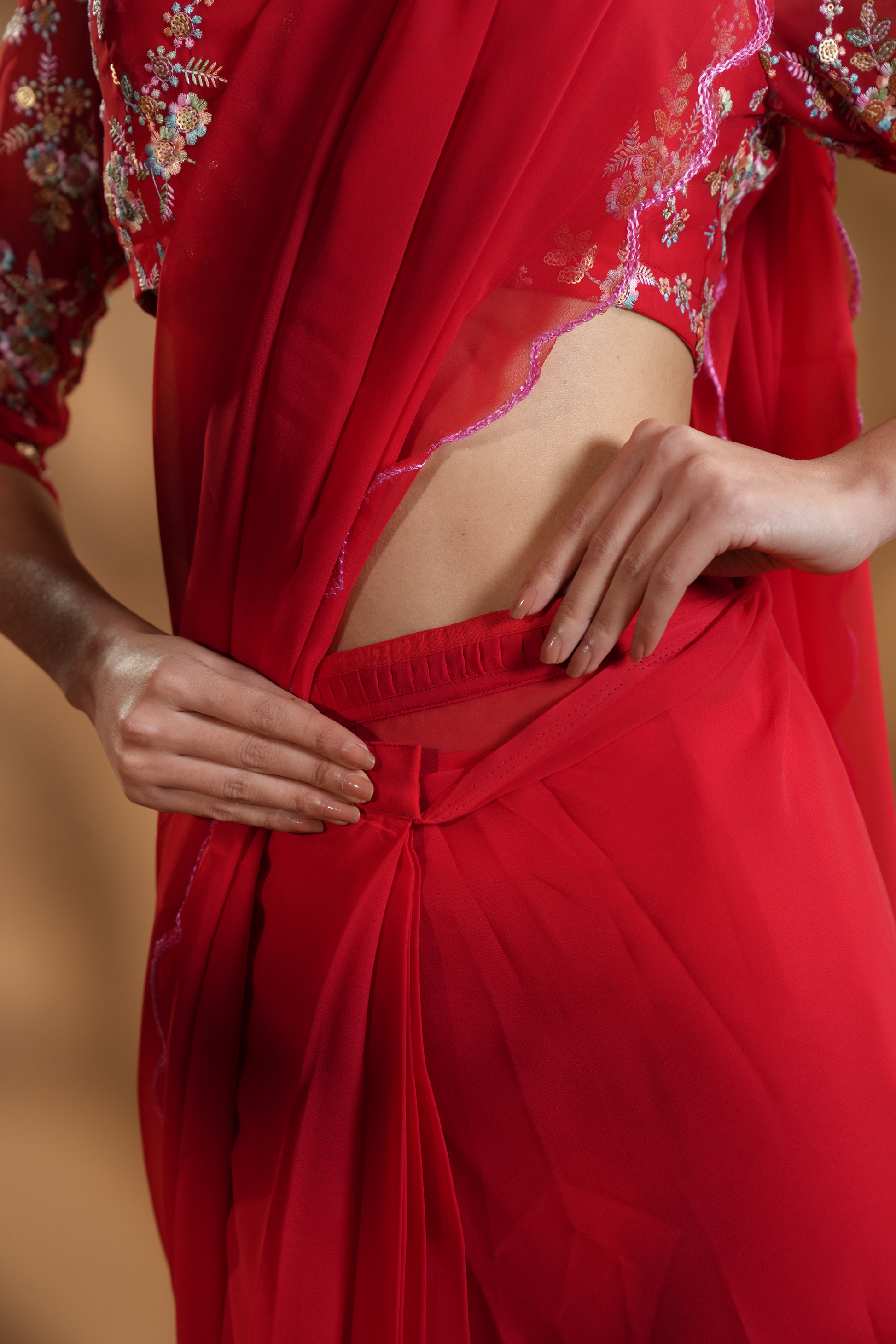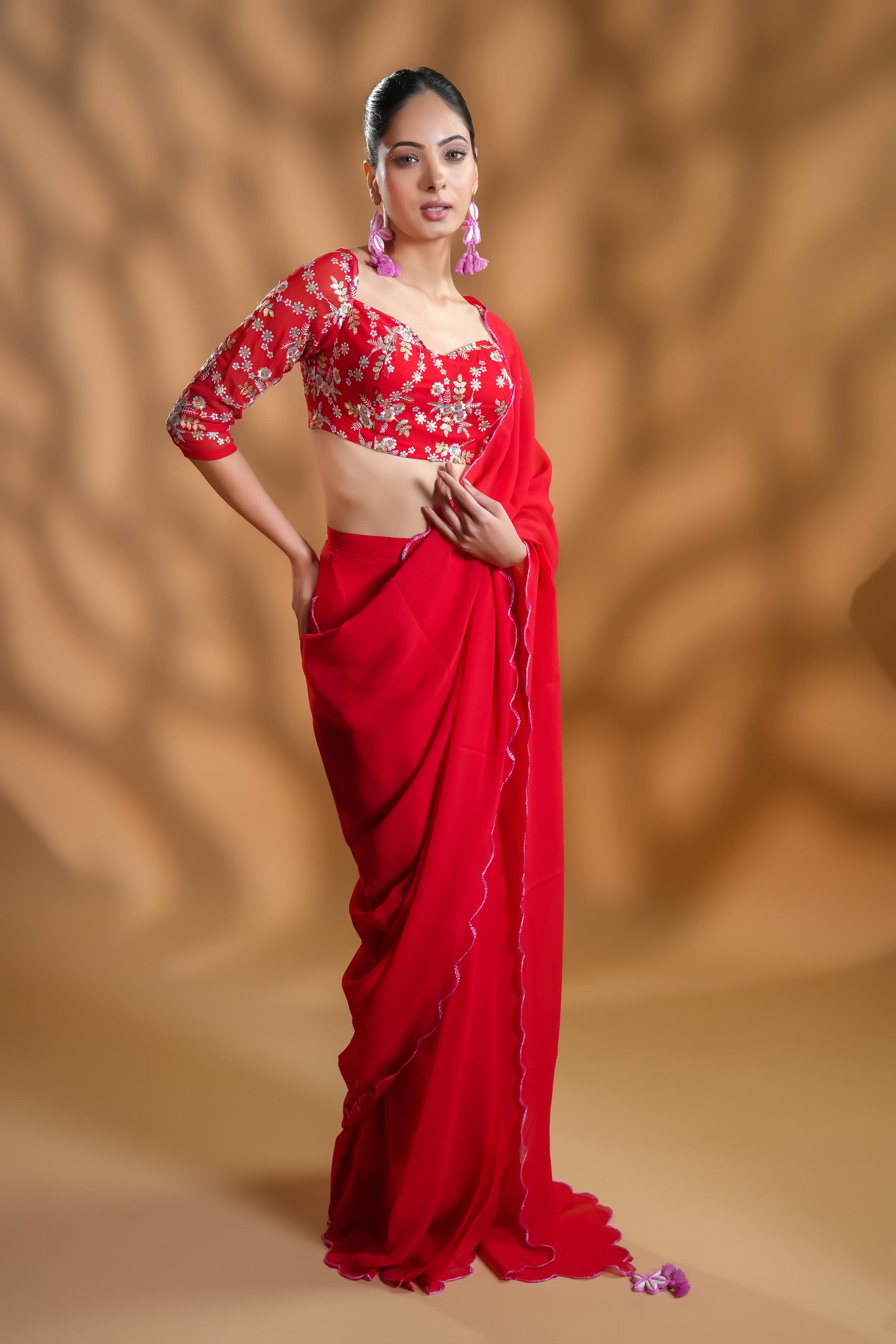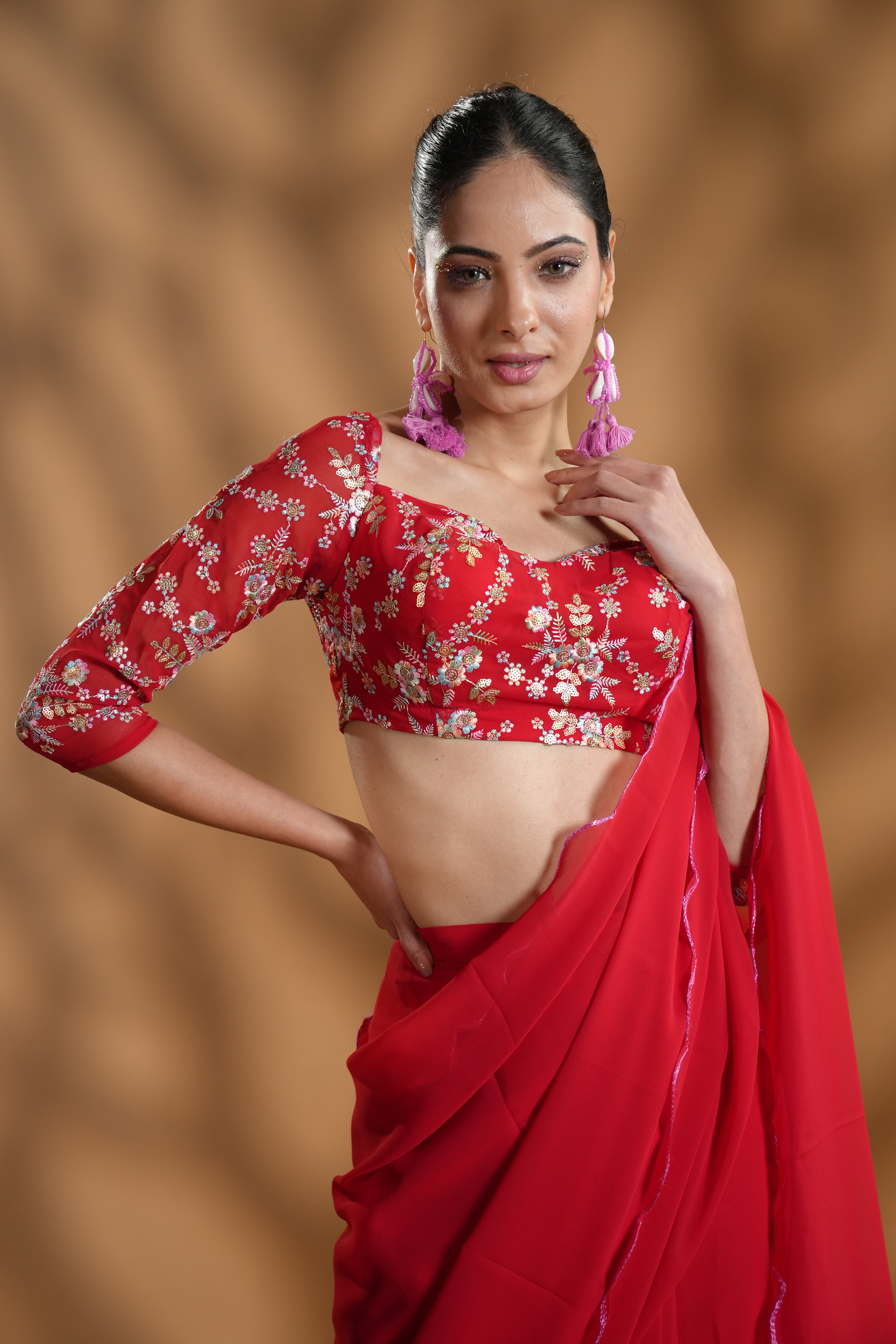 Red Georgette Ready To Wear Saree With Embroidered Blouse Fabric and Tassels