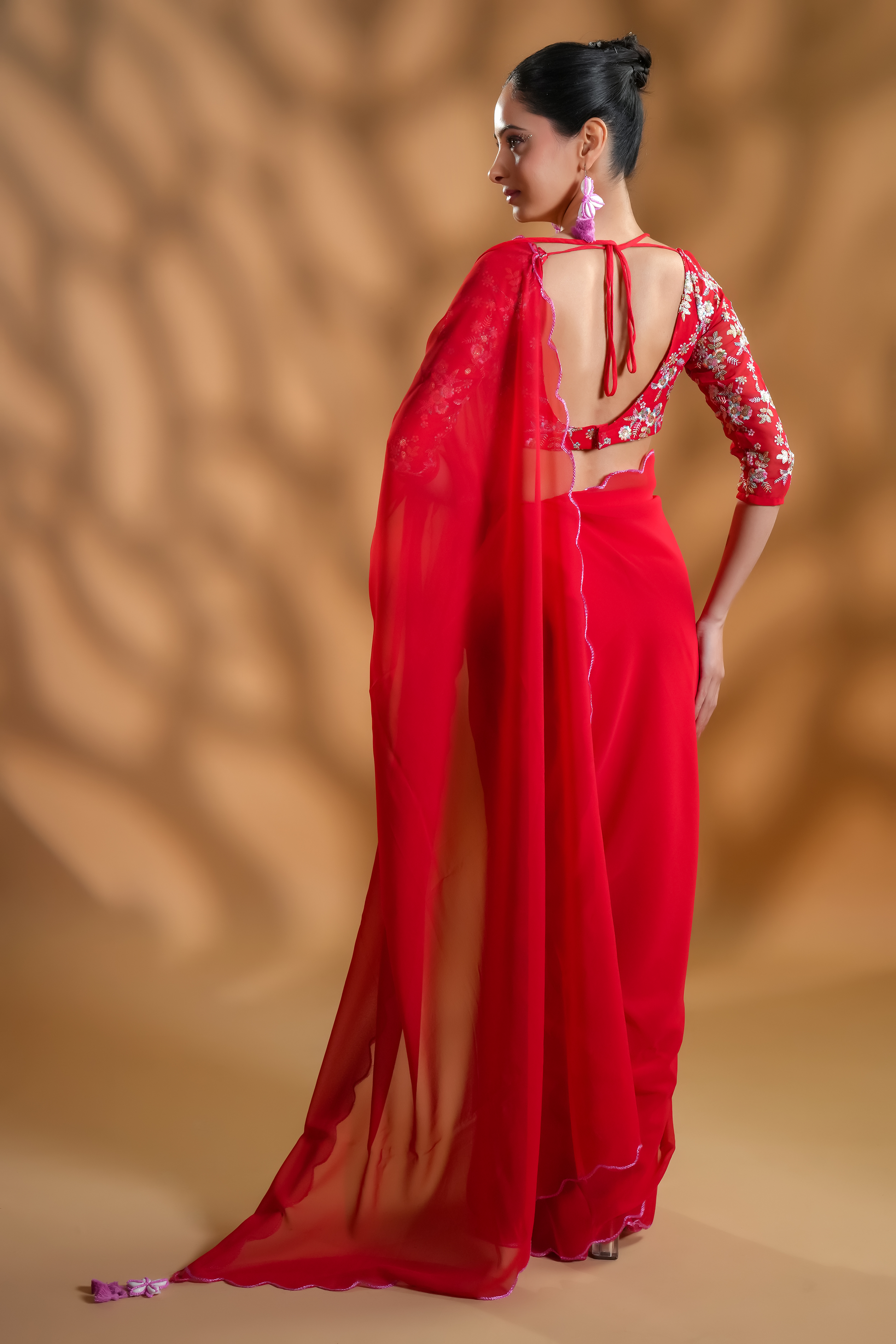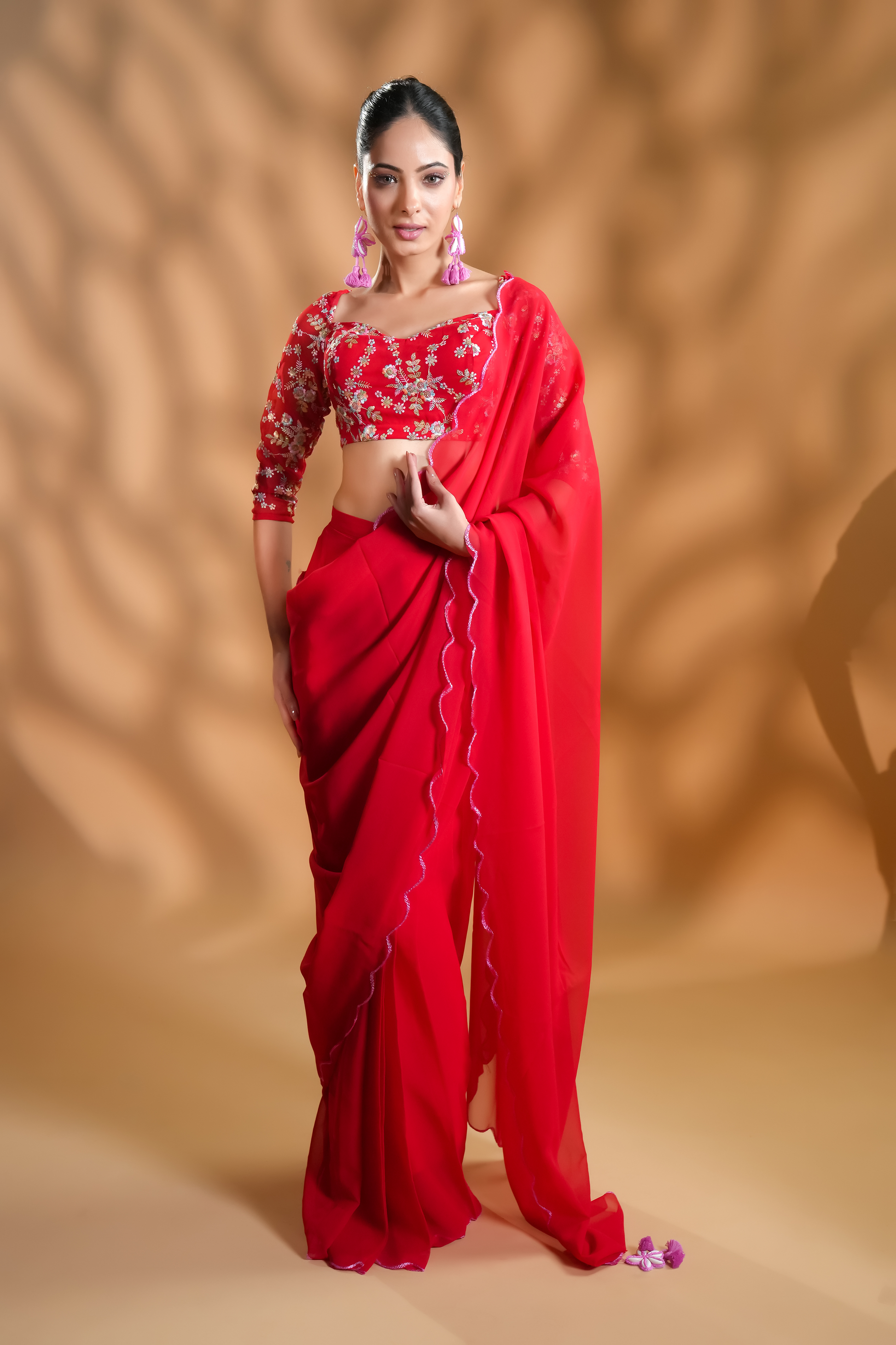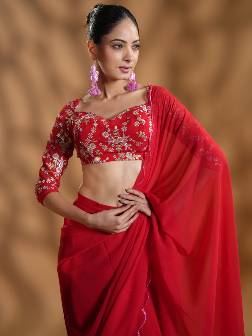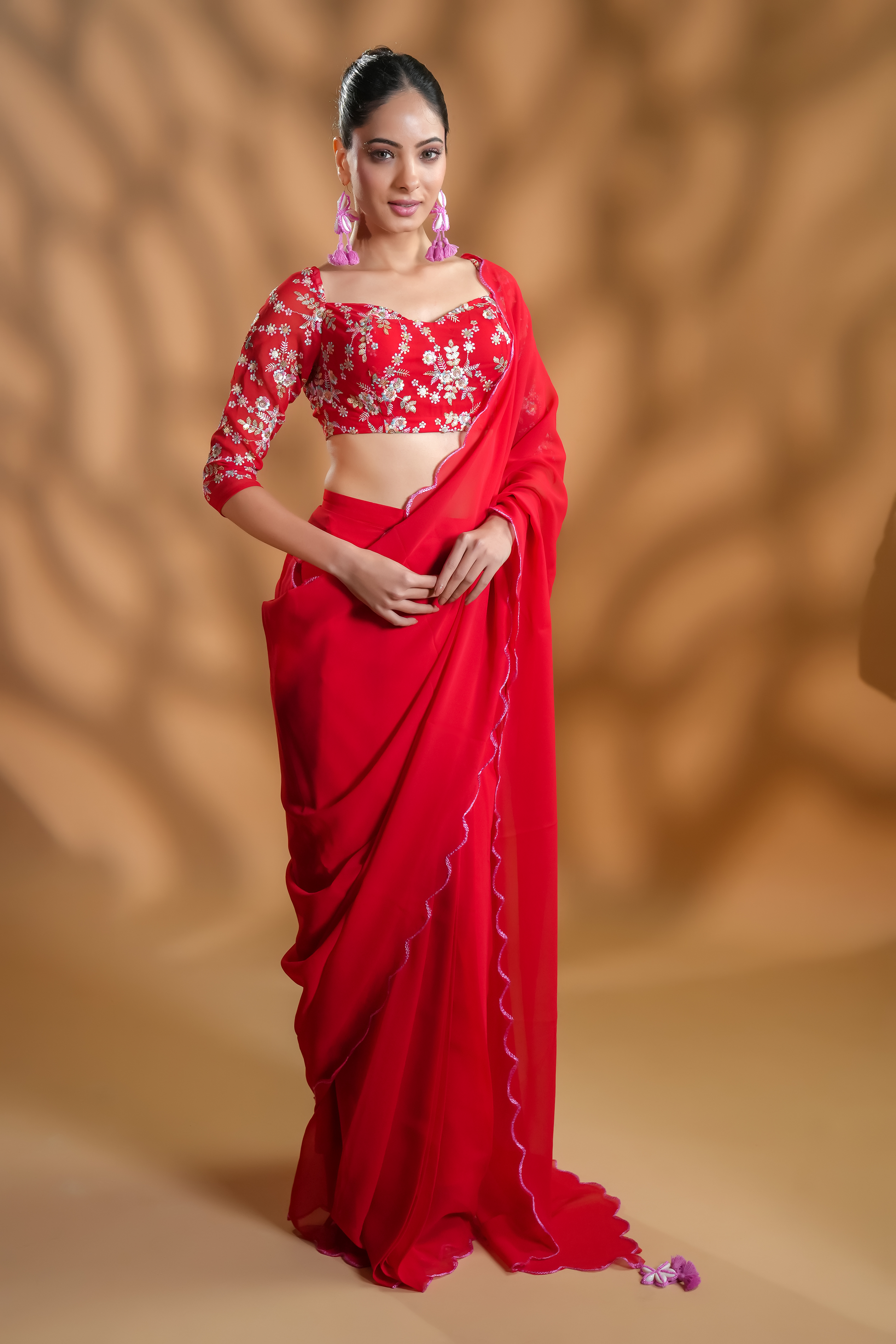 Red Georgette Ready To Wear Saree With Embroidered Blouse Fabric and Tassels