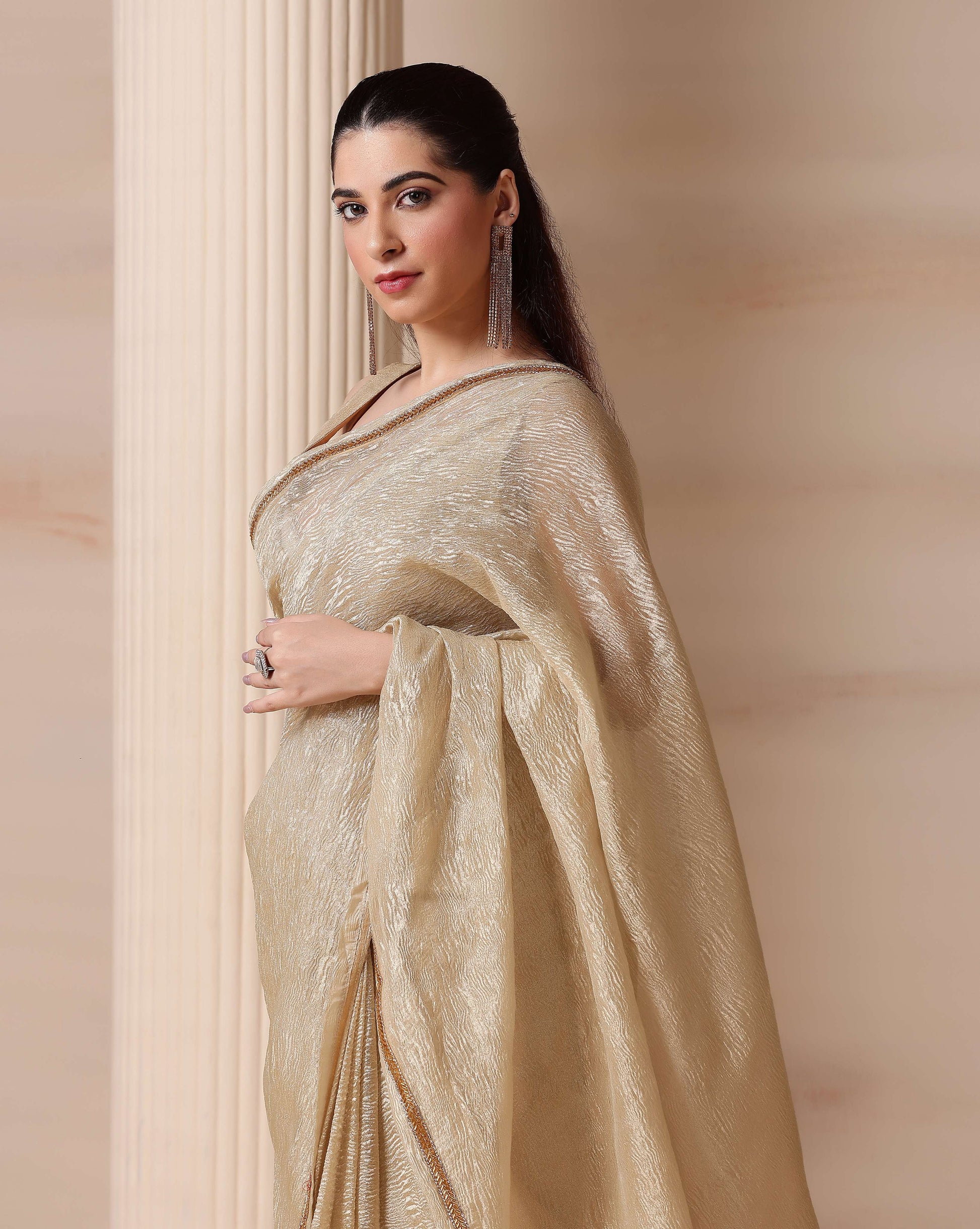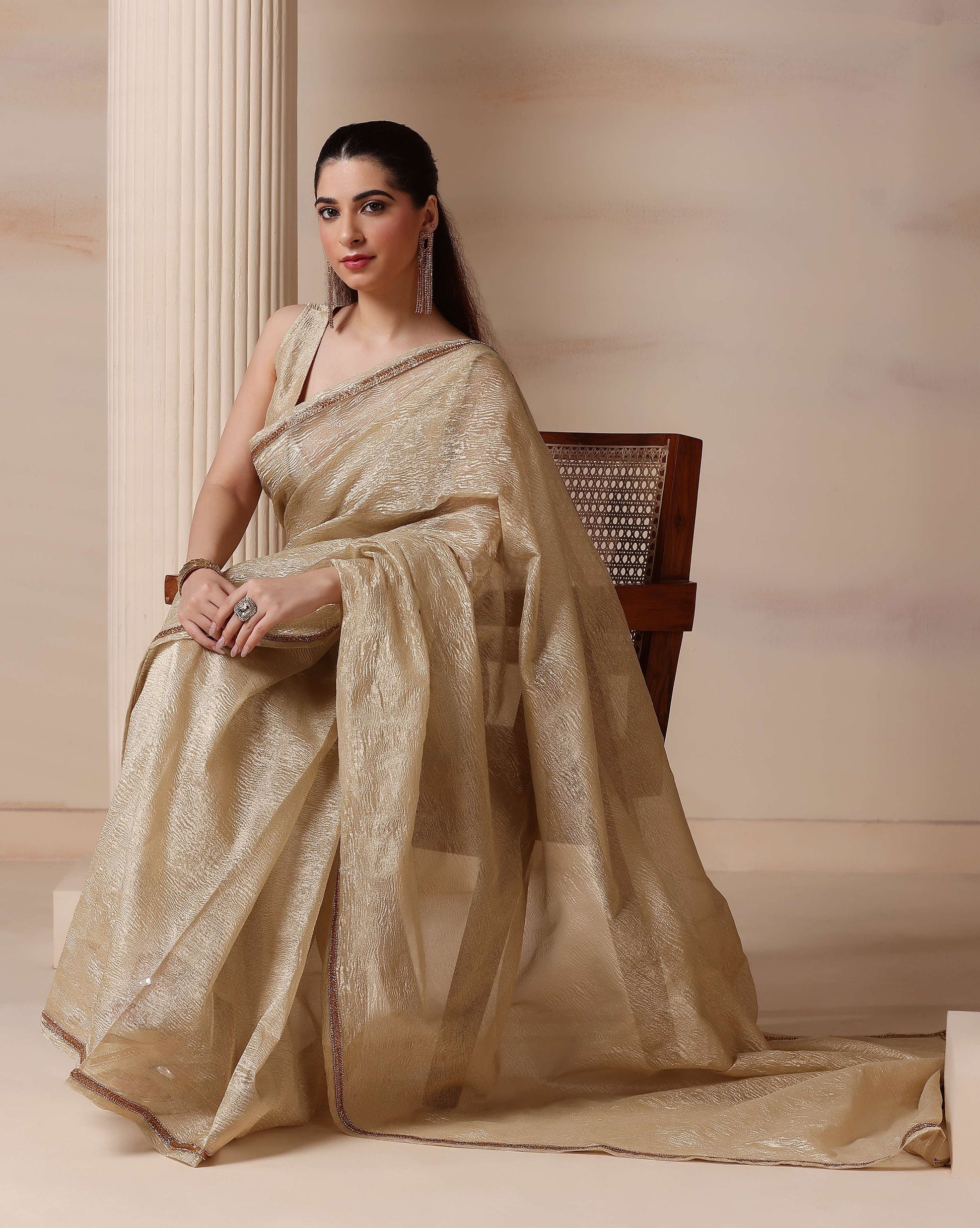 Regal Silver Gold Shimmer Embellished Crush Tissue Saree with Blouse Fabric