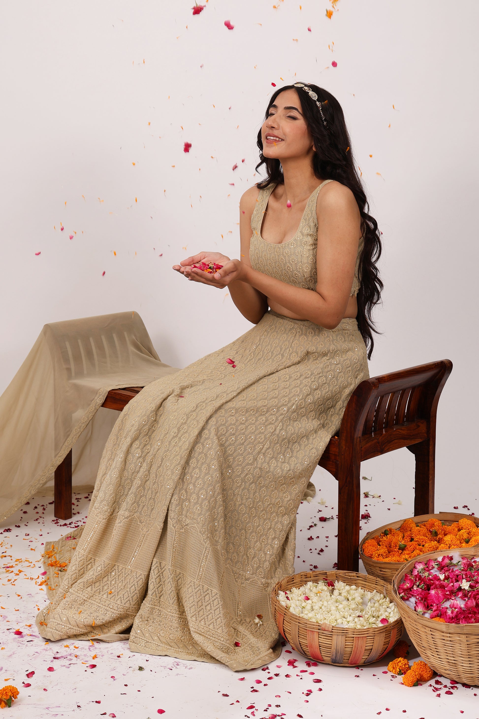 Elevate your style with this exquisite Chikankari lehenga set, featuring a sleeveless chikankari blouse with a scoop neckline, a flared chikankari skirt, and a georgette dupatta adorned with chikankari borders at the corners. Perfect for any grand occasion.