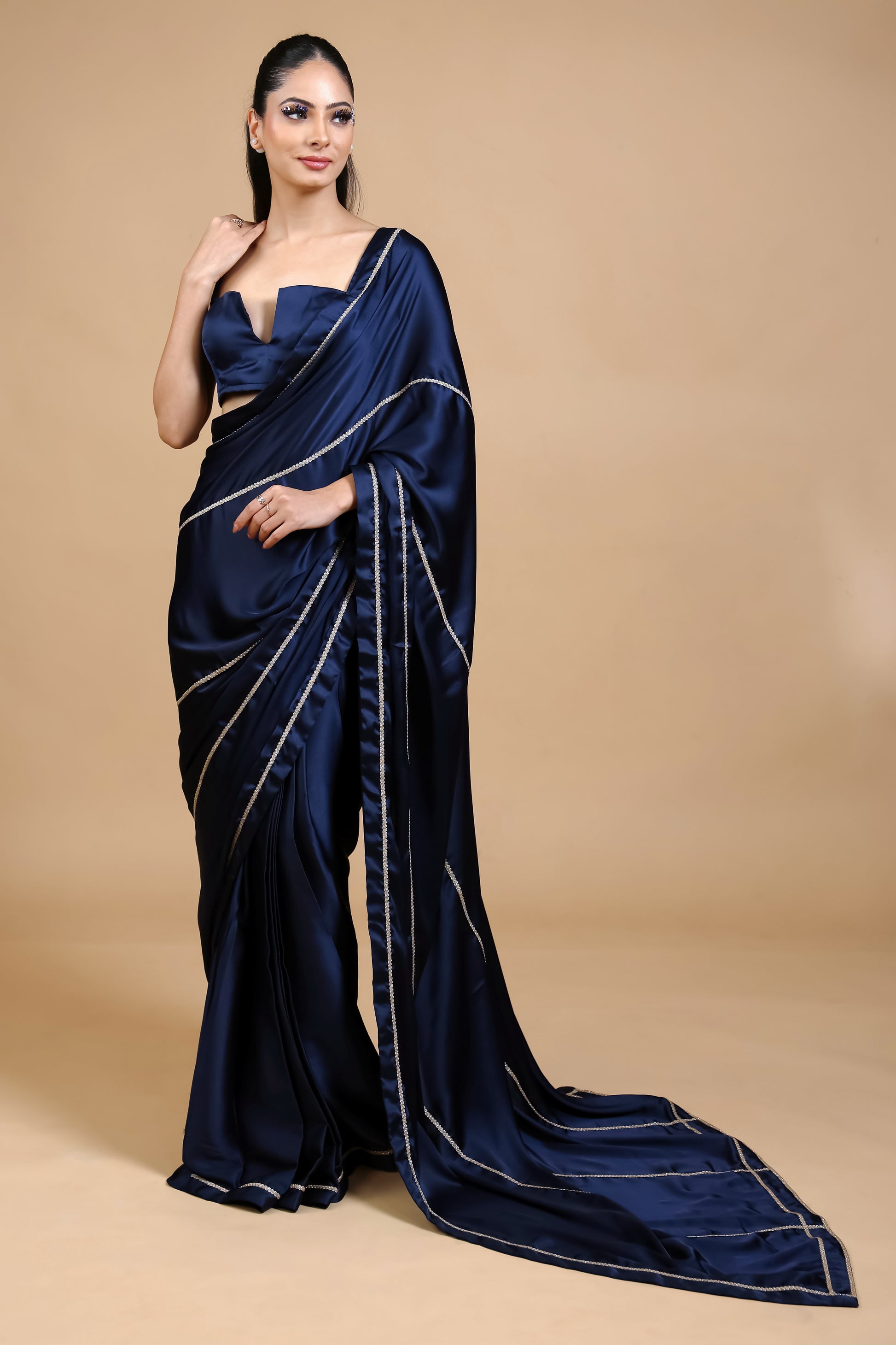 Redefine timeless elegance with this lightweight saree designed for the modern woman. Featuring a unique drape style at both the front and back, it blends contemporary flair with traditional grace. The soft, flowing fabric ensures a sleek silhouette and a comfortable fit, making it perfect for formal events, evening soirées, or festive celebrations. The saree comes with an unstitched satin silk blouse fabric as worn by the model.
