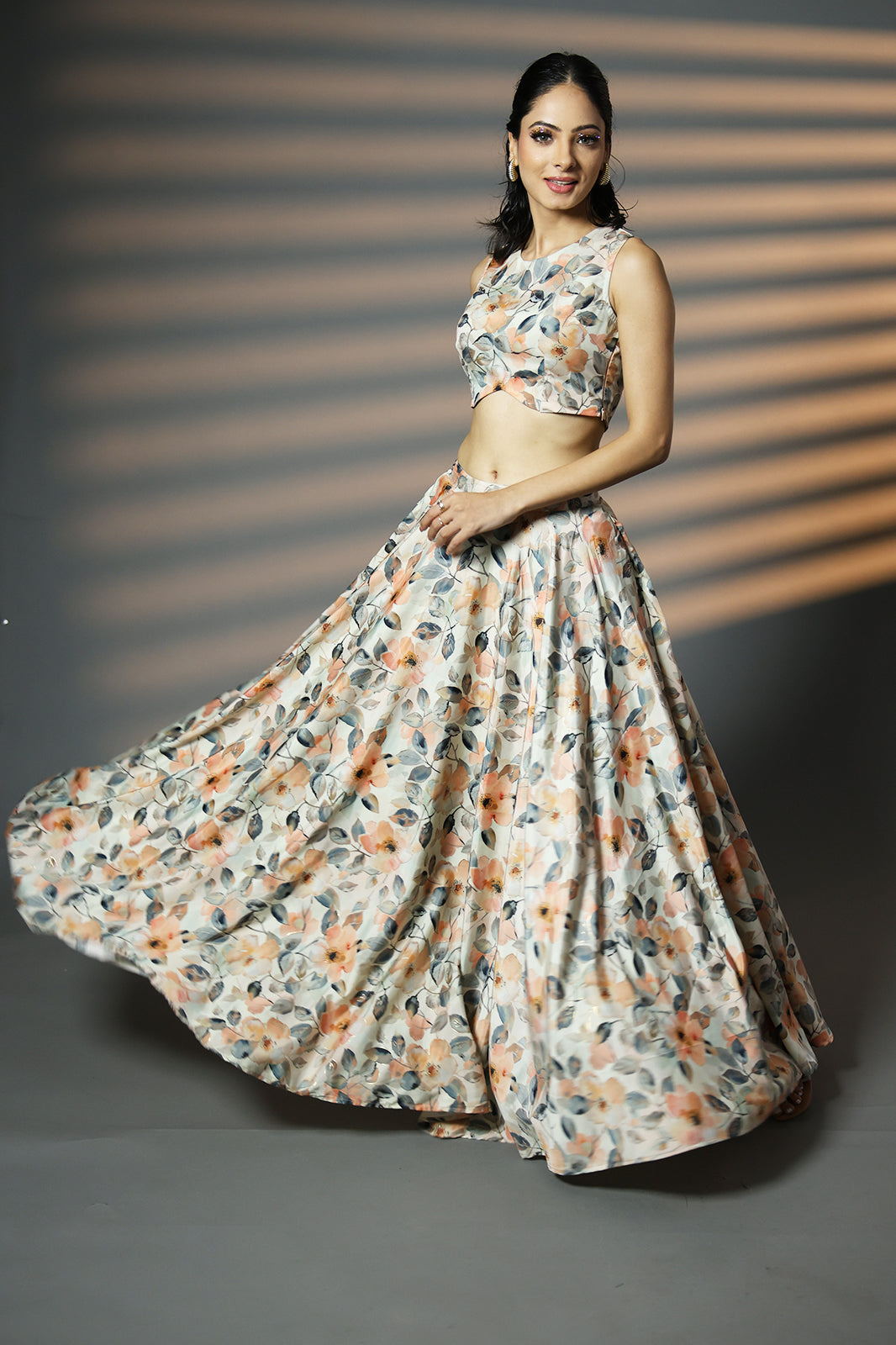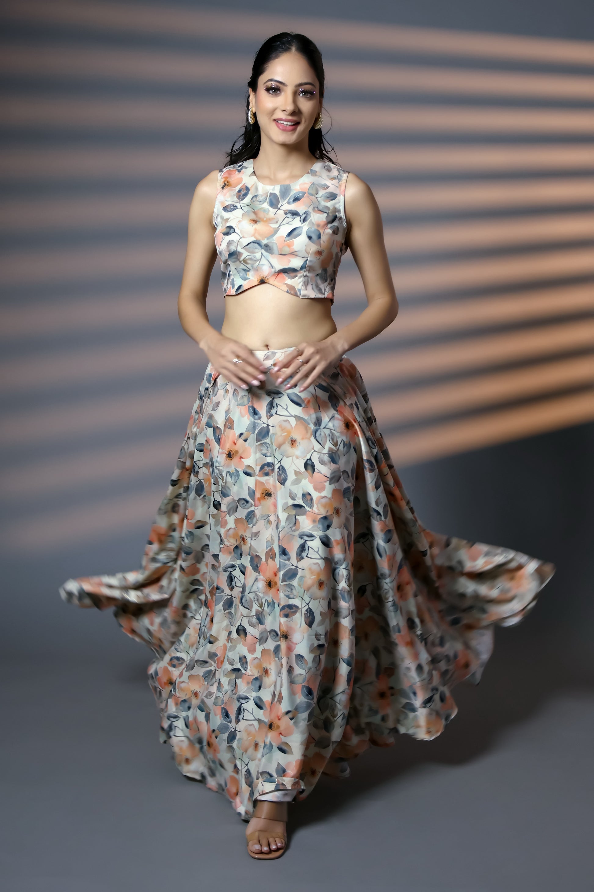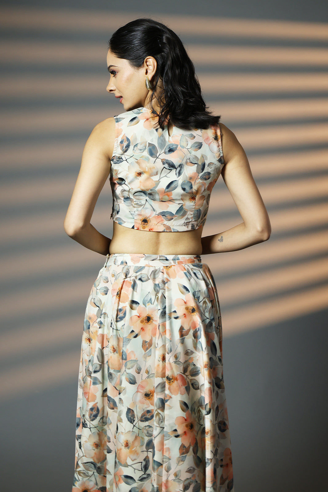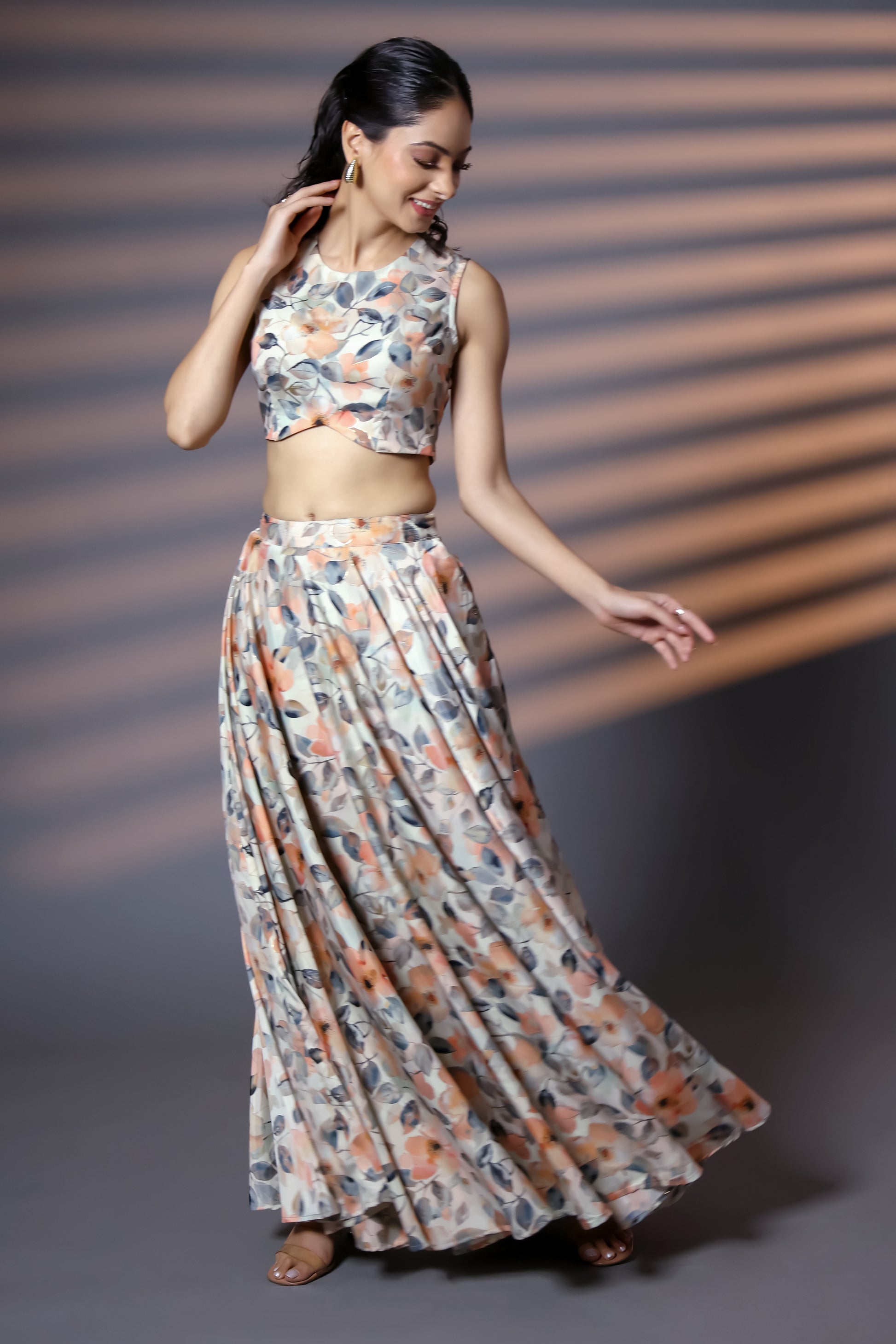 This vibrant coord set features a floral-printed top with a relaxed silhouette and delicate detailing. Crafted from breathable fabric, the top pairs effortlessly with a flowy, handcrafted rayon skirt that exudes grace and sophistication. Ideal for festive gatherings or elegant daytime events, this ensemble strikes the perfect balance between comfort and timeless charm.