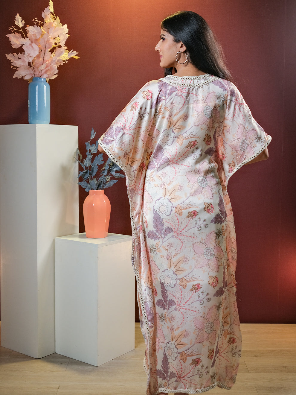 Stand out in the crowd and be ready to get compliments in this beautiful off white floral long kaftan. This satin kaftan with lining is particularly designed keeping in mind the taste of all age groups. Featuring a V-neckline, this kaftan is an outstanding piece that every female must possess. The intricate detailing of white laces at the border enhances the overall look of the outfit.