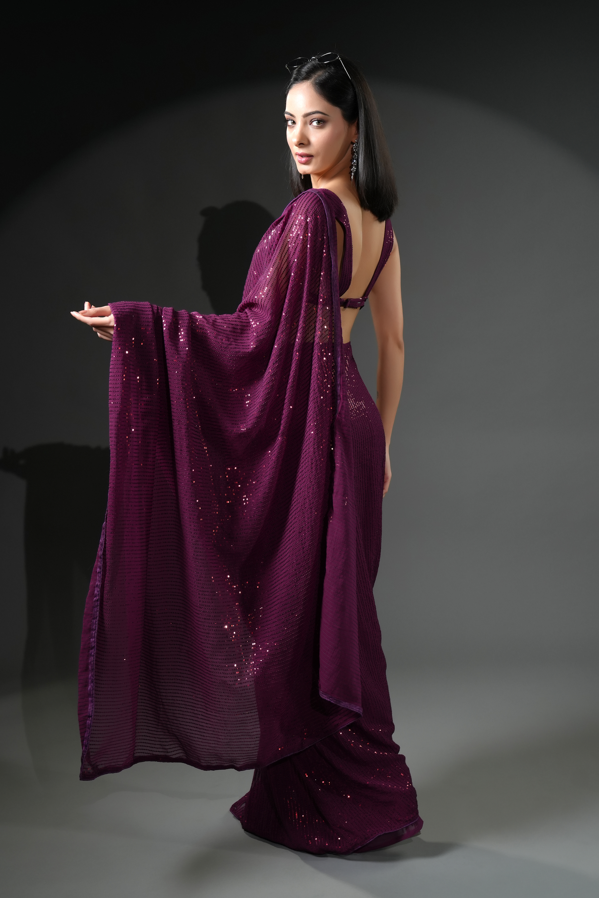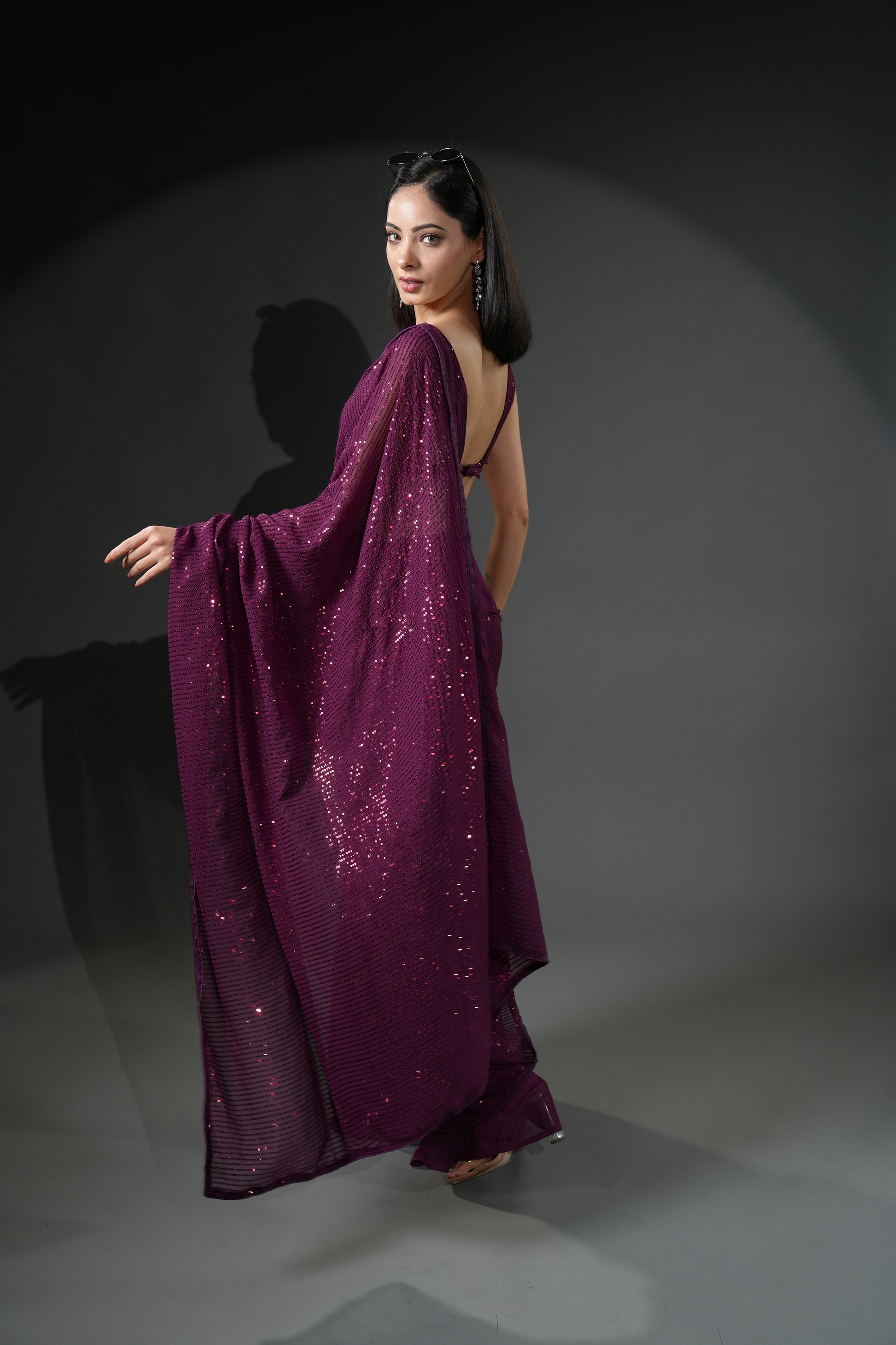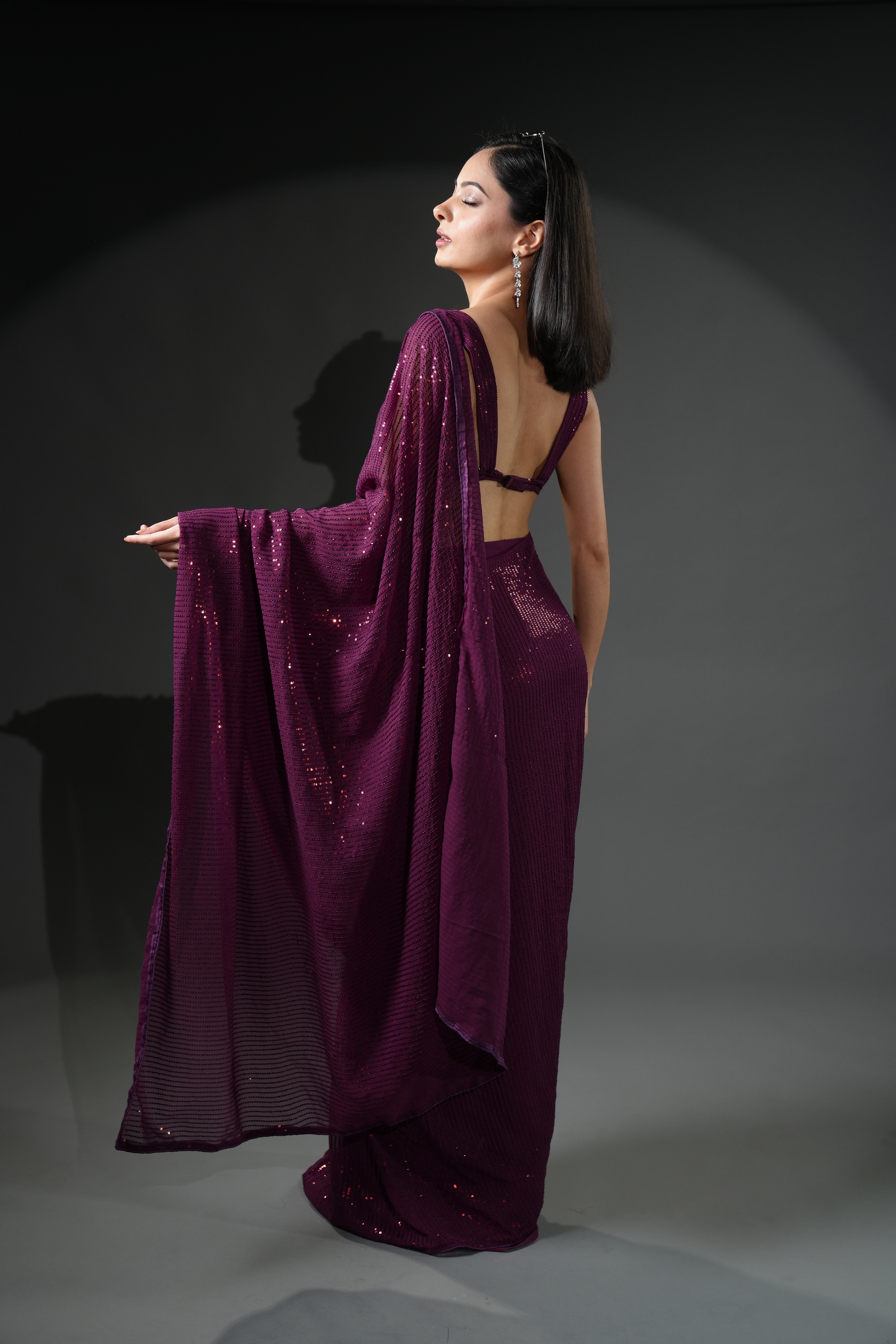 Redefine timeless elegance with this lightweight saree designed for the modern woman. Featuring a unique drape style at both the front and back, it blends contemporary flair with traditional grace. The soft, flowing fabric ensures a sleek silhouette and a comfortable fit, making it perfect for formal events, evening soirées, or festive celebrations. The saree comes with a matching blouse piece as worn by the model.