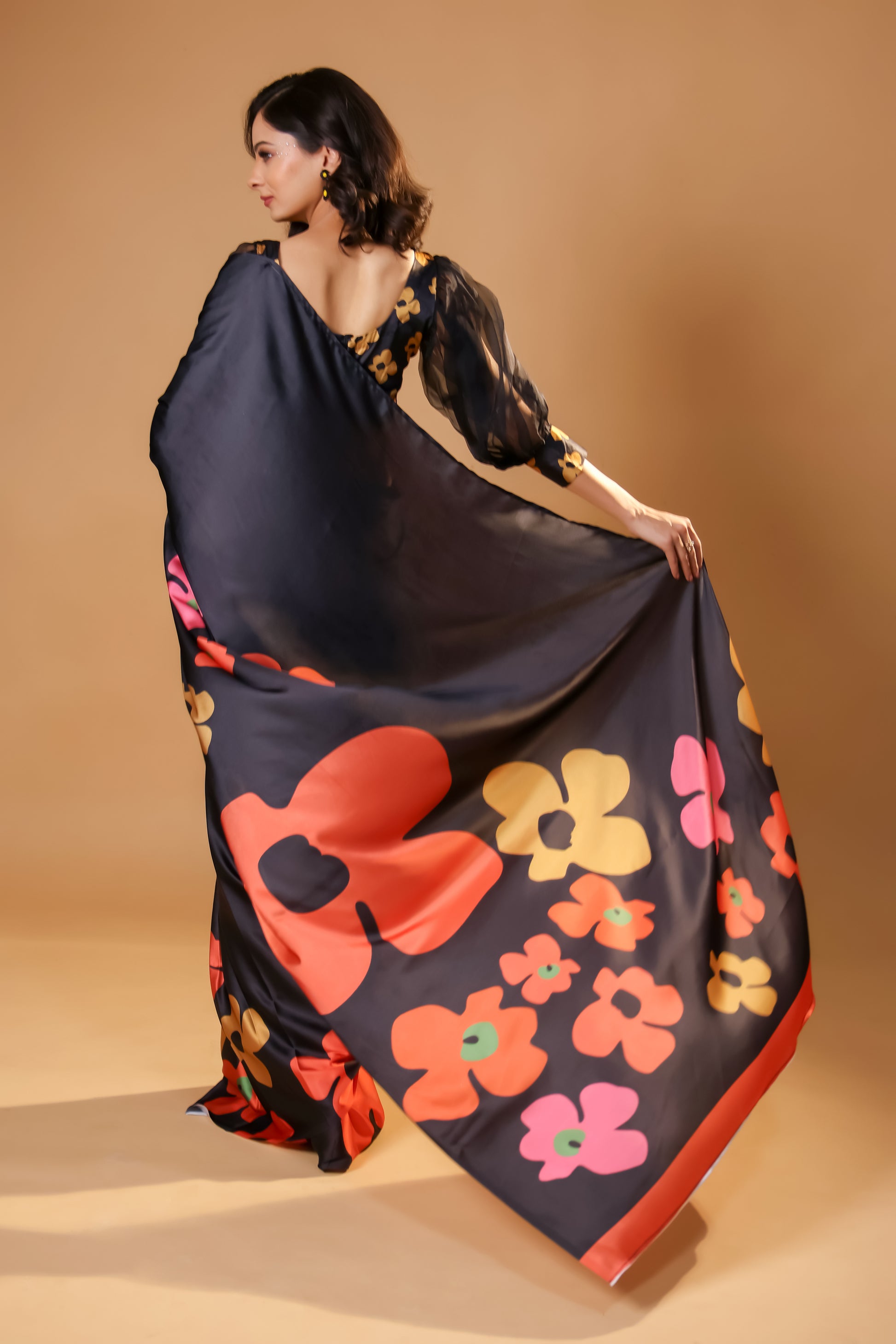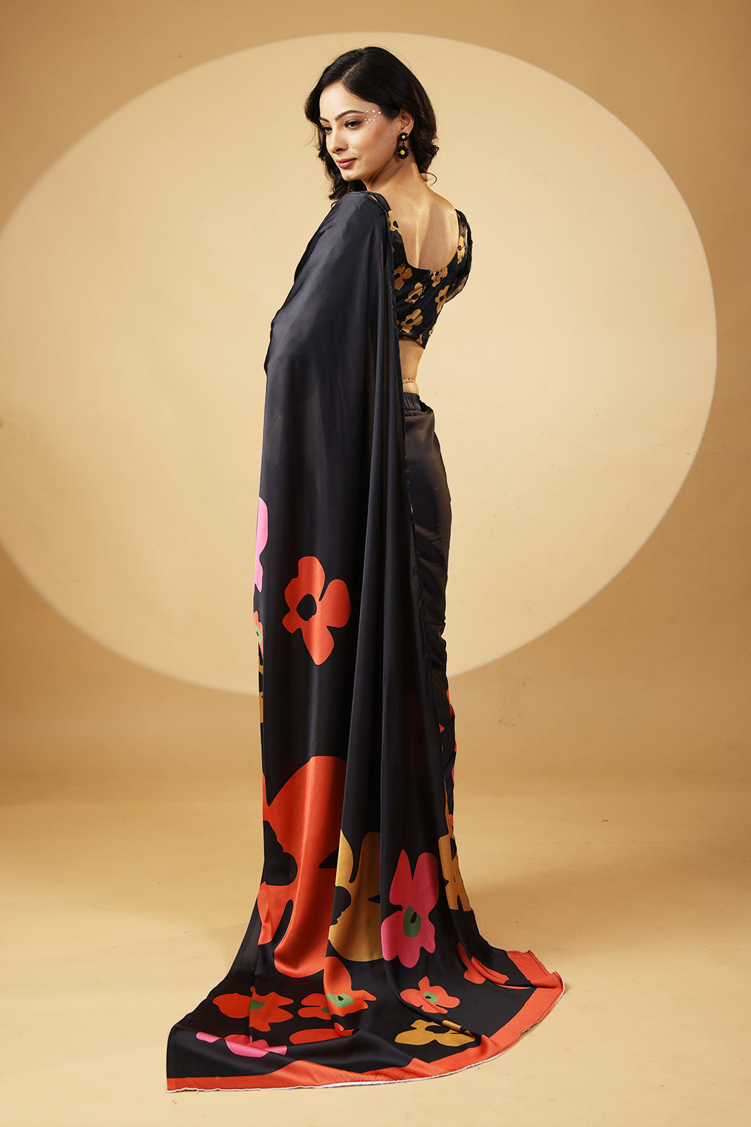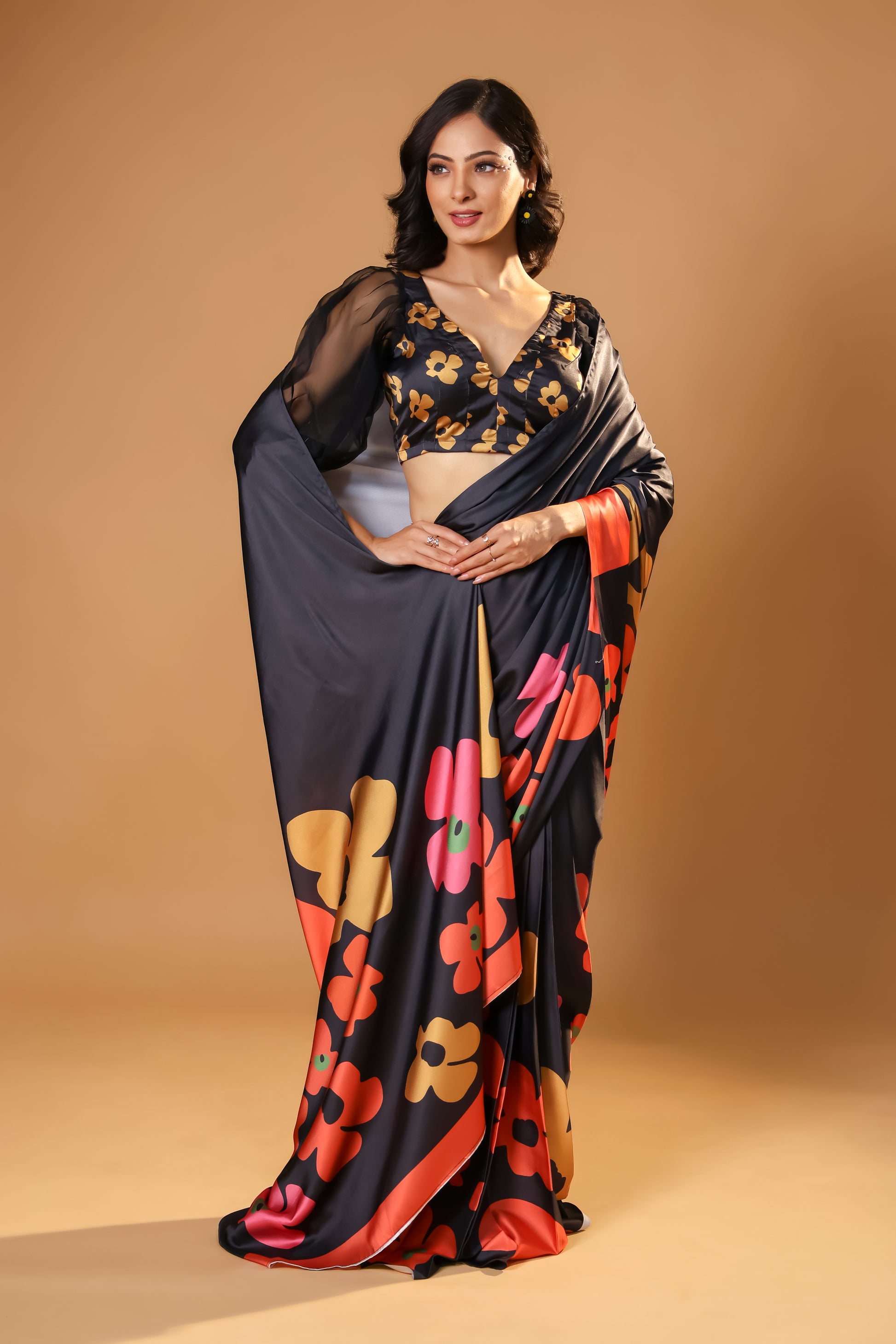 Silken Bloom Floral Printed Premium Satin Saree with Unstitched Blouse