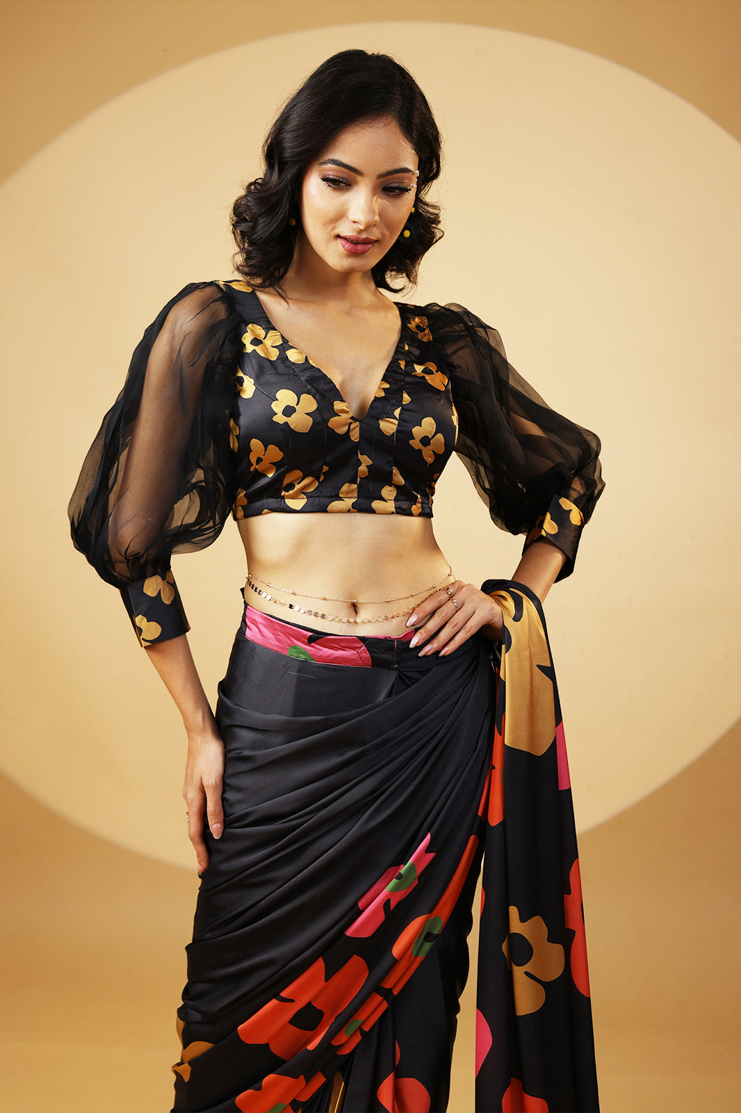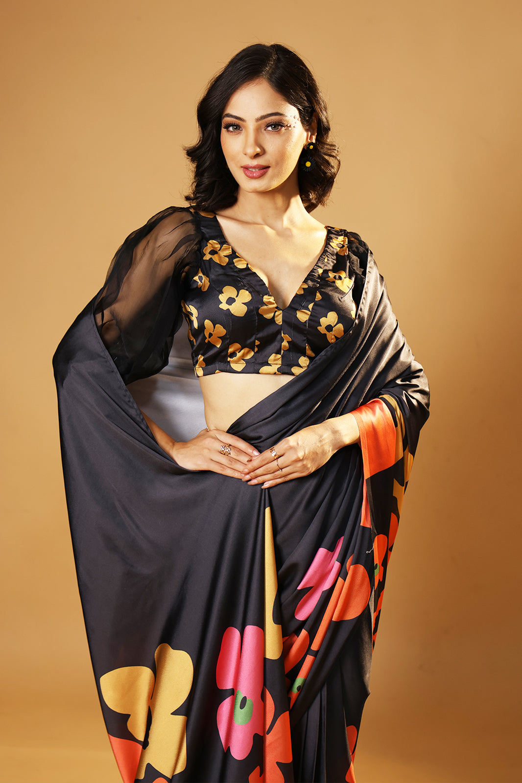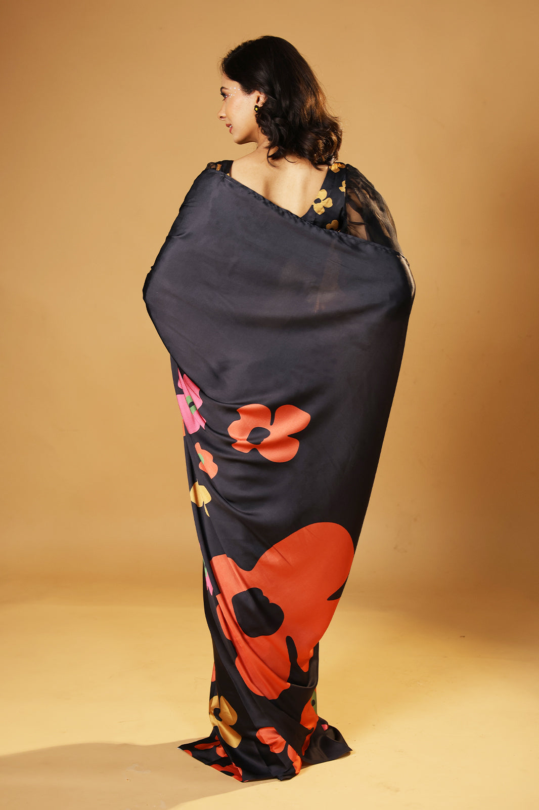 Silken Bloom Floral Printed Premium Satin Saree with Unstitched Blouse
