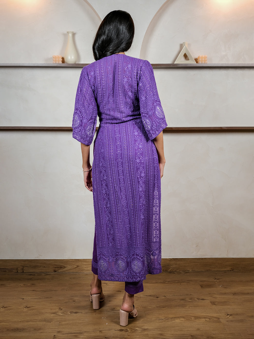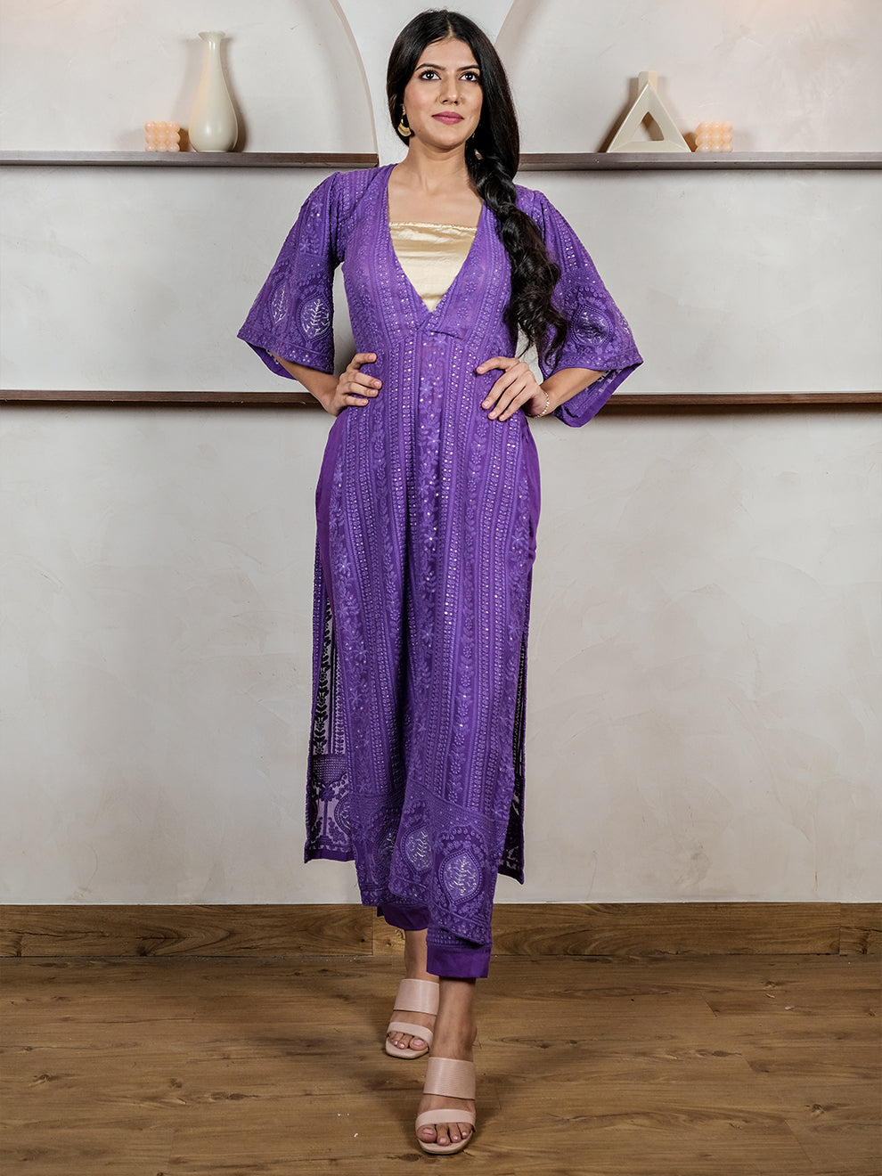 Sparkling Purple Chikankari Kurta Pant Set with Inner