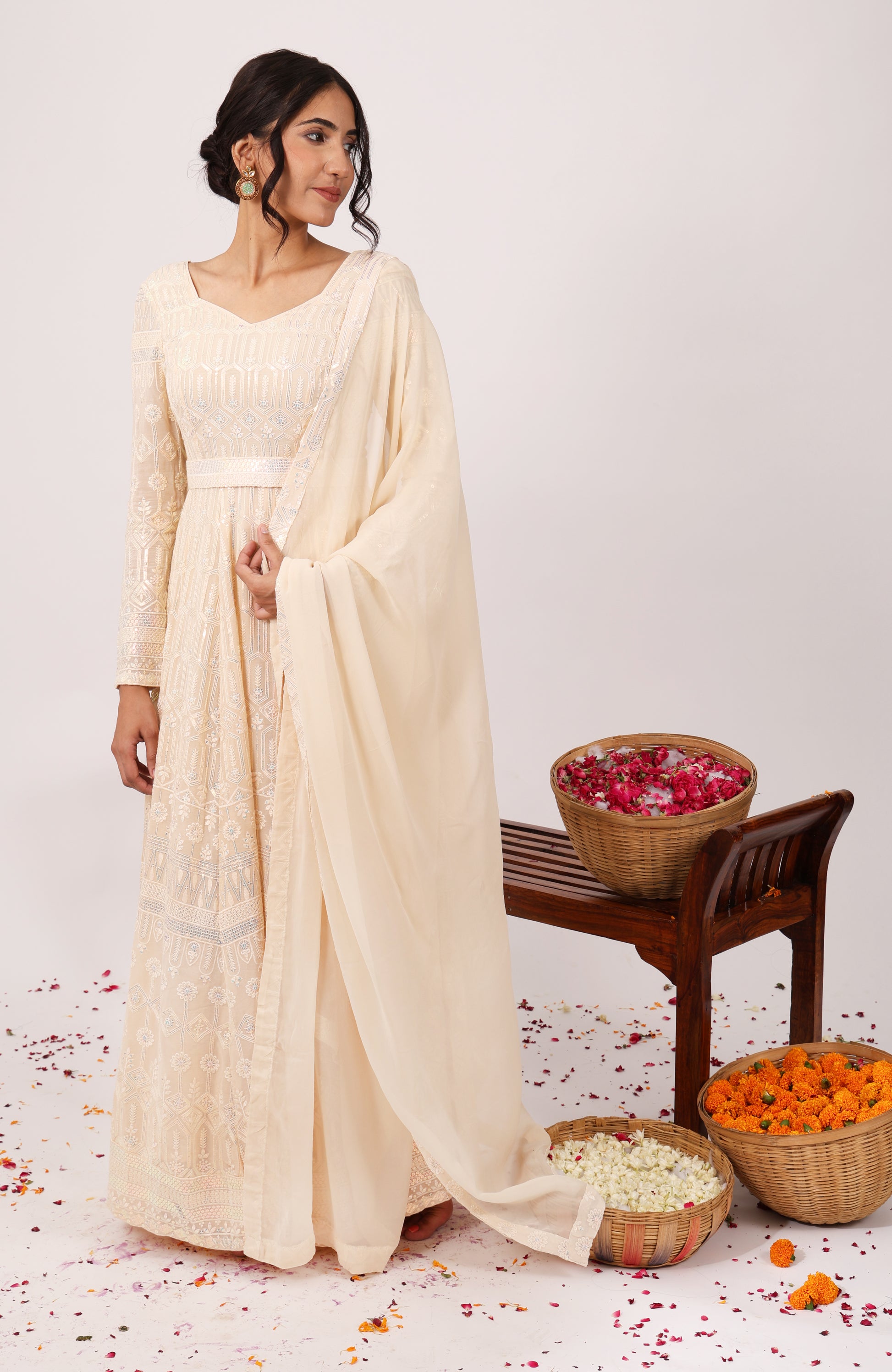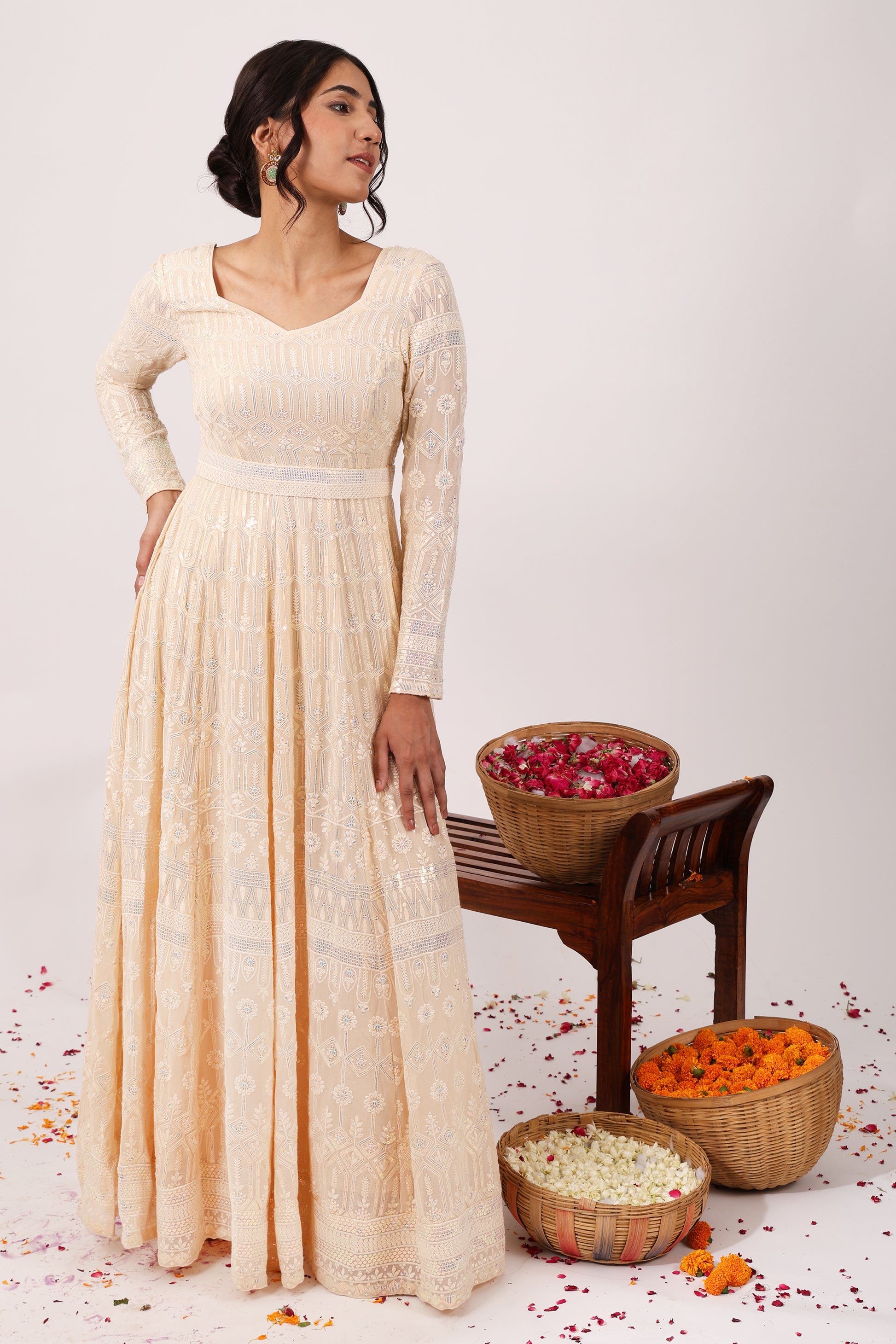 Step into elegance with our heavy embroidered chikankari gown, adorned with shimmering sequins and featuring a flattering sweetheart neckline and full sleeves. Complete with a chic chikankari belt and a georgette dupatta accented by delicate chikankari borders, perfect for a graceful and refined look.