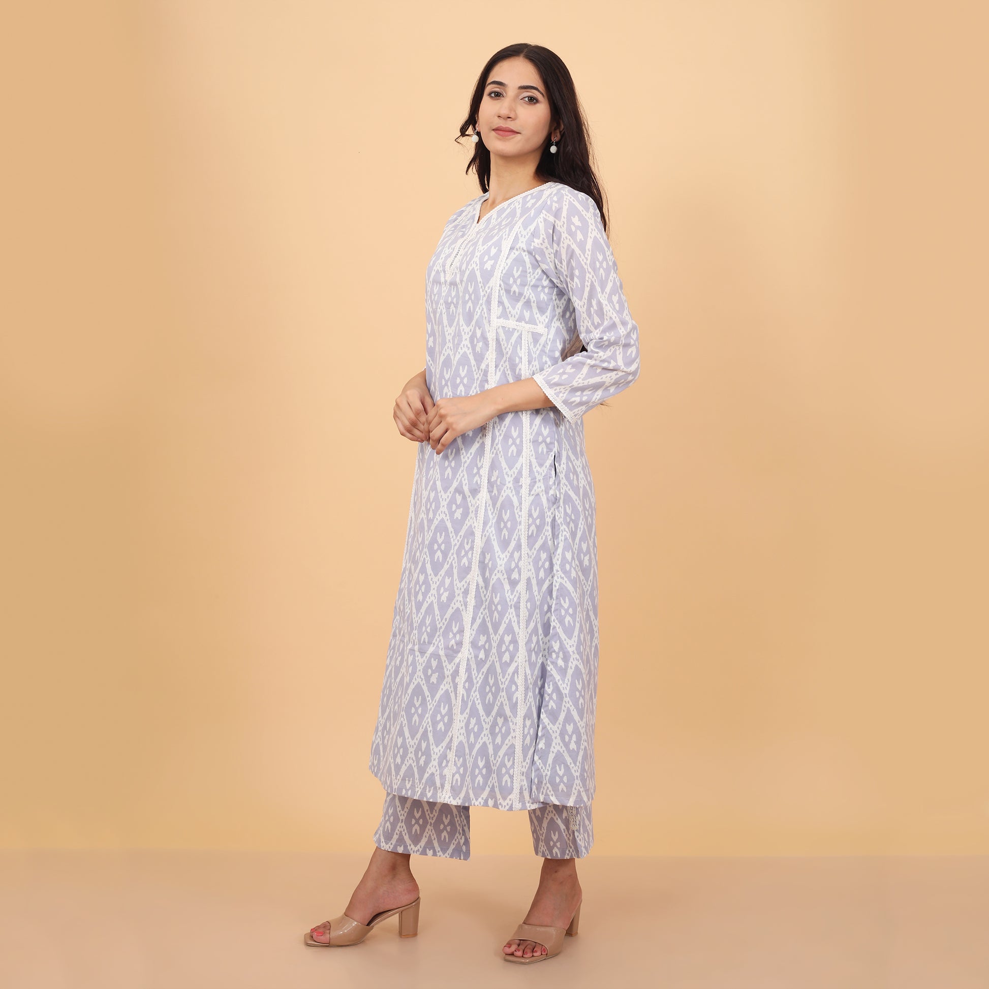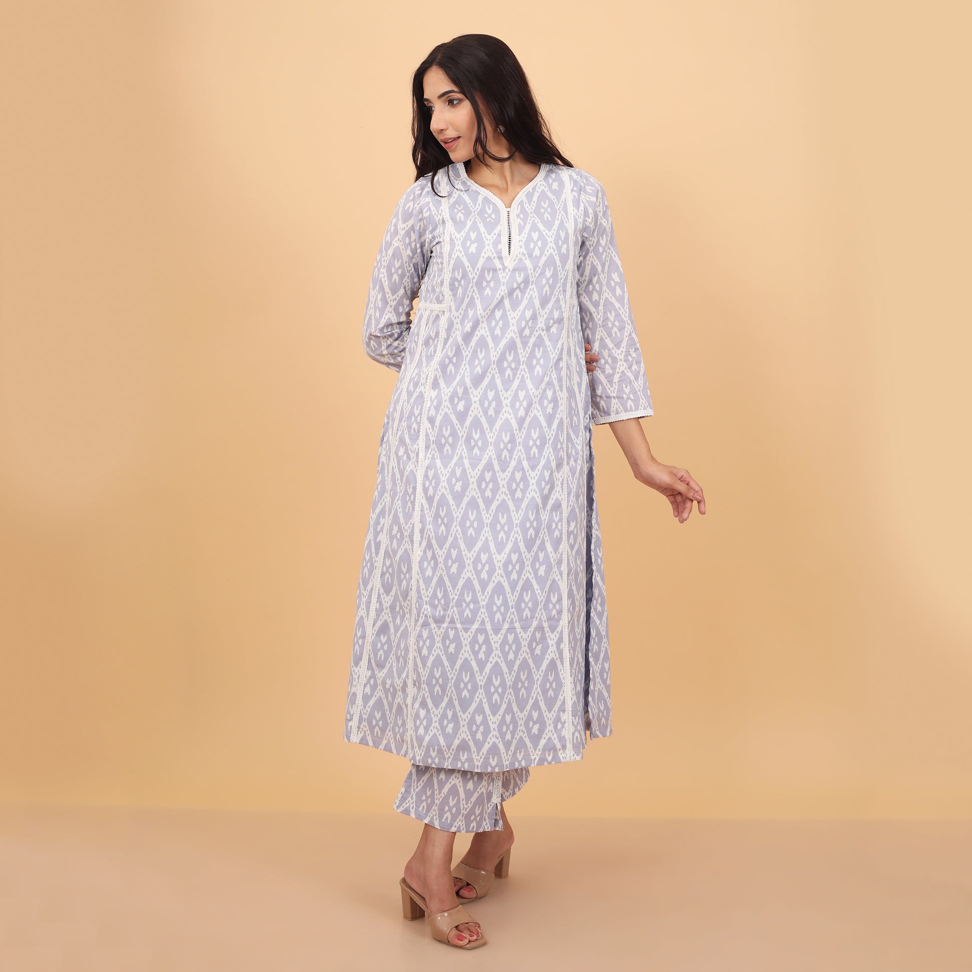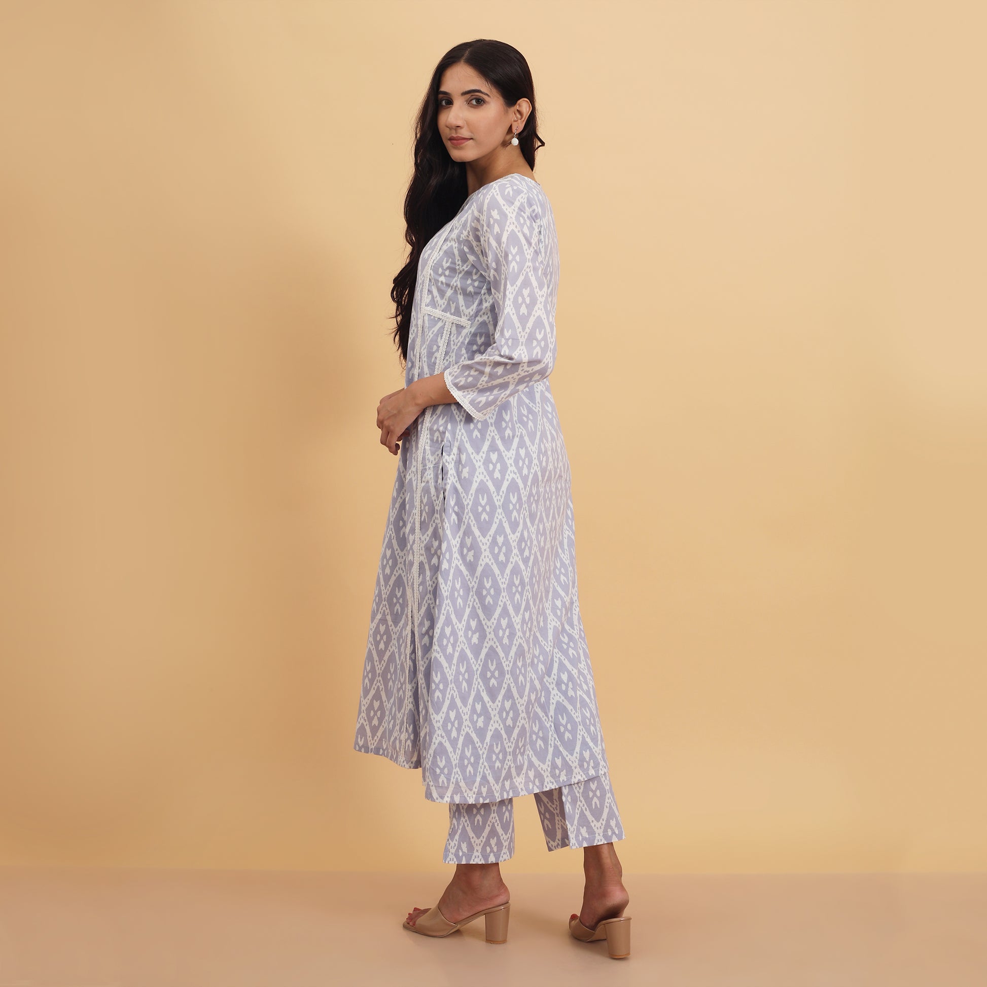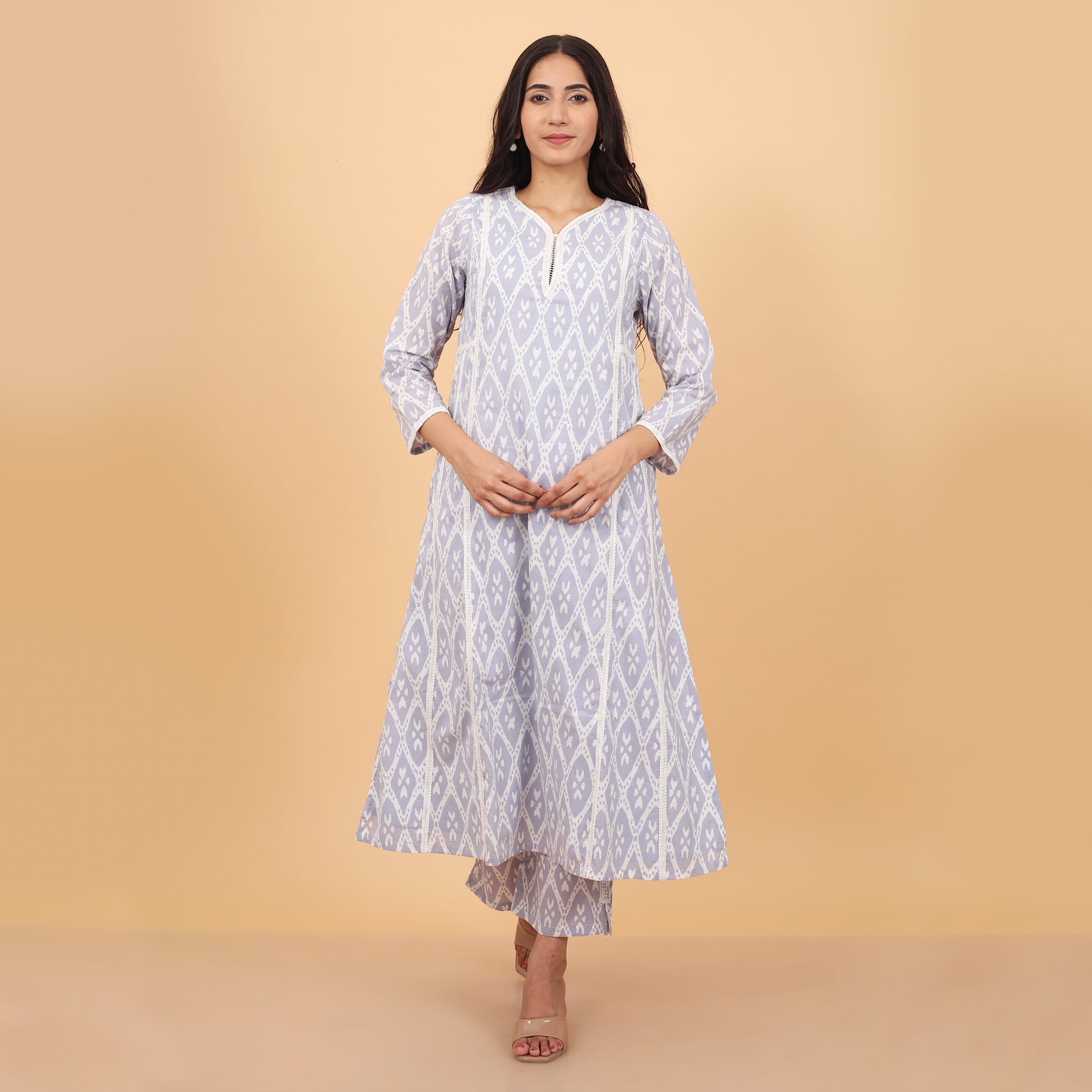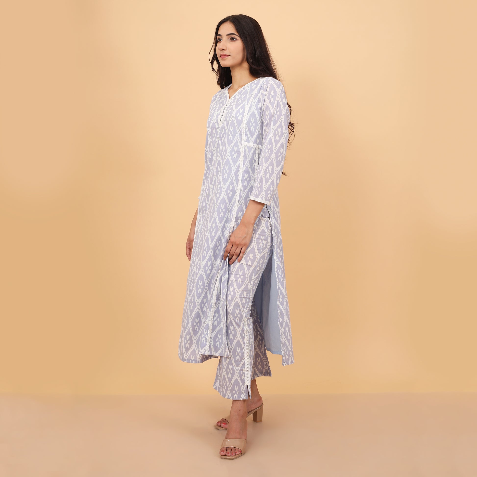 This Ekat cotton print kurta and pant set is designed with a sophisticated V-neck and full sleeves, offering both style and comfort. The intricate silk lace work adds a touch of luxury, while the soft cotton lining ensures a comfortable fit. Perfect for any occasion, this set is a blend of elegance and functionality.