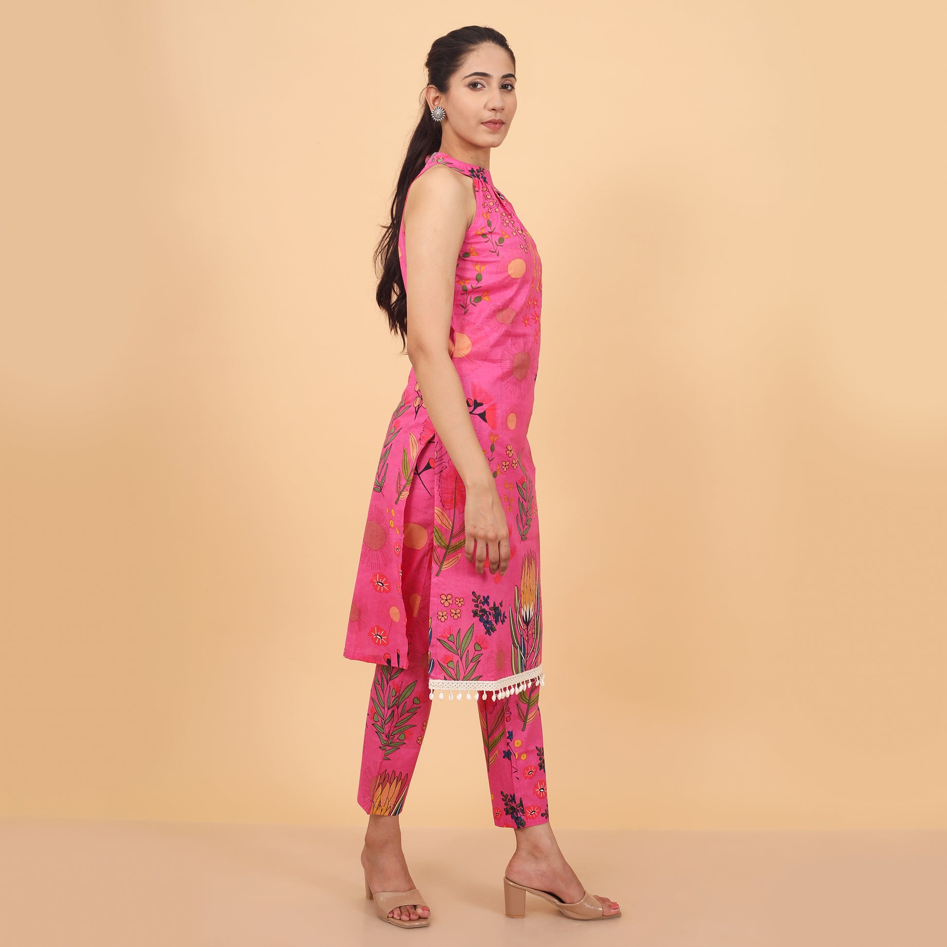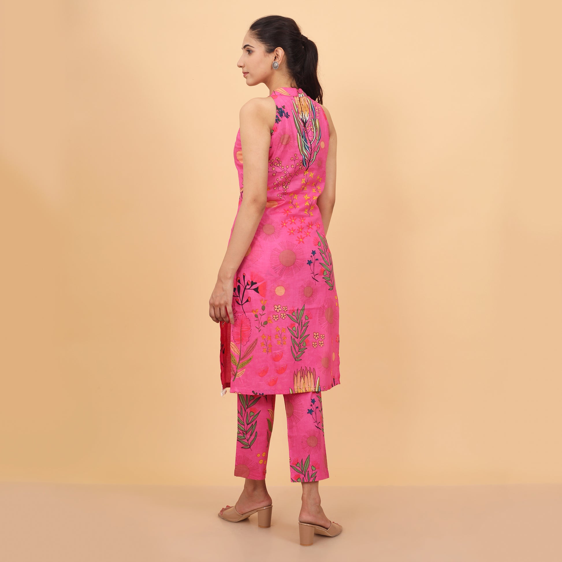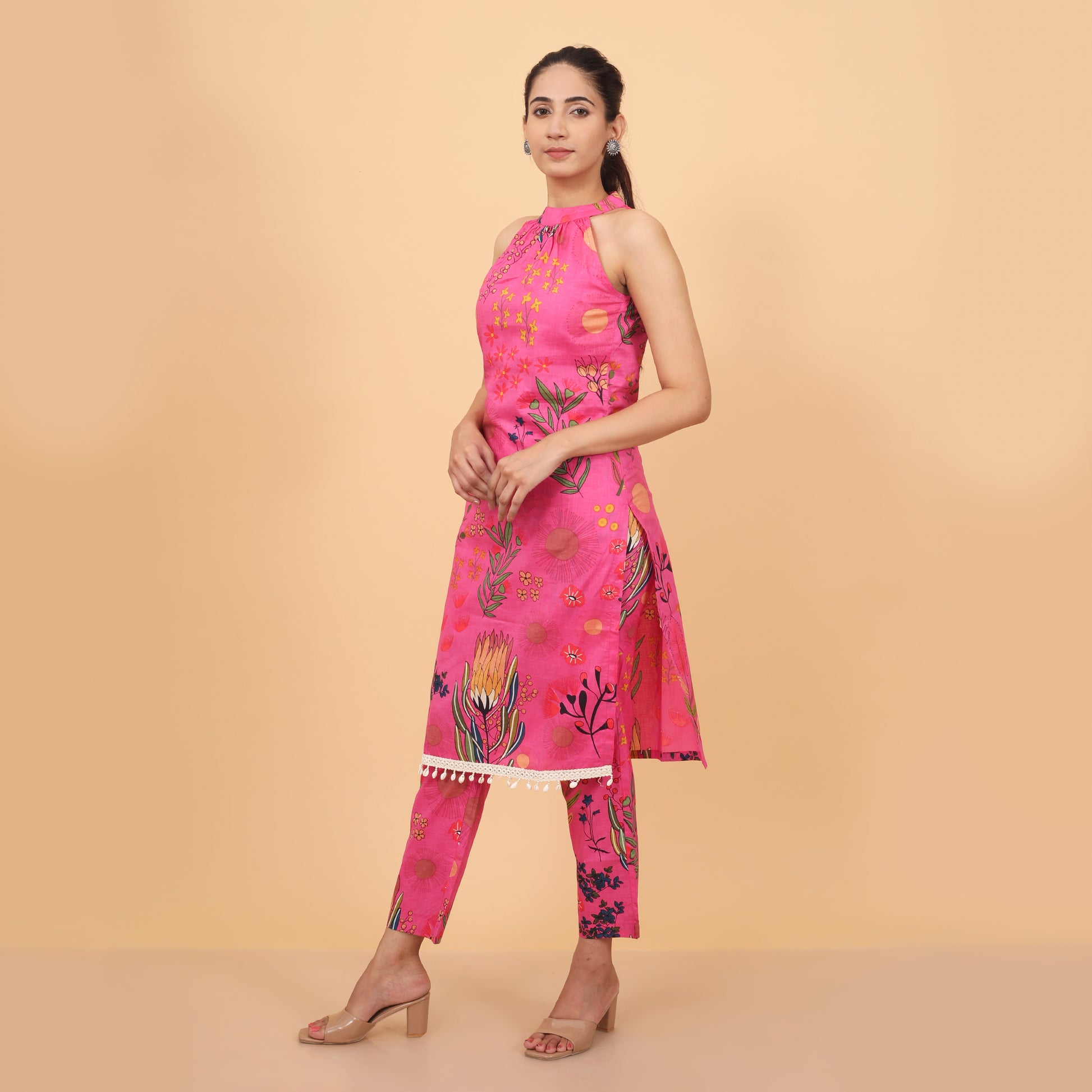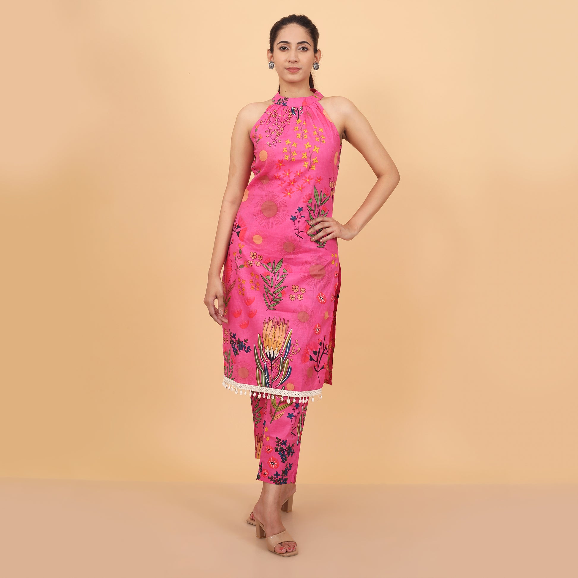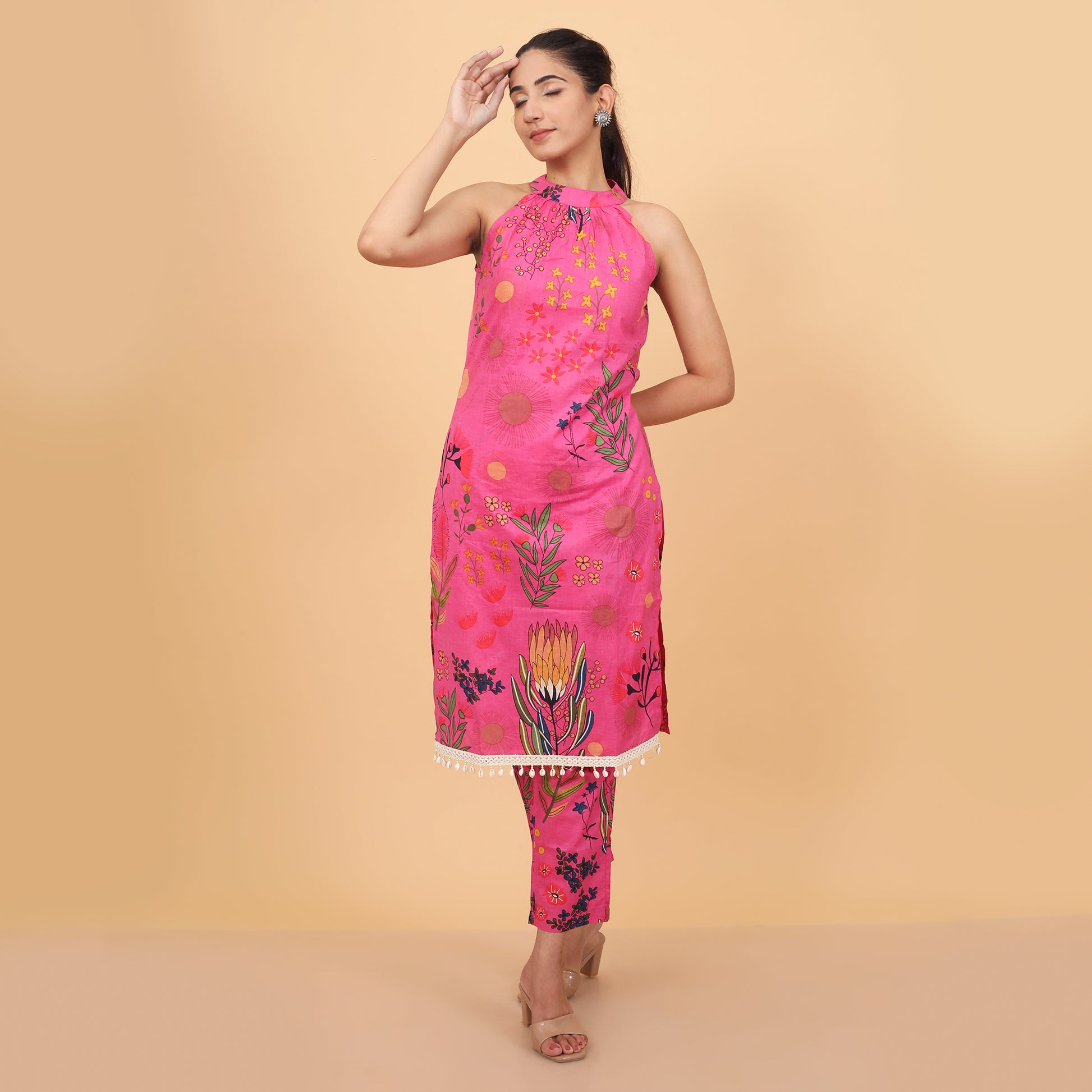This chic cotton halter neck kurta and pant set boasts a lively floral print and exquisite shell lace trim. Lightweight and breezy, it’s perfect for summer, blending casual elegance with a touch of bohemian flair.