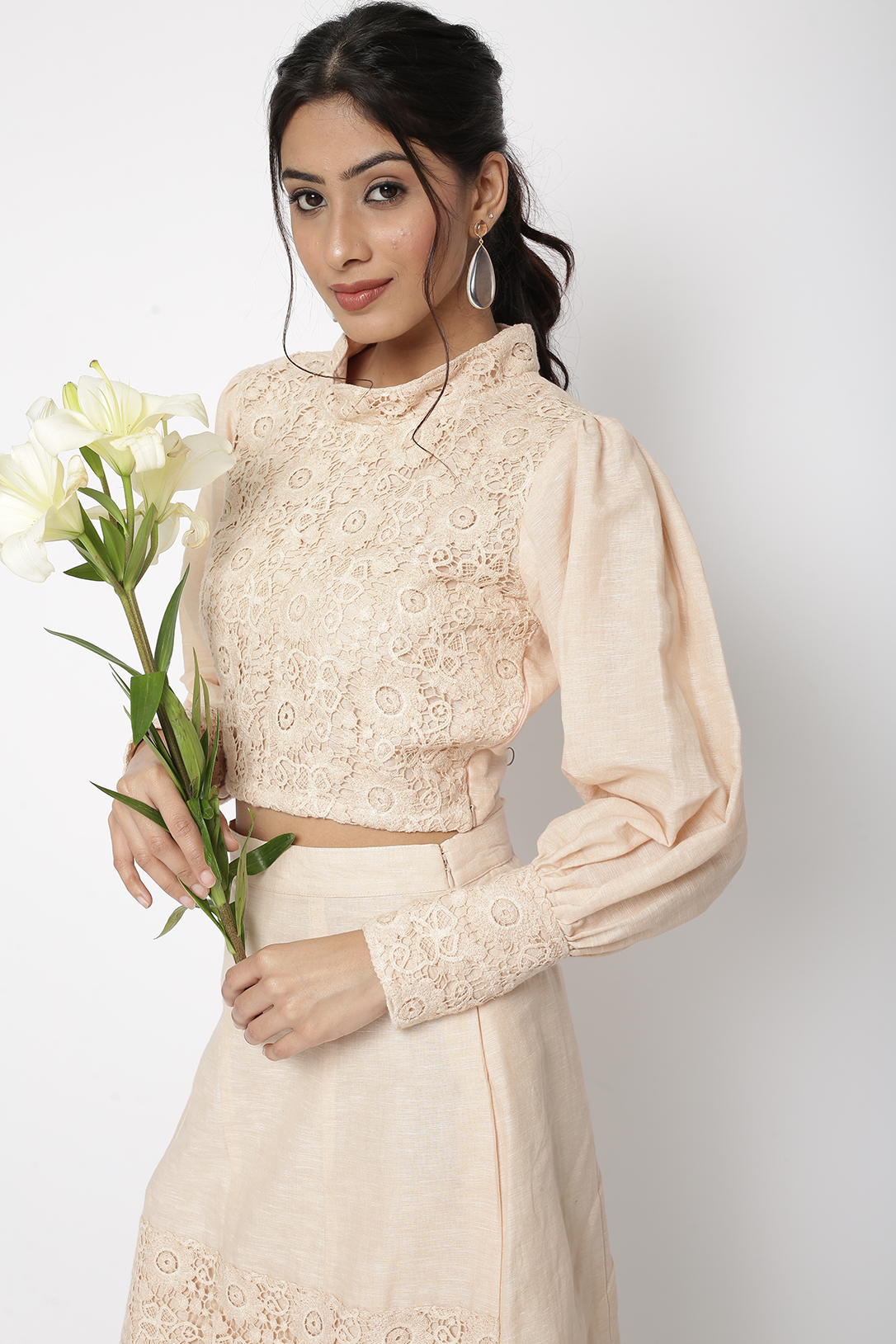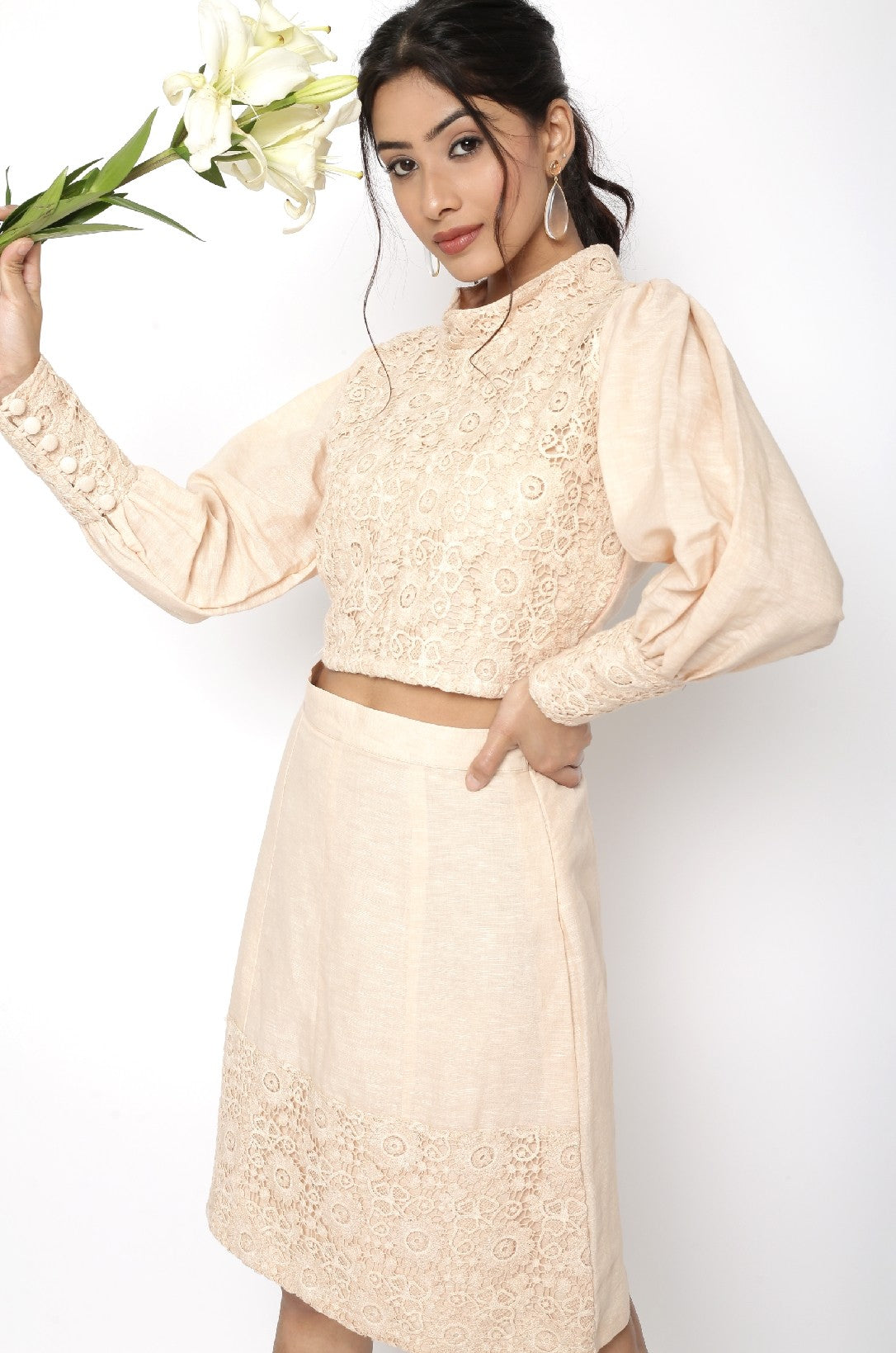 This pure linen cotton lace top boasts of turtle neck and balloon sleeves with cuff. Whereas the cotton linen skirt is designed with lace work at the bottom.