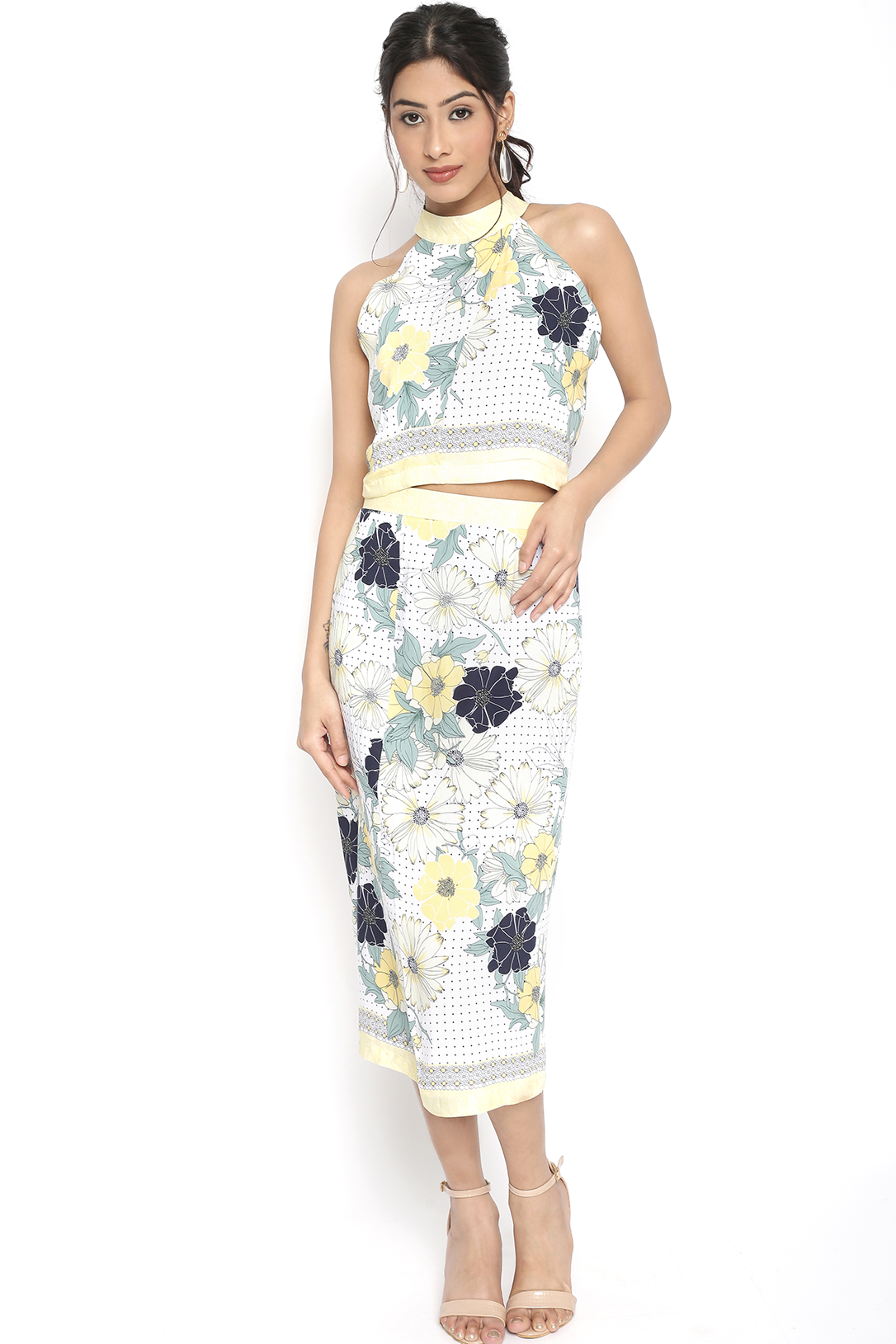 This white viscose floral co-ord set consists of a halter neck top and a midi skirt. The top has the style of flap at the front and back.ξ